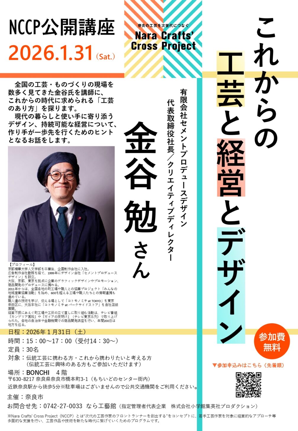 ※Nara Crafts’ Cross Project(NCCP)について:奈良市では、“次代の工芸作家のフロントランナーを創出する”をコンセプトに、若手工芸作家を対象に経営的なアプローチ等多面的な支援を展開する「Nara Crafts’ Cross Project」を令和4年度から行っています。本事業は、昨今の変化の激しい時代の中でも自分自身のビジョンや戦略を見据え、工芸作家を営む方々に対し、経営的なアプローチでの支援を通じて、工芸作品や技術を新たな時代に繋げていくための取組を行っています。工芸作家の販売戦略やブランディングについて学ぶ公開講座(参加無料)を開催します。