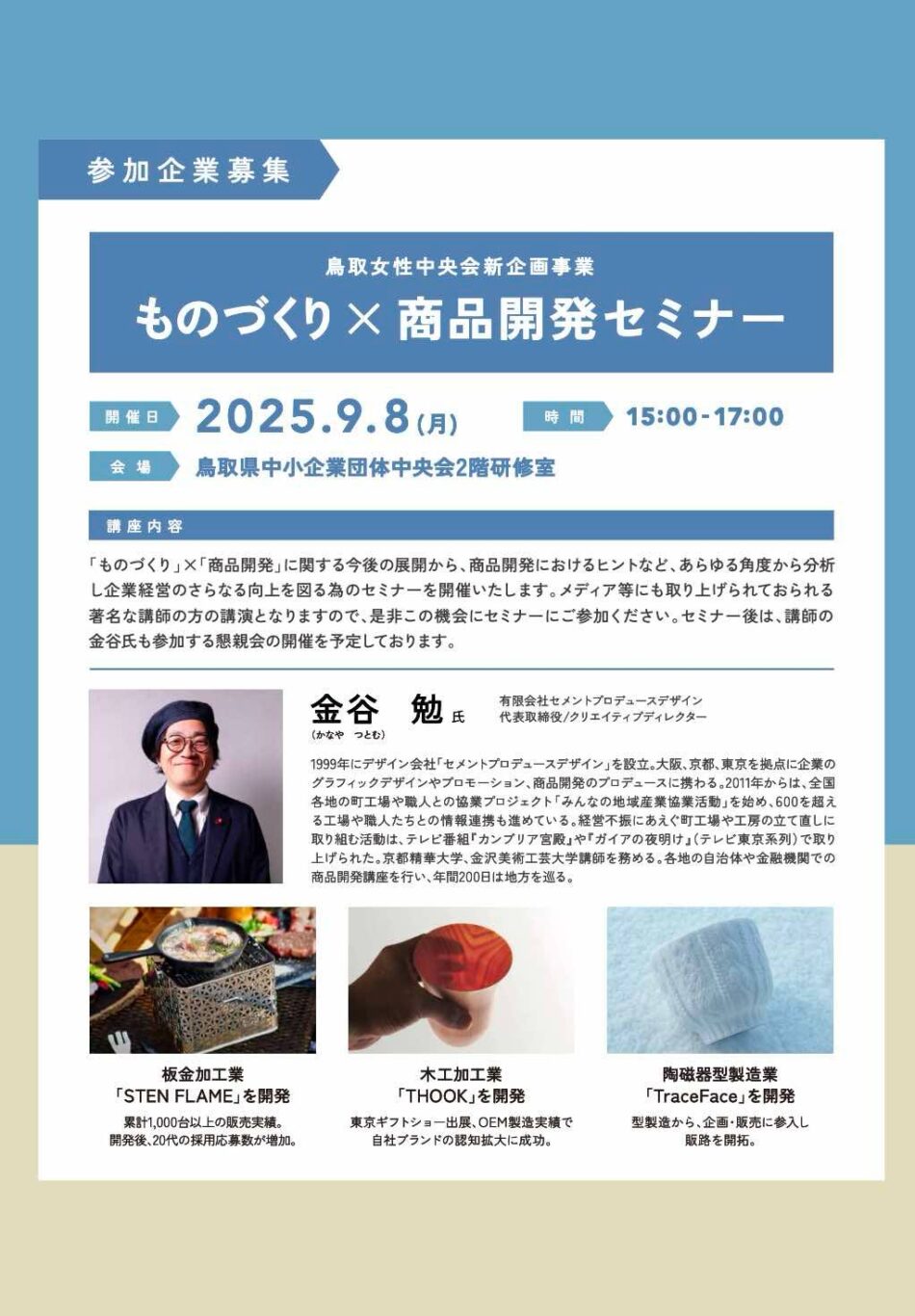 本講座は、「ものづくり」✕「商品開発」に関する今後の展開から、商品開発におけるヒントなど、あらゆる角度から分析し、企業経営のさらなる向上を図ることを目的としています。鳥取県でのセミナーは、初となりますので是非この機会に皆様の参加をお待ちしております。セミナー後は、金谷も参加する懇親会の開催を予定しております。