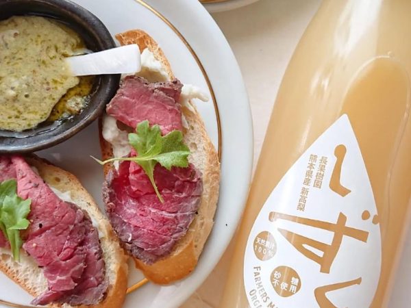 ・長果樹園:大牟田市でぶどうや梨などを栽培する果樹園です。今回は砂糖は一切使用せず、丸絞りならではの濃厚な味わいを楽しめる梨ジュース「しずく」を販売しました。