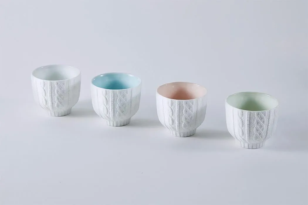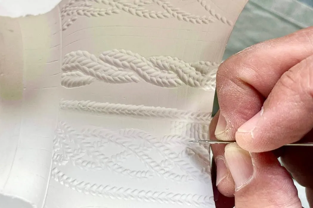 江戸時代より続く手彫りの技術をもつ職人が、ニットやラタンなど異素材の質感を陶器の表面に彫り込み、繊細な凹凸を再現。