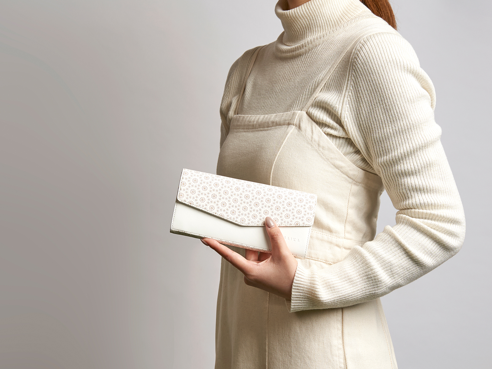 新たに開発したプロダクトは、ロングウォレット、カードケース、パスケースの3種類。カラーはホワイト、ネイビー、ブラックの3色を展開しています。これまでの甲州印伝とは異なり、現代のライフスタイルやファッションに自然と馴染むデザイン性に加え、機能性も追求。山梨県を代表する新しい印伝製品として誕生しました。