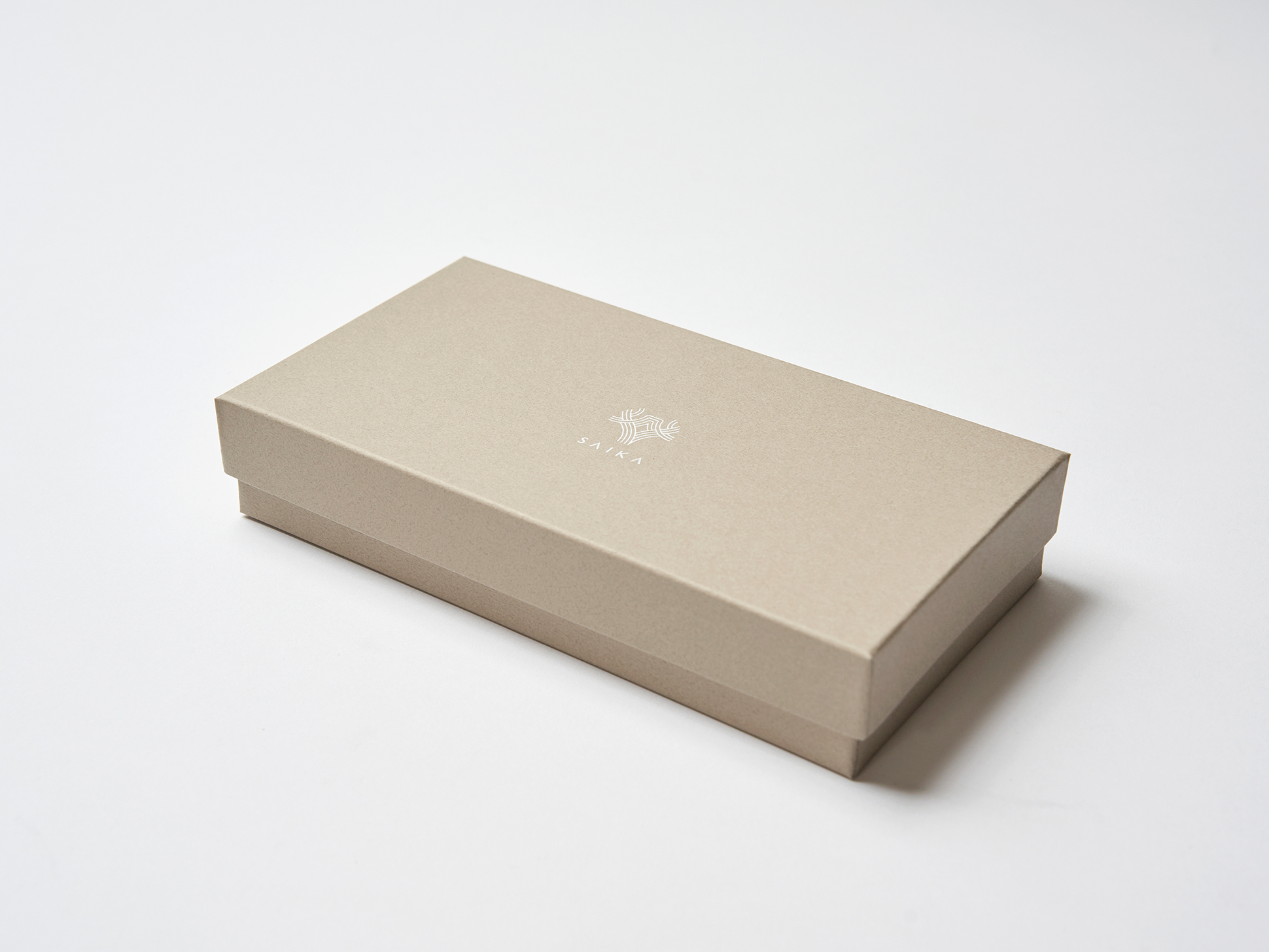 パッケージは、シンプルな貼り箱に白箔でロゴをあしらい、清潔感と上質さを表現しました。白く鞣した鹿革を用いた「SAIKA」の特徴を想起させるデザインとし、開封前からブランドの世界観を感じられる仕上がりとしています。