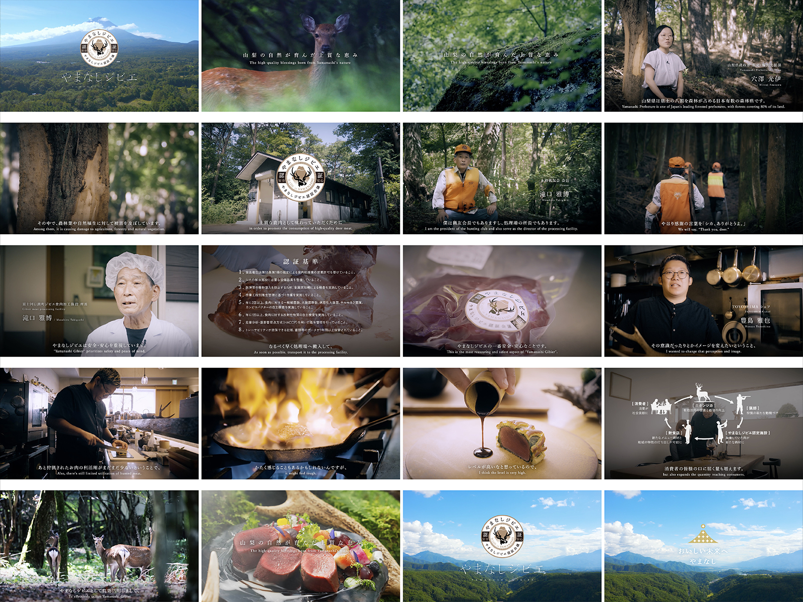 セメントプロデュースデザインは、この「やまなしジビエ認証制度」を一般の方々や飲食業関係者に広く知っていただくためのプロモーション活動を担当。動画制作、キービジュアル制作、フライヤー制作などのアートディレクションおよび企画立案・プロデュースを行いました。