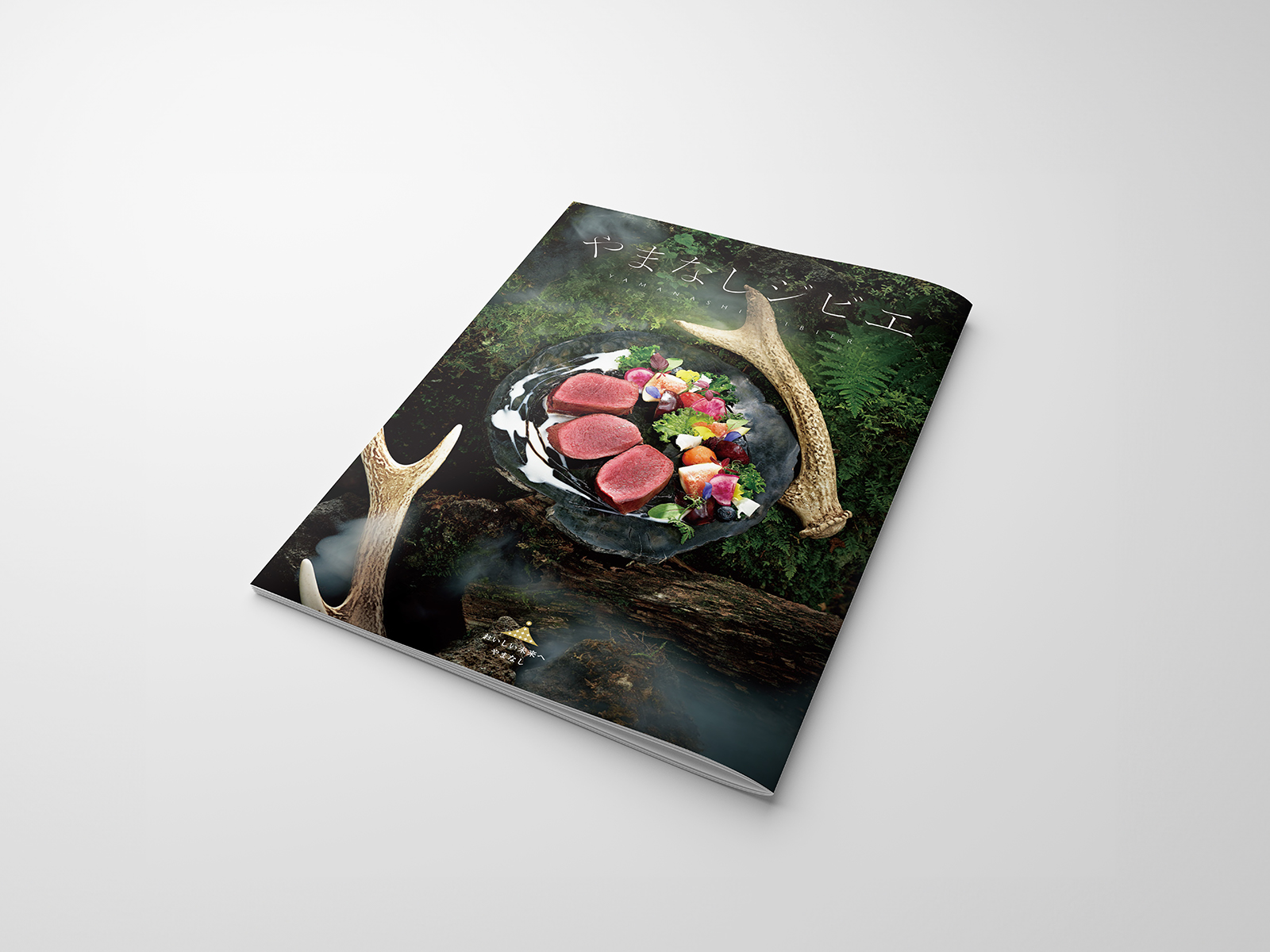 「やまなしジビエ」をより広く、わかりやすく伝えるために、プロモーションブックとフライヤーを制作しました。ブックでは、山梨県におけるニホンジカによる害獣被害の現状や、県が進める対策・認証制度の仕組みをビジュアルとともに整理し、やまなしジビエが“安心・安全な食材”であることを訴求しています。