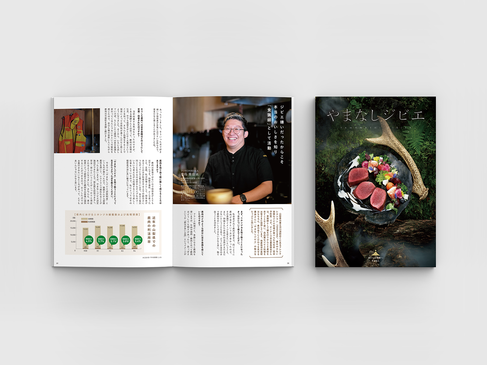 また、シェフによるインタビューページを設け、実際にやまなしジビエを取り扱う飲食店の声を紹介。ジビエに対して「臭みがある」「扱いが難しい」といったマイナスイメージを持つ飲食関係者や消費者に対し、現場のリアルな体験談を通してその魅力と可能性を伝える構成としました。