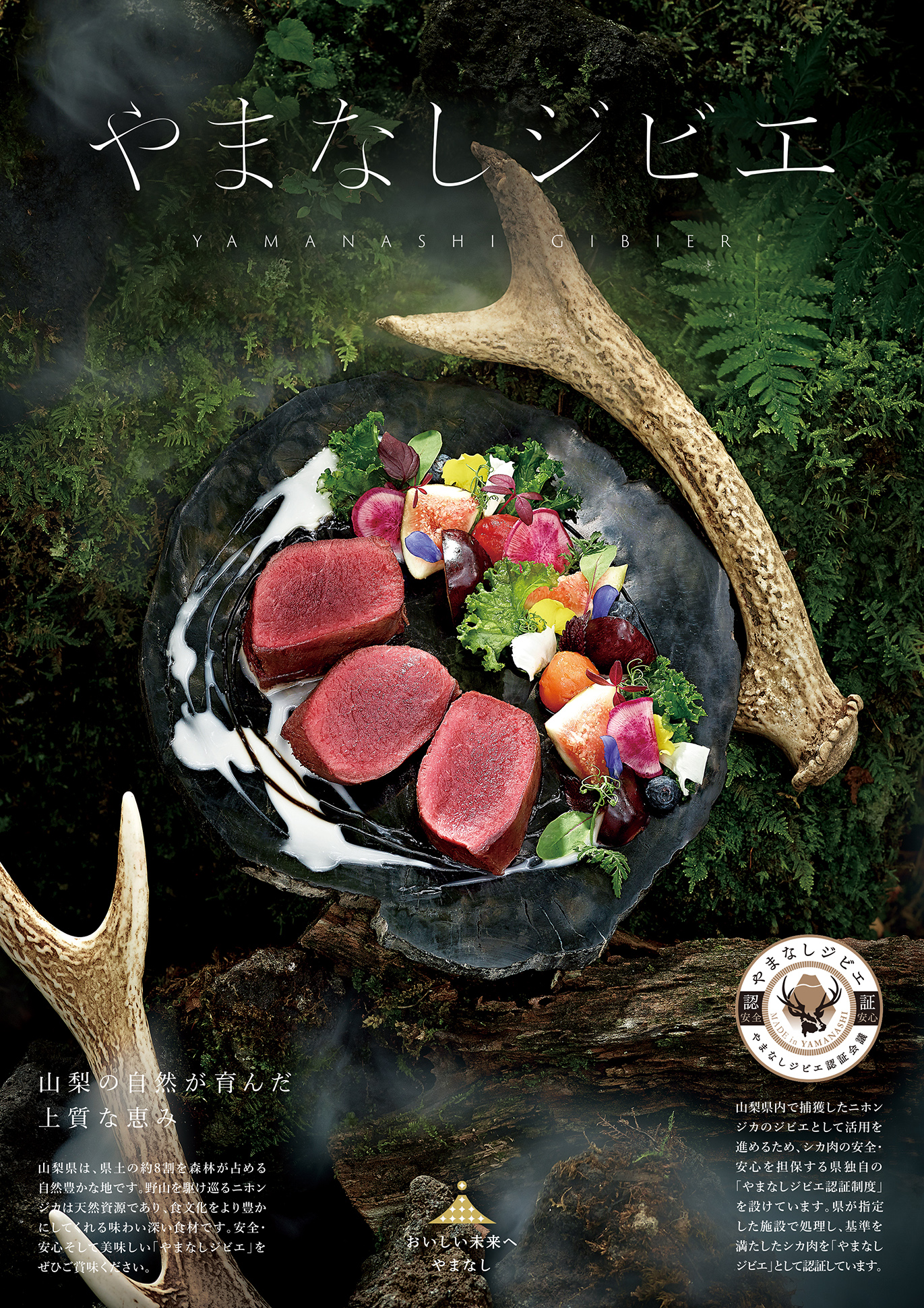 「やまなしジビエ認証制度」は、山梨県内で捕獲されたニホンジカの肉を衛生的かつ安全に処理し、信頼できるジビエとして提供するための県独自制度です。県が定める基準を満たす施設で加工された鹿肉のみが「やまなしジビエ」として認証され、消費者へ安心を届けます。