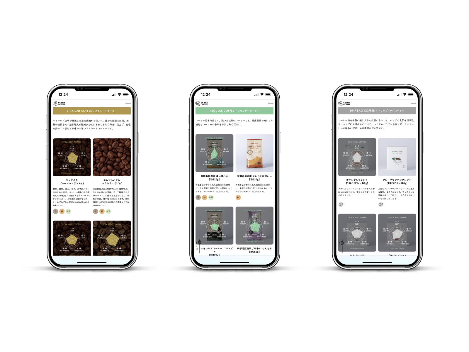 “ひと粒の豆に込めた誠実さ”をテーマに、清潔感と温かみのあるトーンで全体を構築。