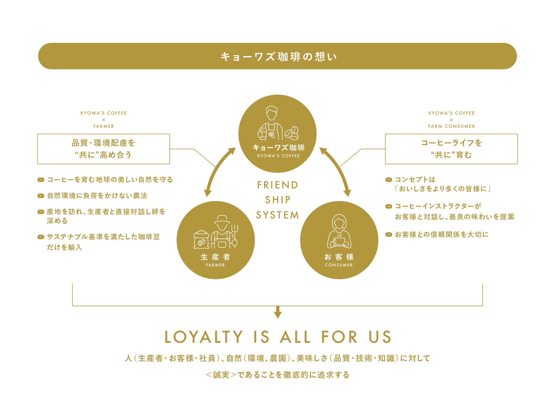 ブランドの核にある「LOYALTY=誠実さ」をテーマに、“ひと粒のコーヒー豆の品質と鮮度に徹底してこだわり続けることこそ誠実さであり、そこに揺るぎない自信と誇りがある”というグランドコンセプトを軸に構成しました。