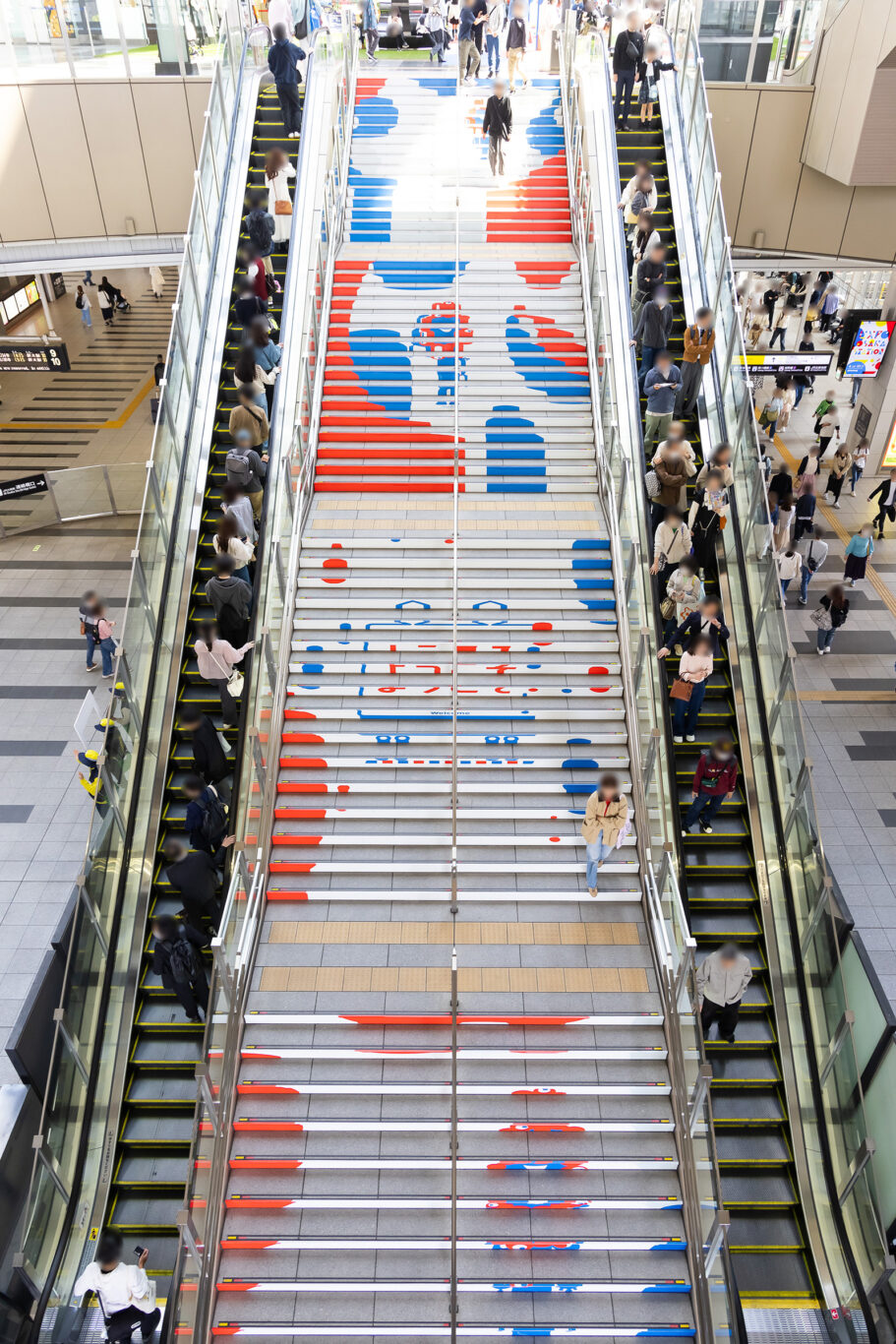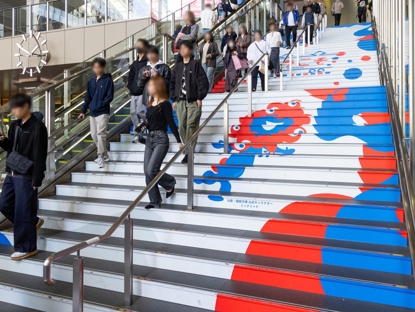 空間装飾では大阪駅を舞台に、万博の高揚感と世界への歓迎を体現するプロモーションを展開しました。会場へと続く大階段では、公式キャラクター「ミャクミャク」を大胆に訴求し、来場者を祝祭の空間へと誘導。会場内の柱には万国旗をあしらい、多様な国々から訪れる人々を祝福しながら迎え入れ、イベント参加への期待感を高めました。さらに、フラッグやデジタルサイネージもデザインし、駅全体を通じて一体感とワクワク感を演出。大阪駅から万博会場へと続く道のりそのものを、体験の一部として楽しんでいただけるようにしました。
