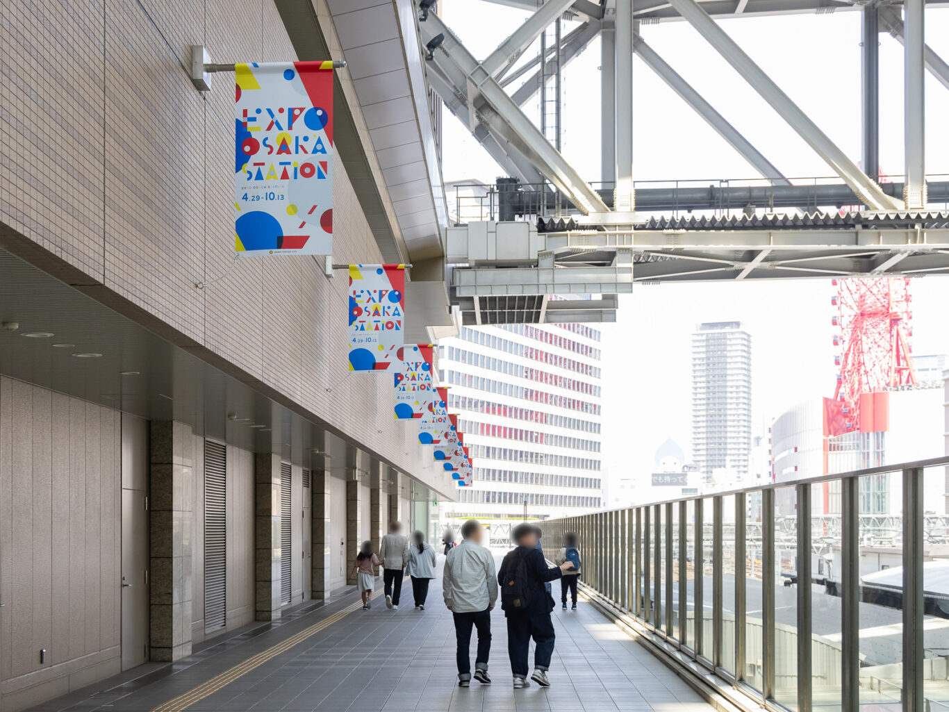 「つながり、ひろがり、彩りある未来へ」をテーマに2025年4月29日、大阪・関西の玄関口である大阪駅に万博サテライト会場に“EXPO OSAKA STATION”が開幕しました。開催期間中は、大阪夢洲の万博と共にサテライト会場ならではのイベントを通して、訪れる皆さまに万博の魅力を発信します。弊社では本プロモーションのロゴ、ビジュアル、空間デザインに携わらせていただきました。ロゴでは子供でも親しみのある丸、三角、四角をベースにしたタイポグラフィで形の面白さ、様々なモチーフが重なりあうことで、生まれる、「ひろがり」「つながり」を表現しました。広場全体のグラフィックも連動感のあるデザインとし、来場する皆さんを華やかに迎えます。