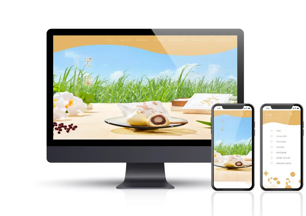 「光星」のデザインイメージが伝わるよう、パッケージのグラフィックで全体を構成しました。開発ストーリーや活用シーン、おすすめの食べ方などを盛り込み、饅頭の魅力を視覚的に表現しました。特設サイトなどに使用するキービジュアルでは、沖縄県在住のカメラマンさんにご依頼し、さとうきび畑と青空を背景に、沖縄の自然豊かな原風景を作り込みました。