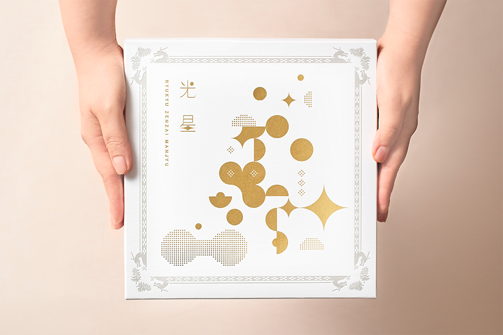 あんこと餅が包まれた、饅頭の多面的な魅力を幾何学的なグラフィックで表し、沖縄の美しい海を越えて煌めきが広がるイメージで全体に箔押しを施しました。四方の枠には琉球王朝時代から伝わるミンサー柄や龍、デイゴの花をエンボス加工であしらい、新たな琉球菓子として末長く愛されるお菓子になるようにという祈りが込められています。