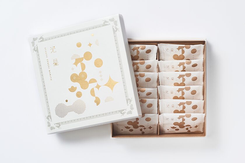 饅頭の上に金箔が飾り付けられた輝く星の様な見た目と、作り手の名前から一字取り「光星」と名付け、星をあしらったシンプルで上品なデザインに仕上げました。