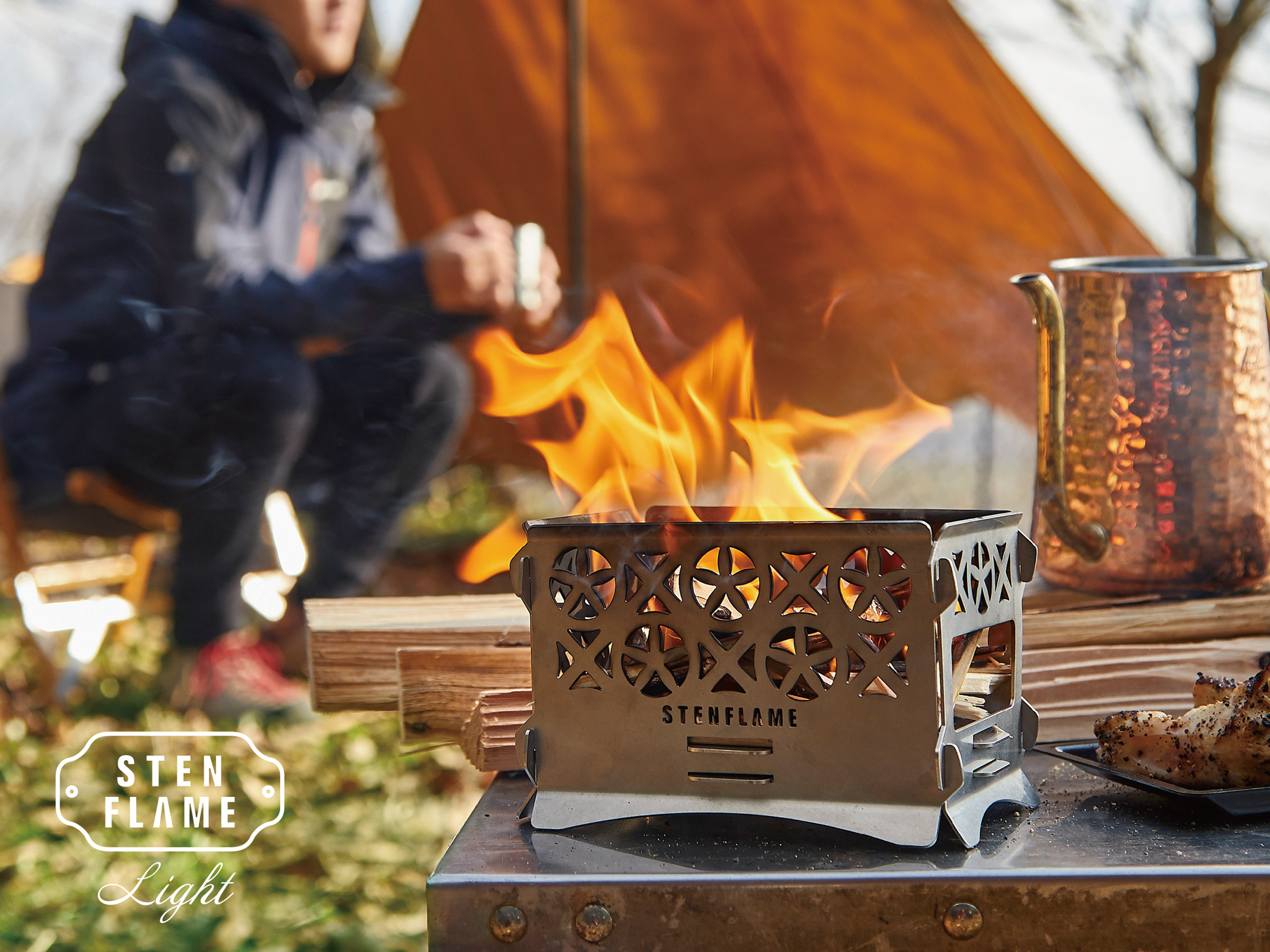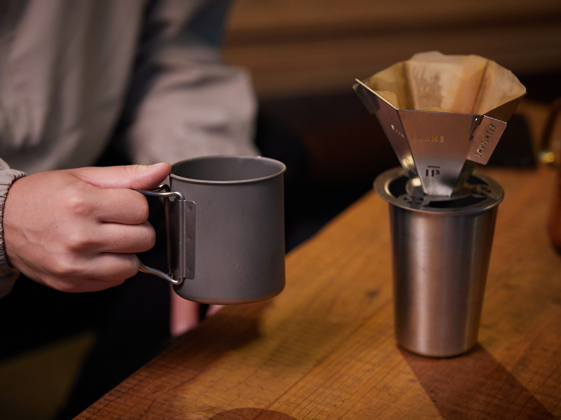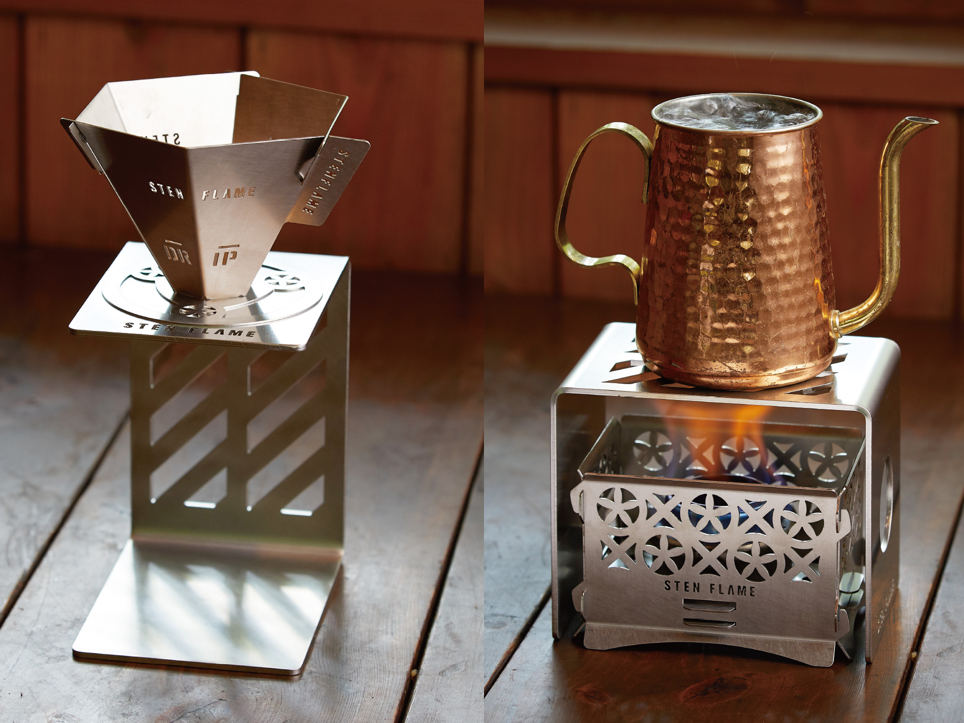 さらに専用のドリッパースタンドを用意。安定した抽出を実現するほか、横に回転させれば第二弾のミニ焚き火台がすっぽり収まり、簡易コンロとしても使える多機能性を備えます。焚き火で過ごす時間の締めくくりに、あるいは室内での日常の一杯にも寄り添う、実用性と美味しさを両立したプロダクトです。