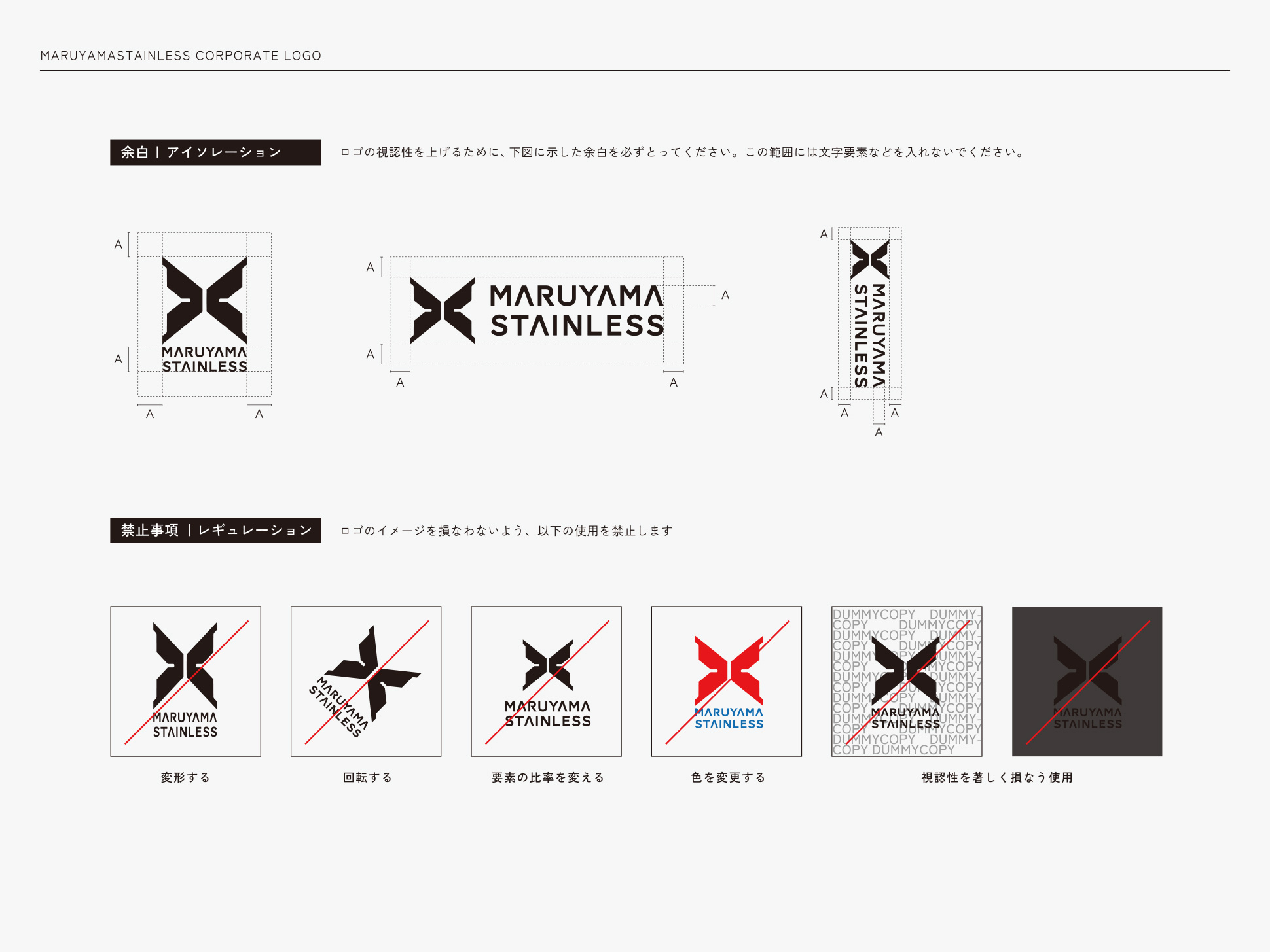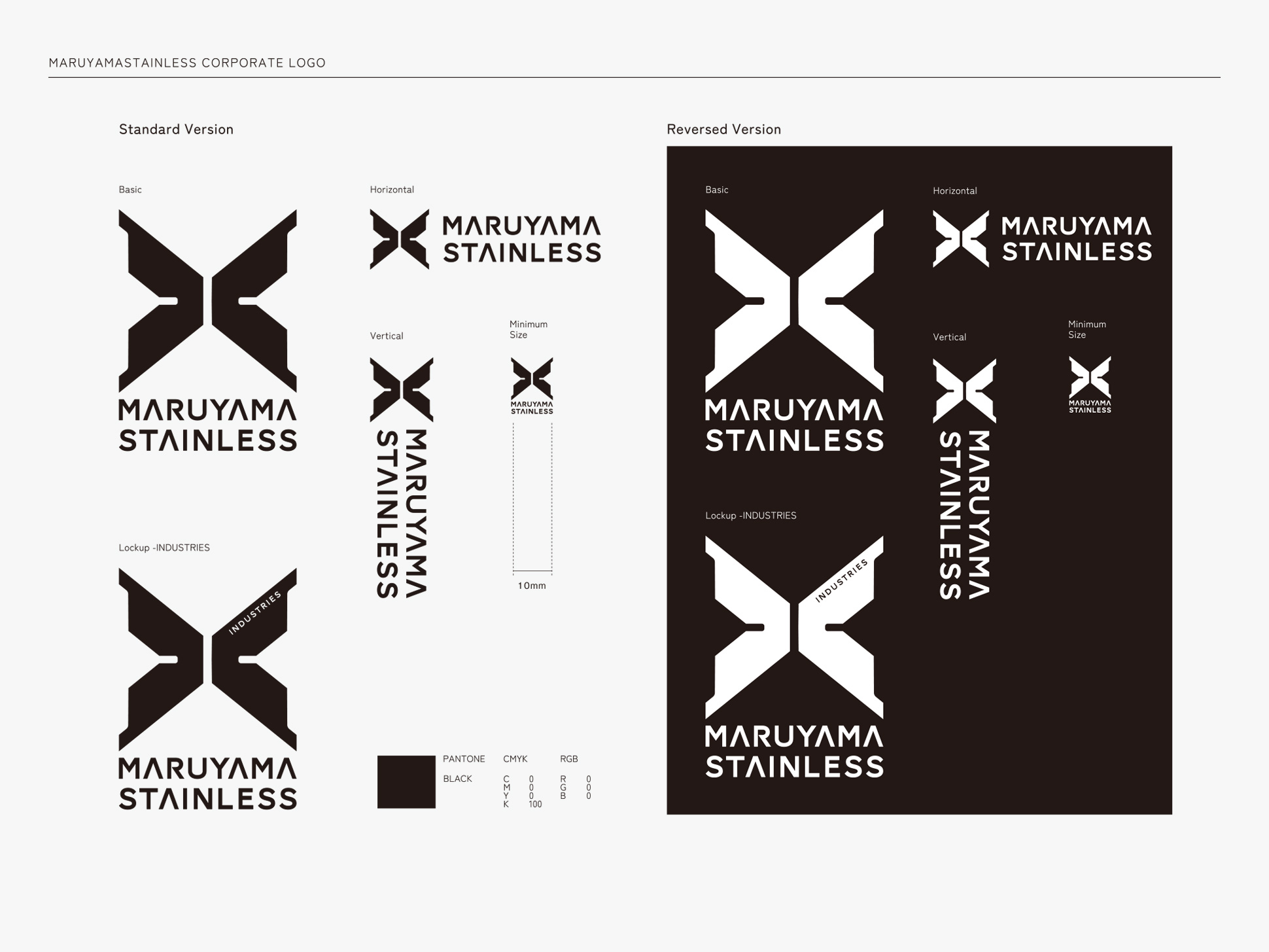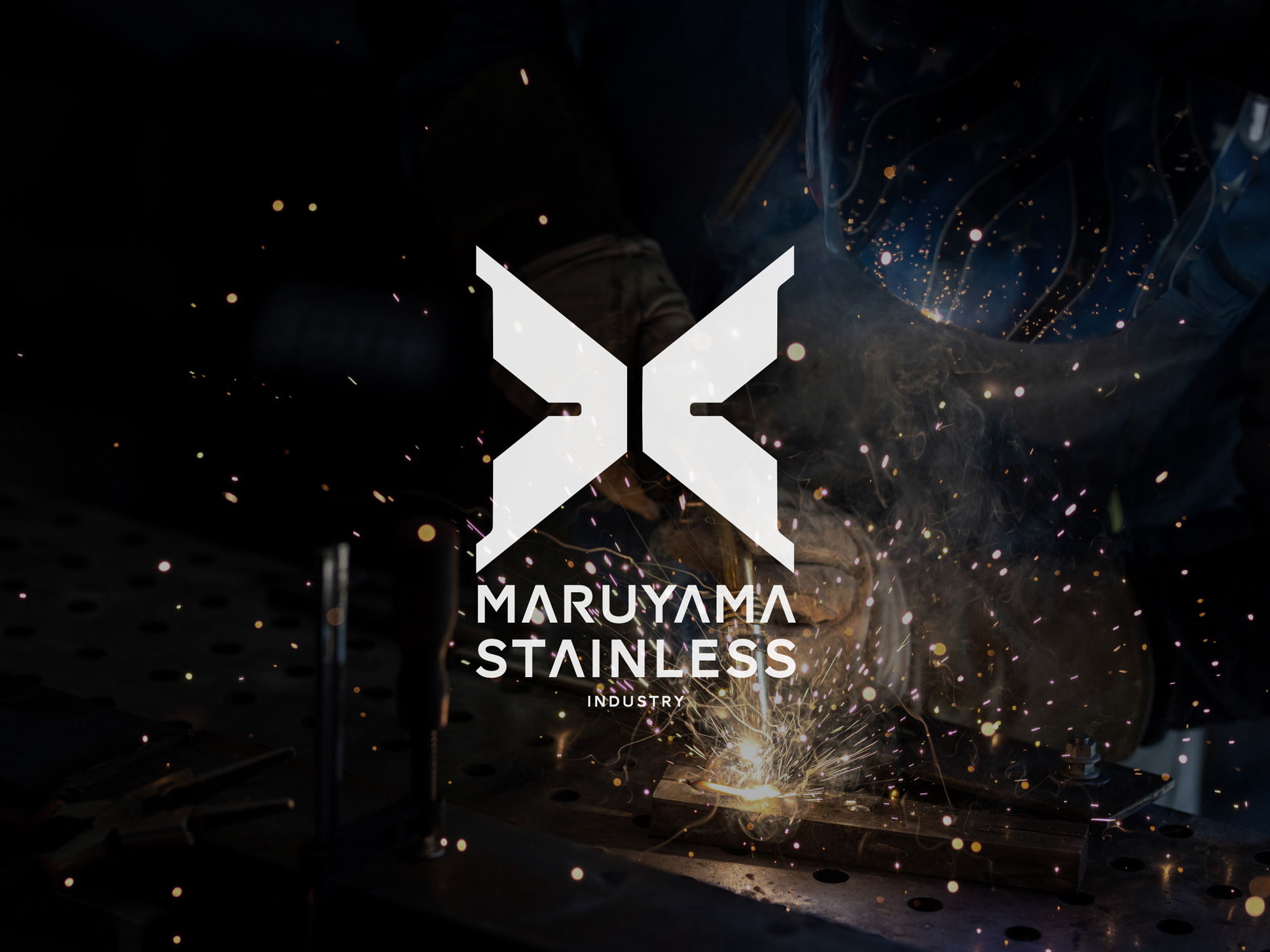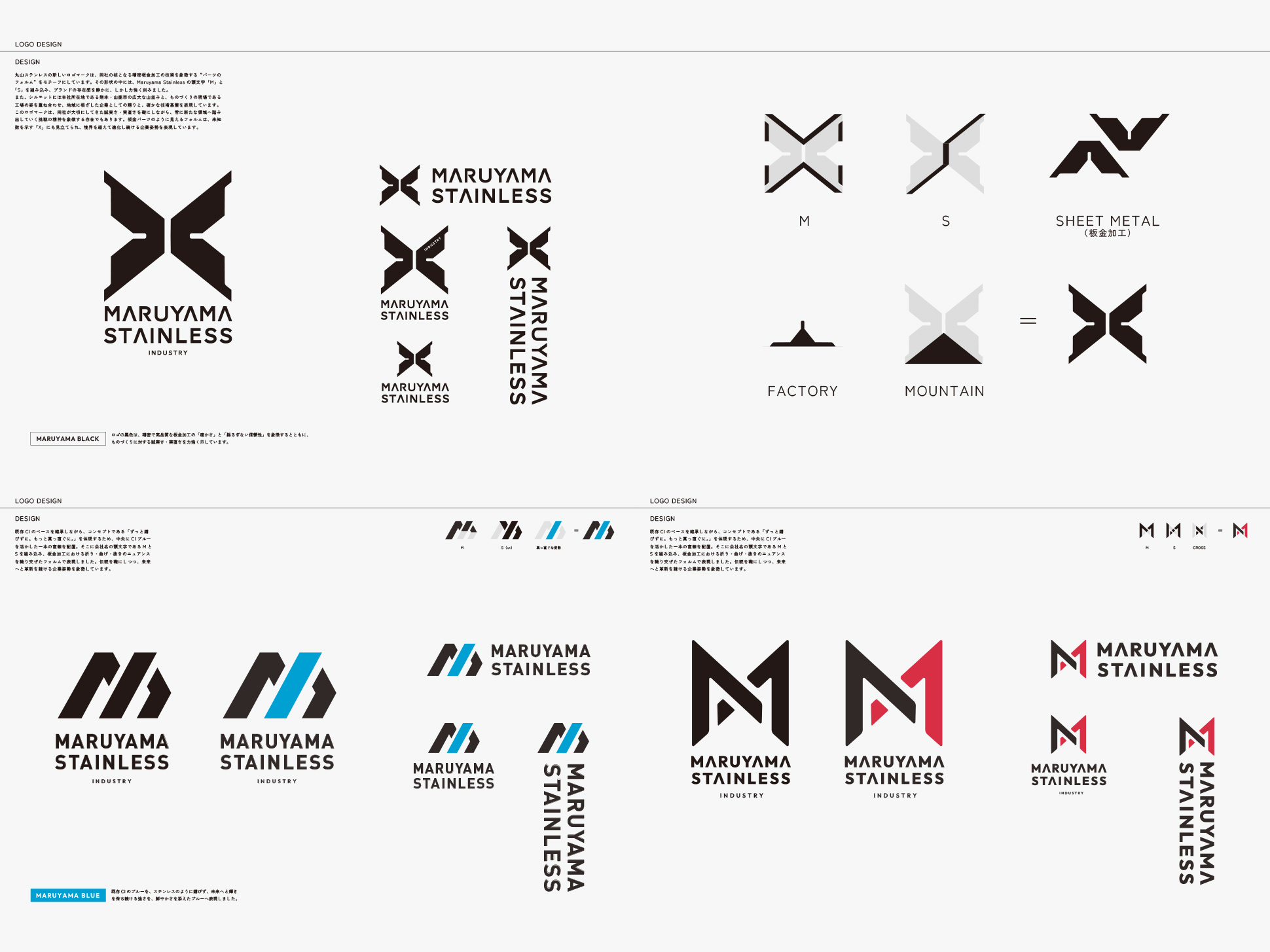 メッセージ策定と並行して、ブランドの象徴となるロゴデザインも開発しました。新しいロゴは、同社の核である精密板金加工の技術を象徴する“パーツのフォルム”をモチーフにしつつ、Maruyama Stainless の頭文字を内包した構造としています。さらに、シルエットには本社所在地・山鹿市の山並みと工場の姿を重ね、地域に根ざした技術基盤と誇りを表現しました。また、このフォルムは未知数を示す「X」にも重なり、境界を超えて進化し続ける企業姿勢を象徴しています。ロゴカラーも刷新「MARUYAMA BLACK」とし、精密で高品質な板金加工を支えてきた“確かさ”と“揺るがぬ信頼”の象徴。誠実さ・実直さを礎にしながら、新たな領域へ挑む姿勢を体現するデザインとなりました。