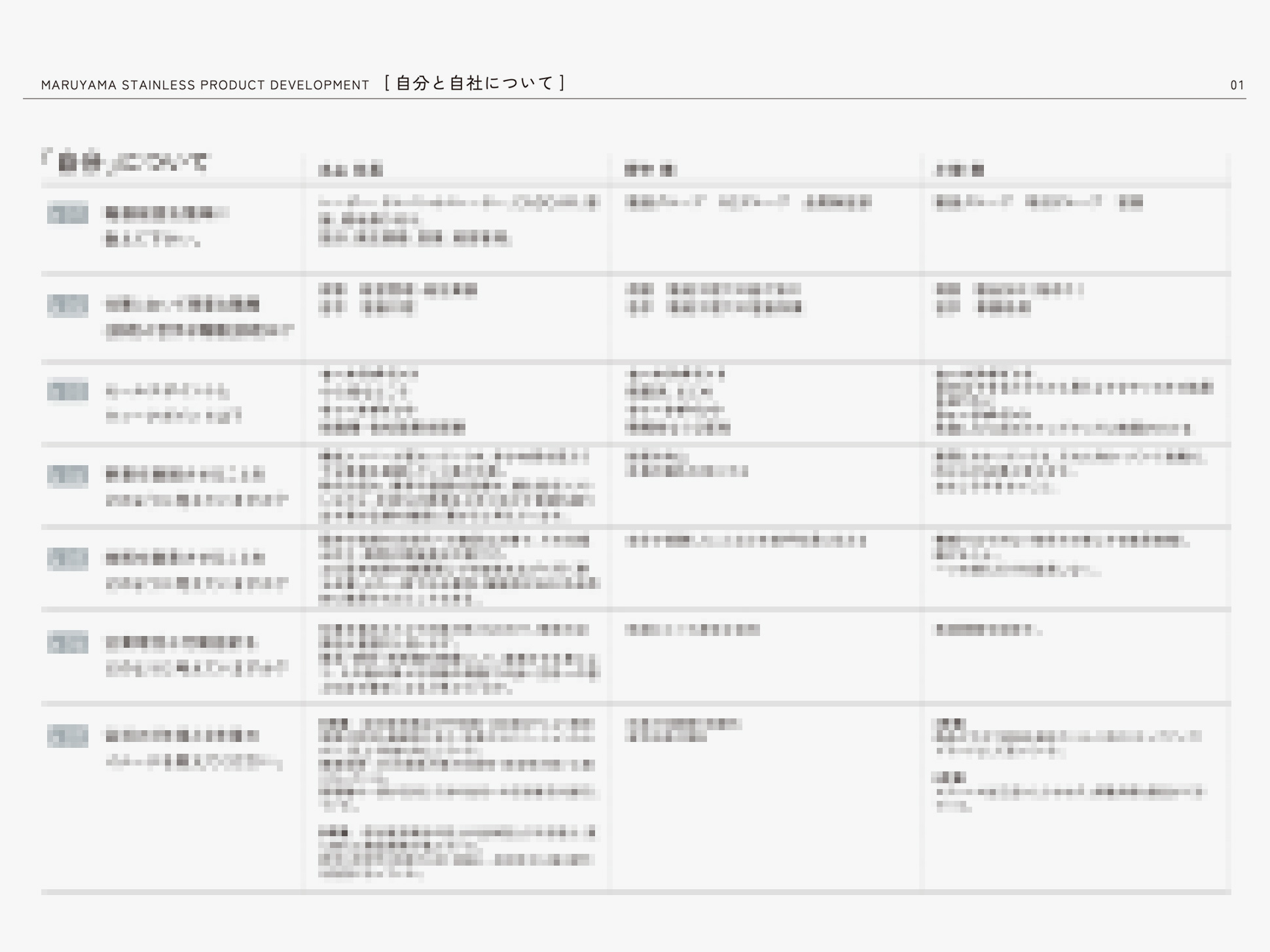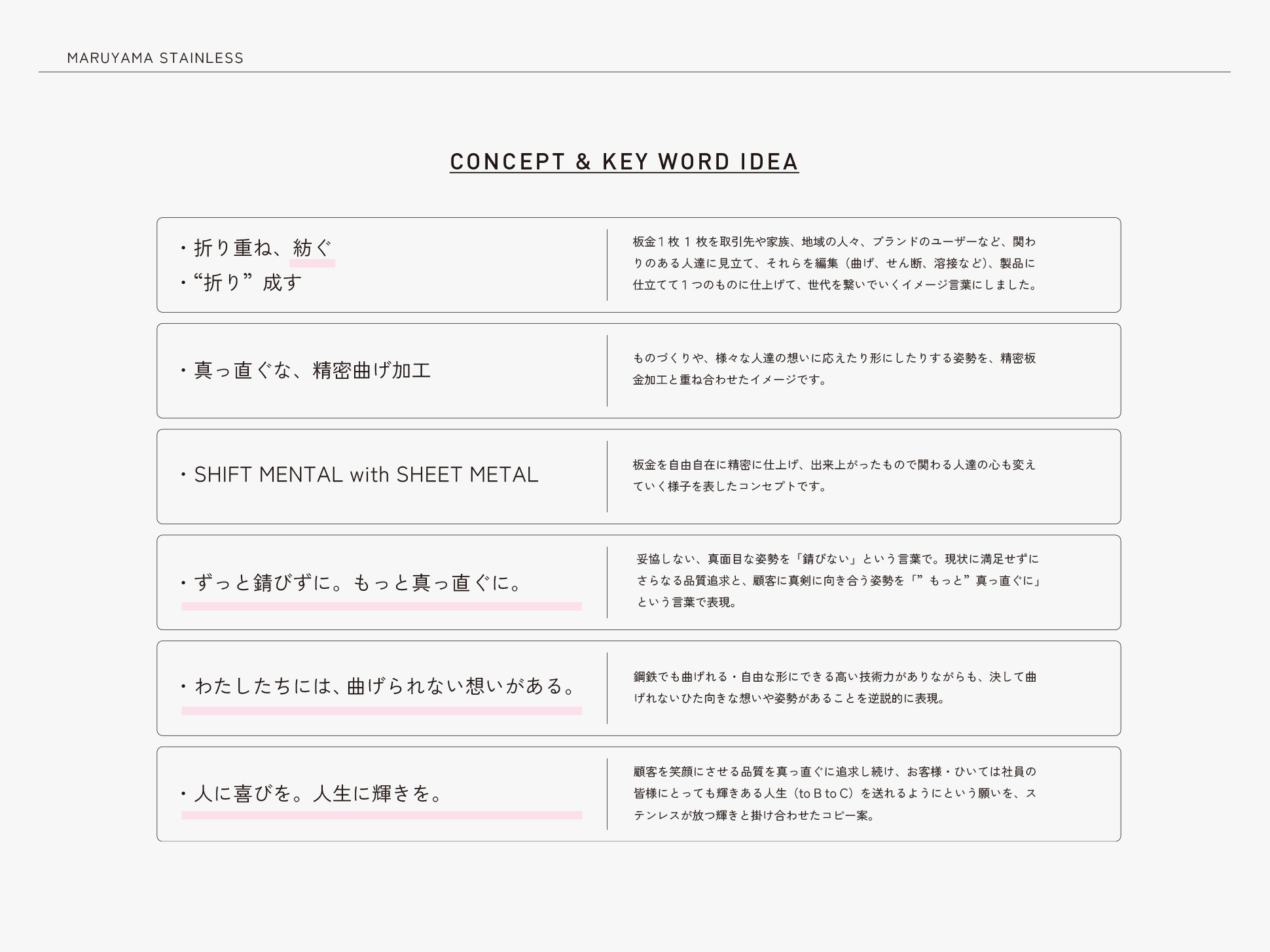 同社のコーポレートブランディングを進めるにあたり、まず取り組んだのは、社内スタッフとともに「自社を象徴するキーワード」を改めて洗い出すことでした。壁打ちを重ねる中で浮かび上がってきたのは、ものづくりに真摯に向き合うまっすぐな姿勢と、現状に甘んじることなく未来へ挑み続ける意志。この価値観こそが同社の原動力であり、長年受け継がれてきた文化であることを再確認しました。