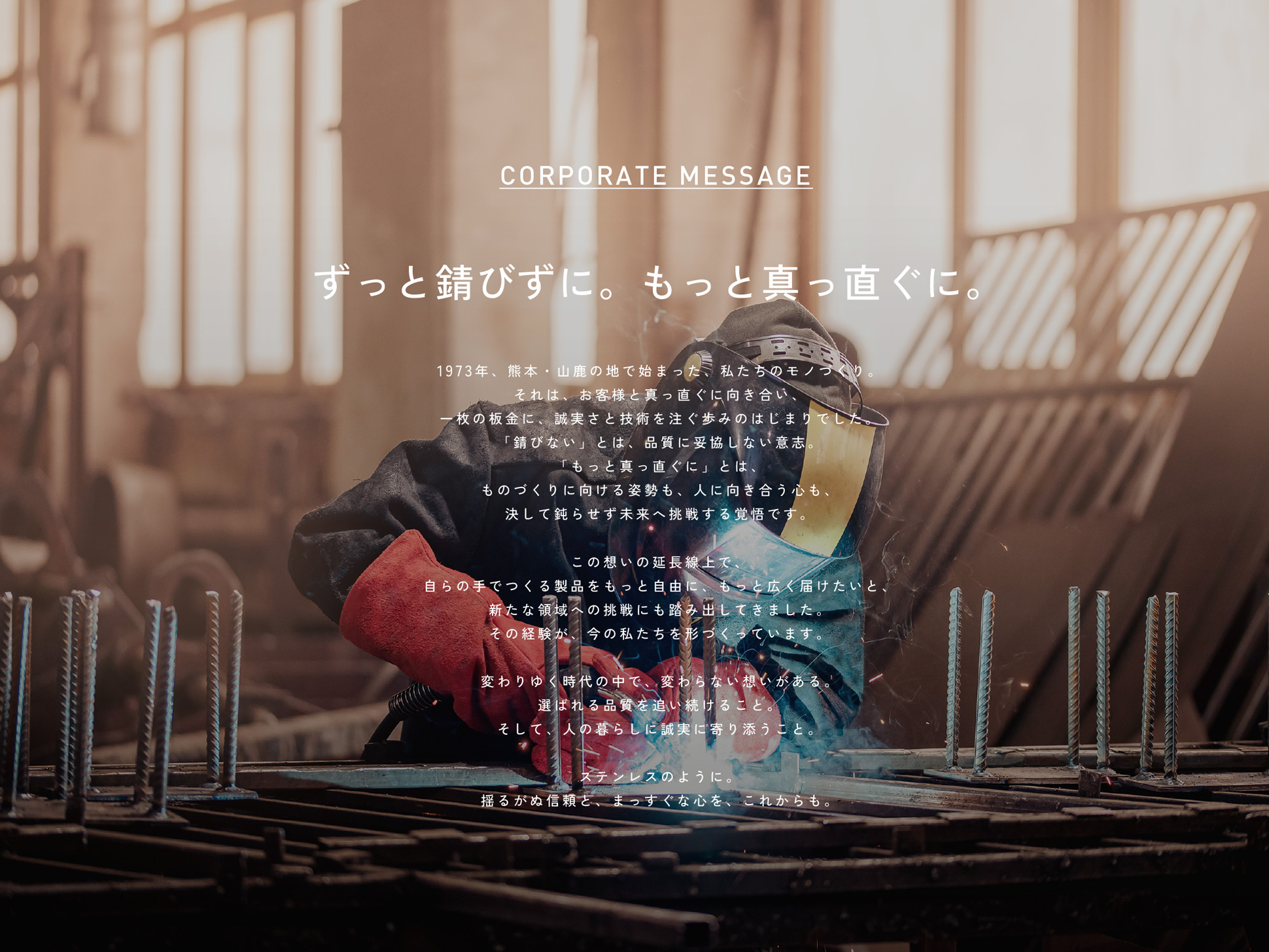 この核となる想いを言葉として結晶化させたのが、今回のコーポレートメッセージです。CORPORATE MESSAGE「ずっと錆びずに。もっと真っ直ぐに。」 創業の地・熊本県山鹿市で1973年から続く歩みの中で育まれてきた、「錆びない品質への意志」と「より良い未来へ真っ直ぐ進む姿勢」を、端的かつ力強く表現した言葉として採用しました。