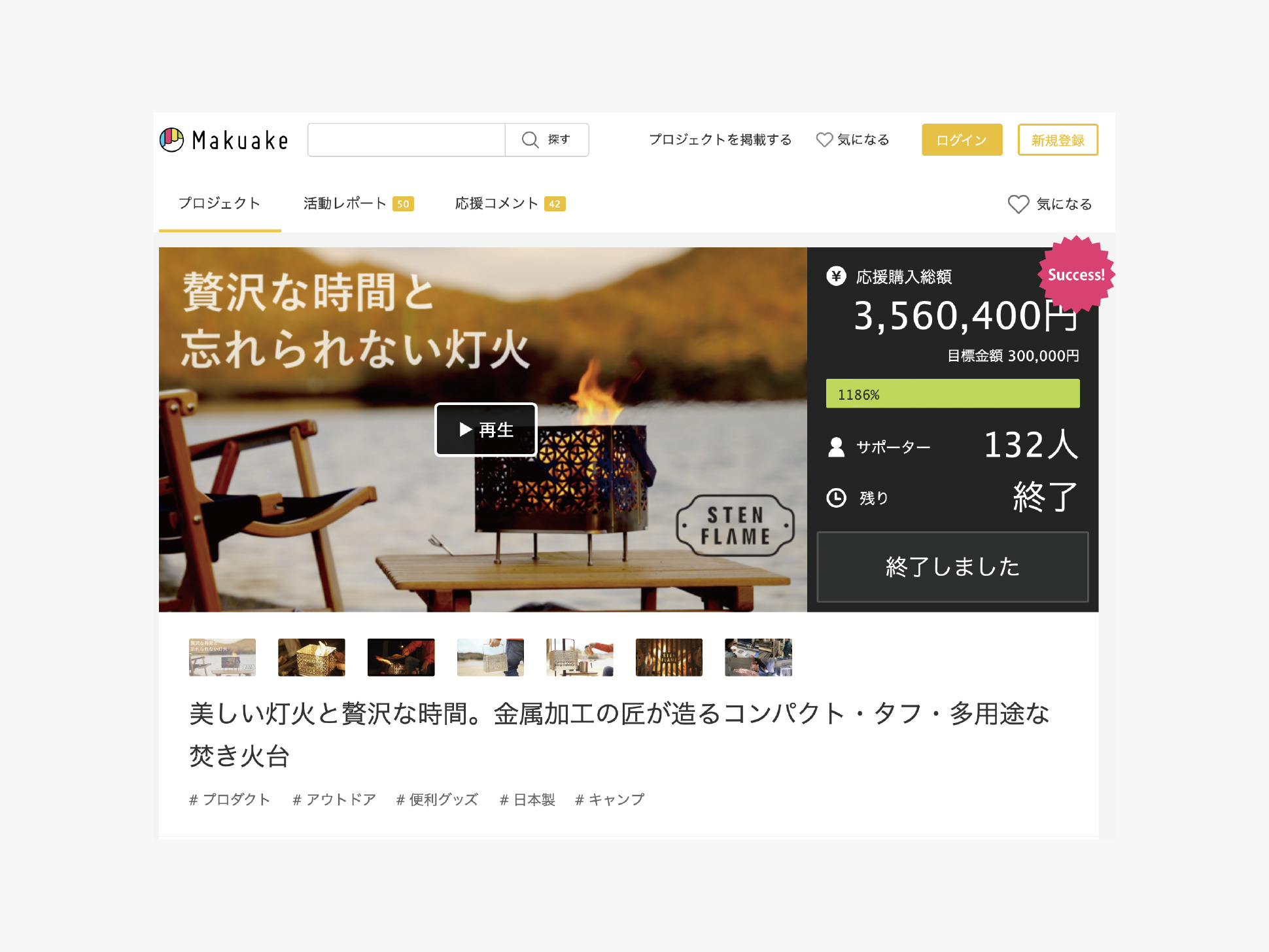 続いて挑戦したのが、クラウドファンディング MAKUAKE でのプロジェクト公開でした。製品開発の背景や想いを丁寧に発信する取り組みが注目を集め、テレビ番組 『ガイアの夜明け』 に取り上げられたことも後押しとなり、結果として**目標金額達成率 1186%**という大きな成果を収めることができました。