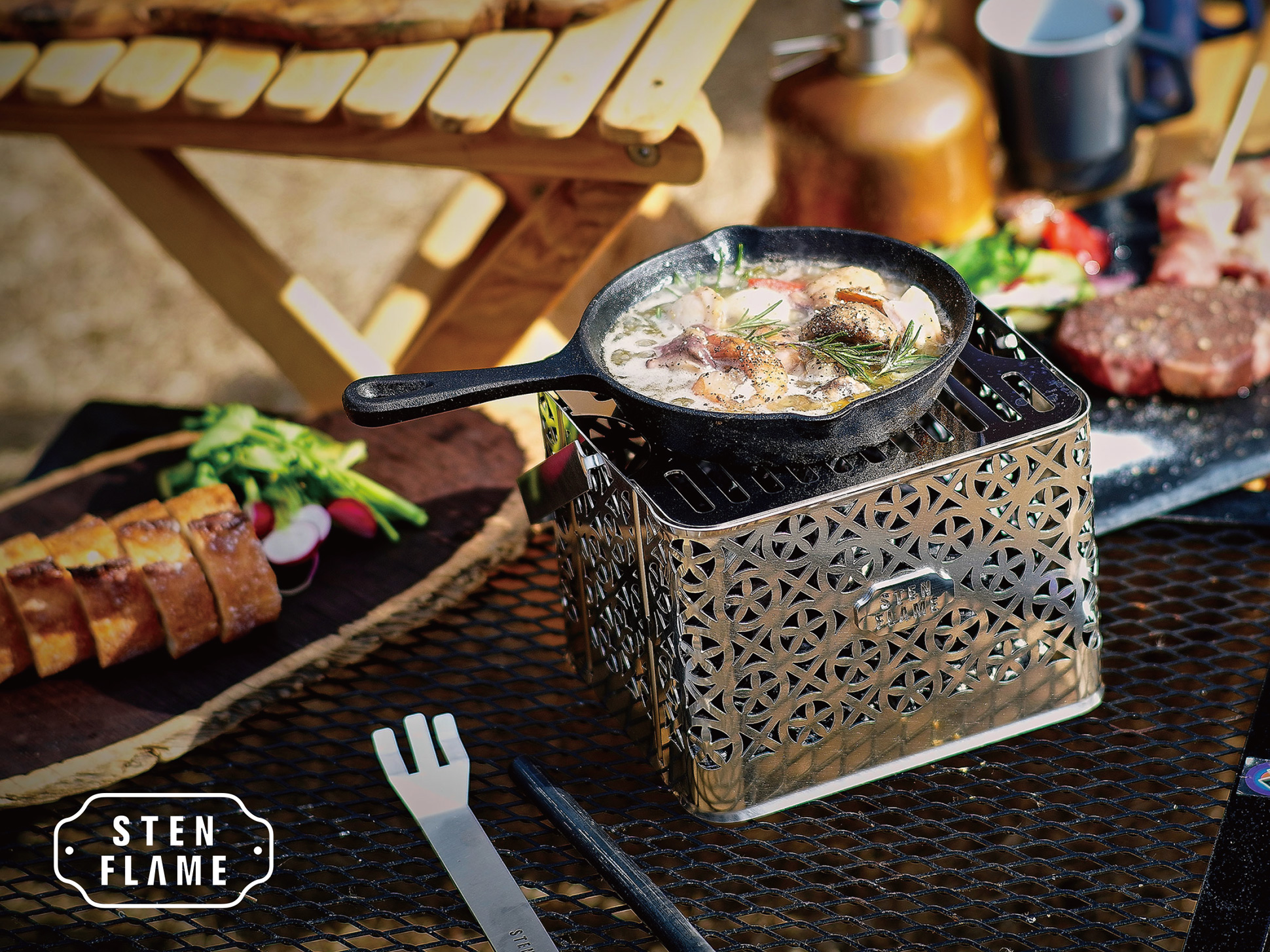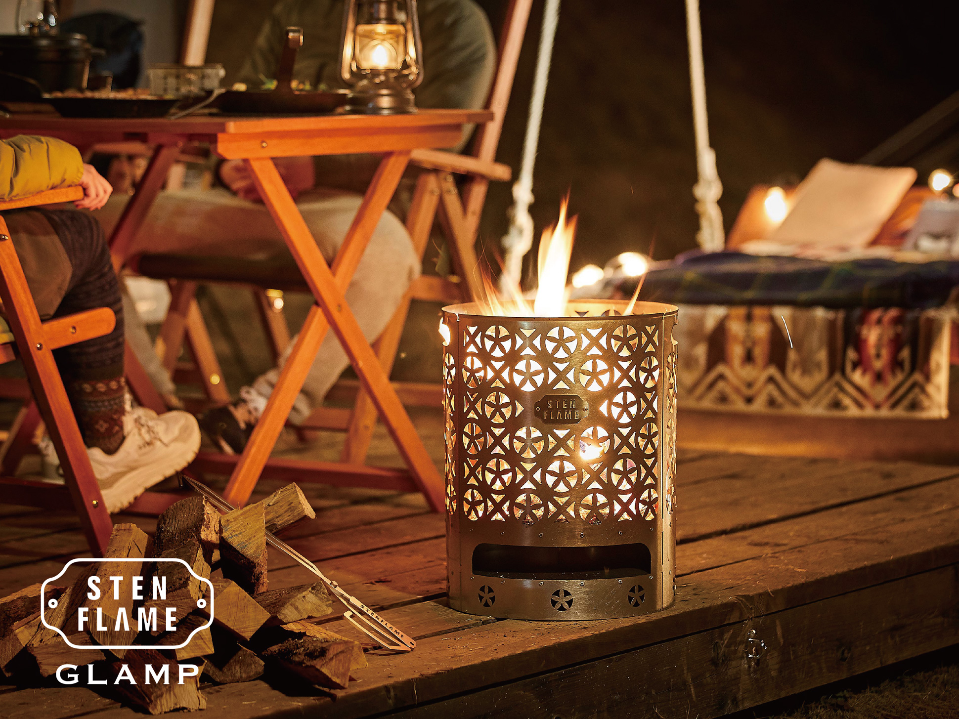 象徴的な導入例として挙げられるのが、亀の井ホテル阿蘇での採用です。ホテルのアウトドア体験の質を高める取り組みの一環として、柄部分にホテルロゴをあしらった名入れOEM仕様を製作。また、大型のキャンプファイヤー演出には、シリーズ第三弾の大型焚き火台 「STENFLAME GLAMP」 が採用され、宿泊者が焚き火を囲んで楽しむ特別な体験づくりに活用されています。