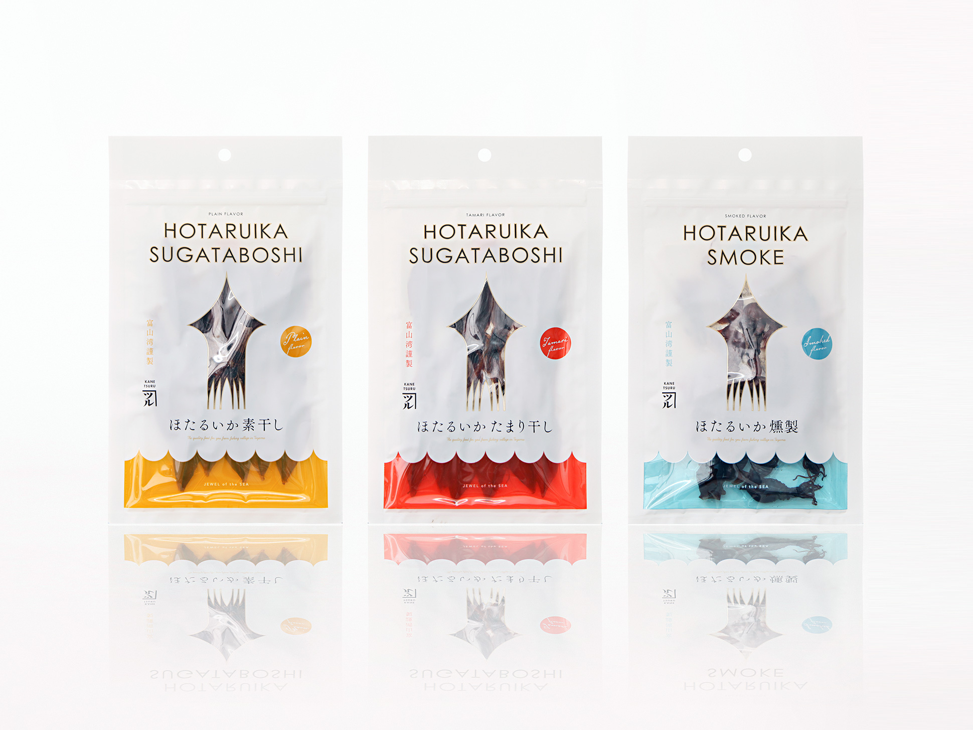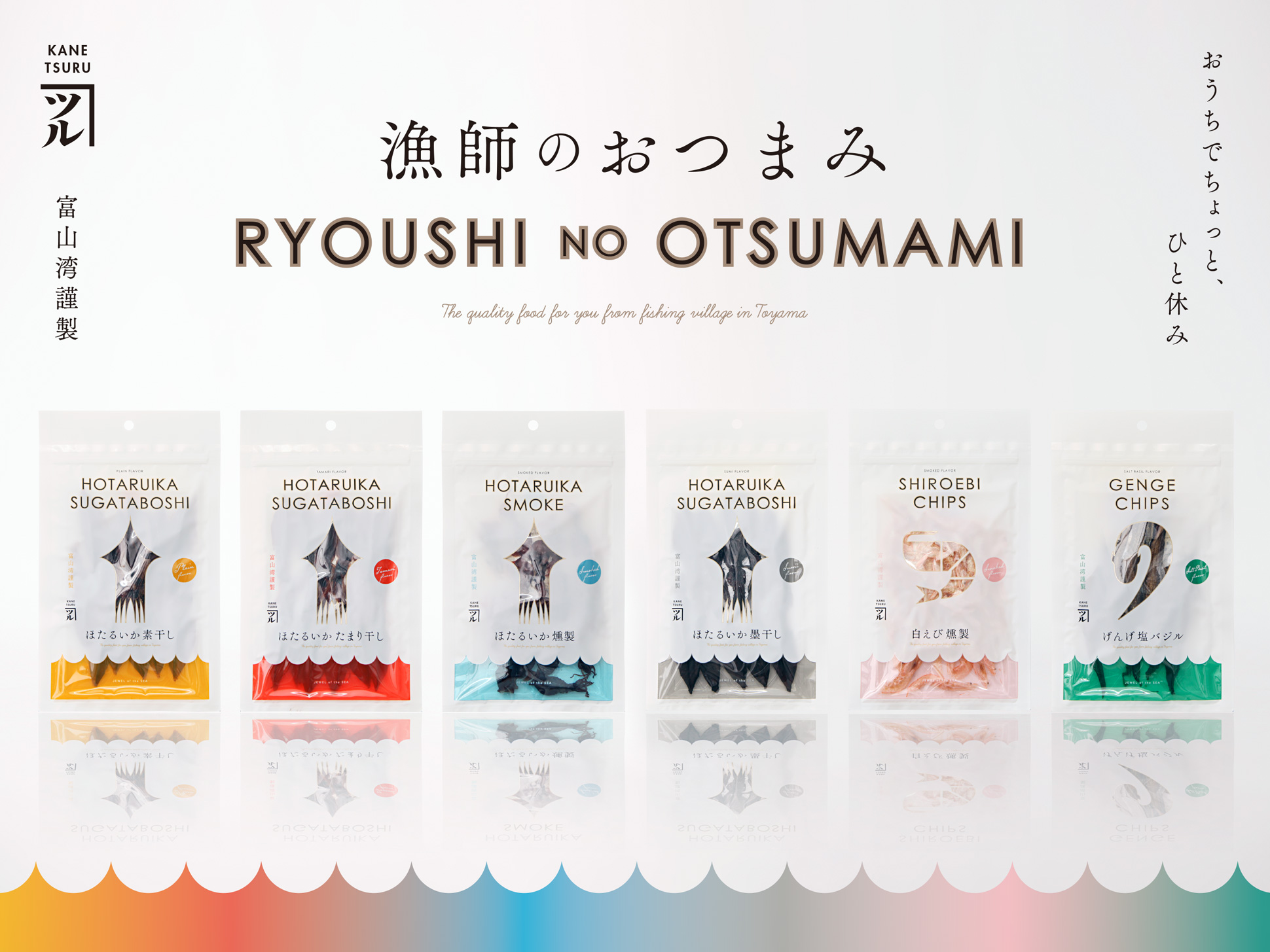 創業以来100余年にわたり、最良の漁場で獲れる最高の富山湾産ほたるいかの加工一筋に邁進してきたカネツル砂子商店。その品質と特徴のあるこだわりの味を活かして、日本酒はもちろん、白ワインなどのシーンにもあわせて食べていただけるように、味やデザインを繰り返し思考錯誤したことで生まれた、現代の若い世代にも楽しんでいただける、新おつまみブランド「漁師のおやつ」のブランディングに携わらせていただきました。