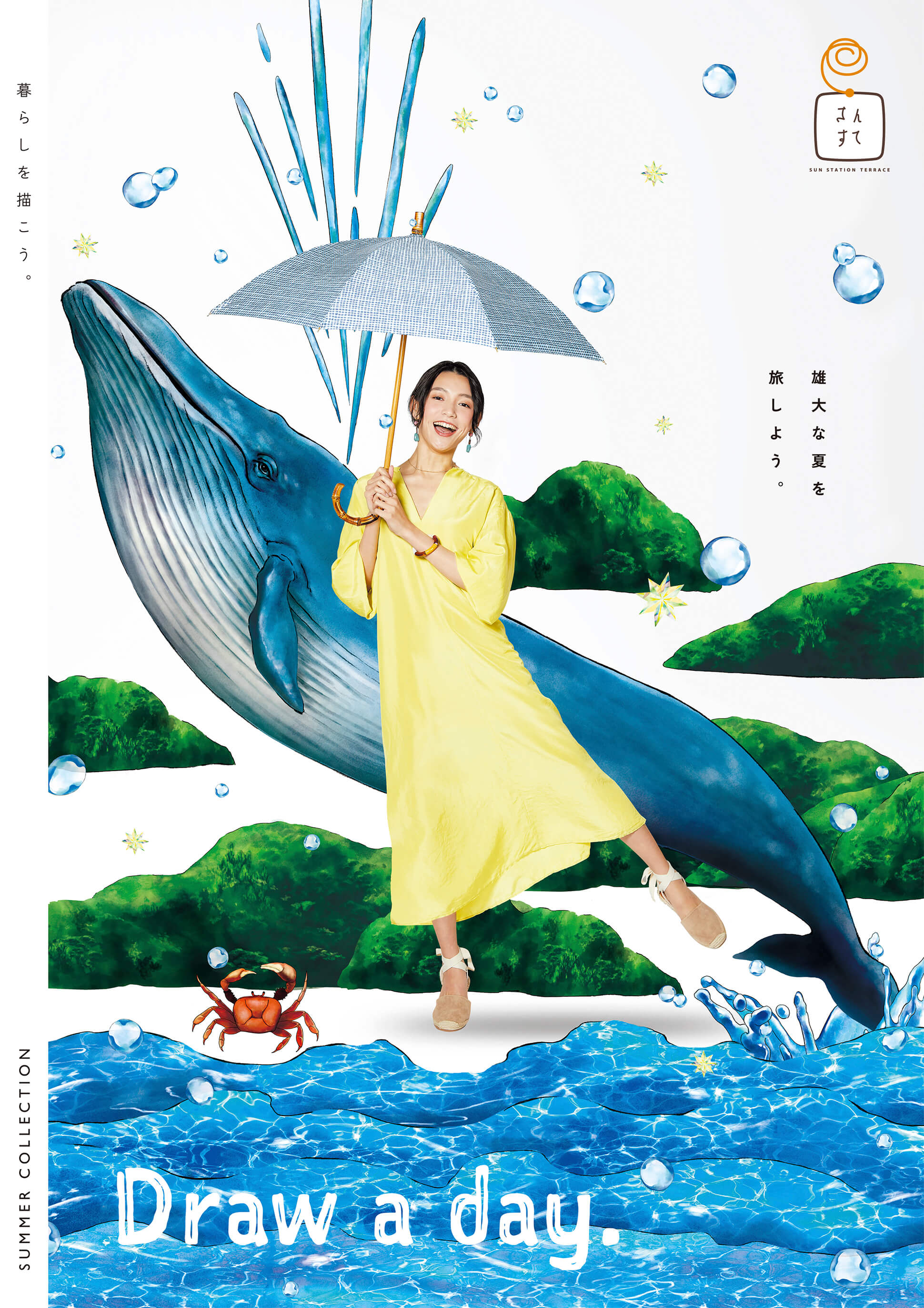 海へのお出かけシーンを舞台に、すぐそばでくじらが微笑みながらジャンプするという、現実ではありえないスケール感のある世界を描写。