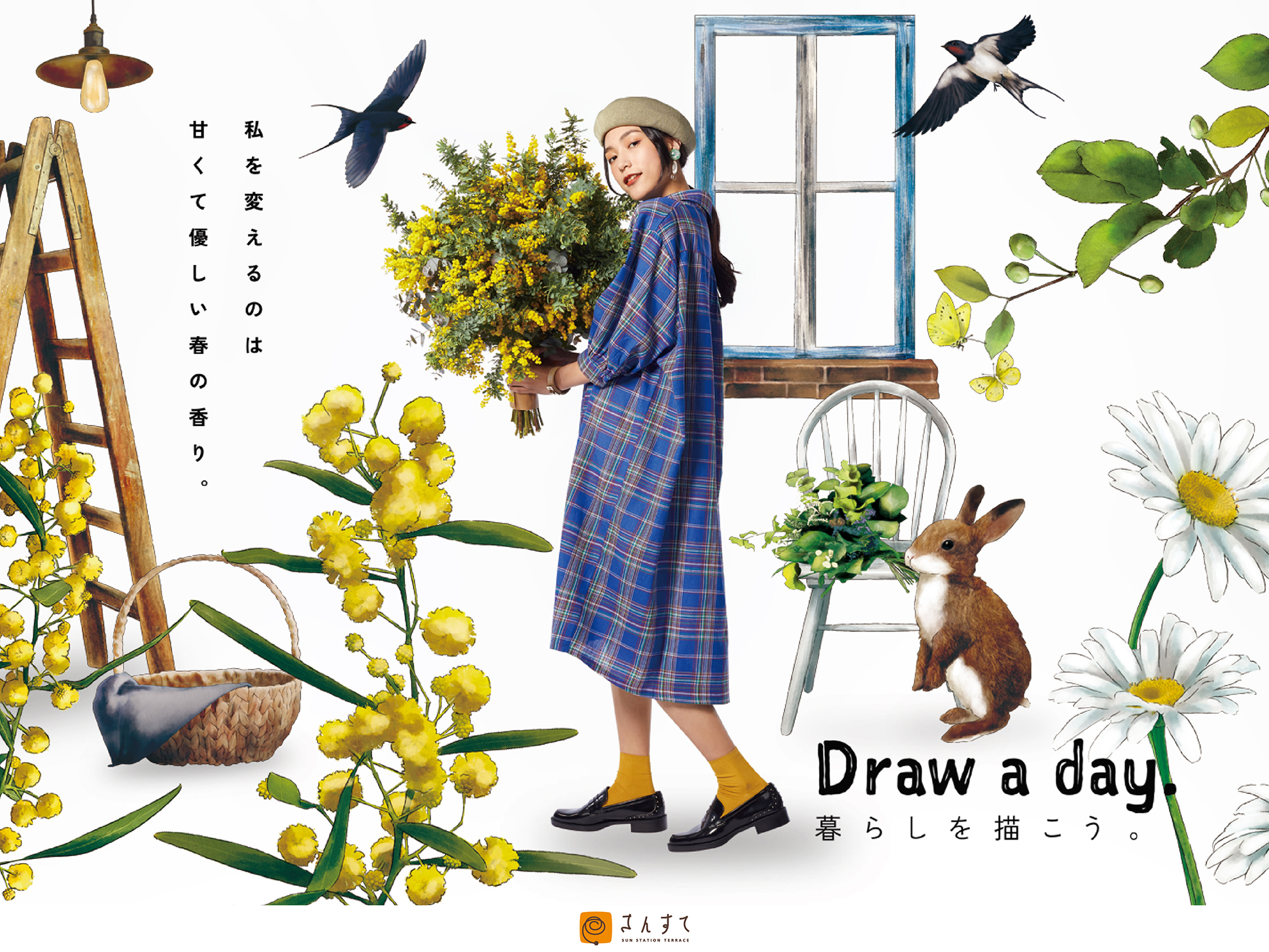 として象徴化。イラストで描かれた世界の中にモデルが存在する構図により、平凡な日常に楽しさや彩りが加わる様子を表現しています。