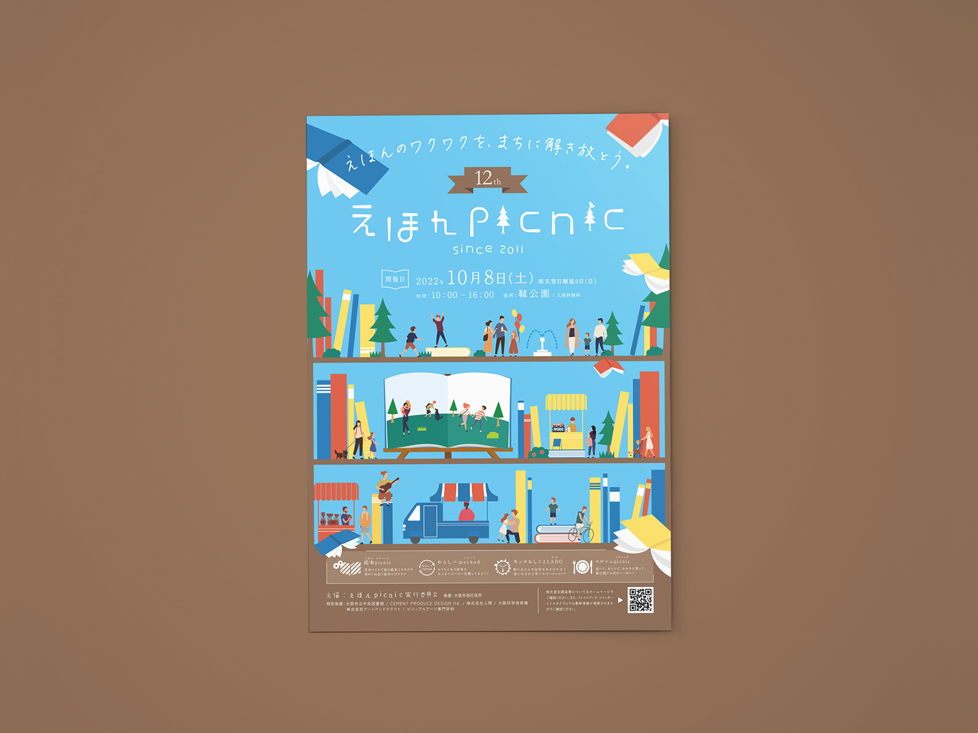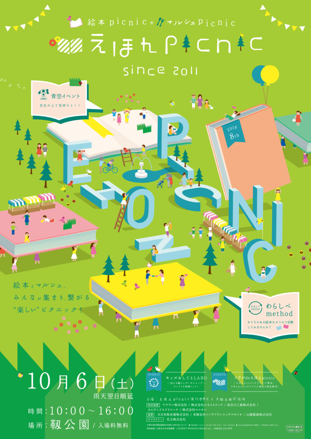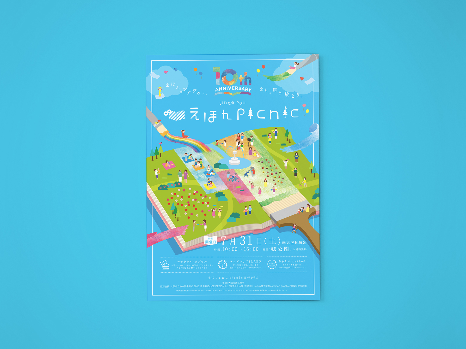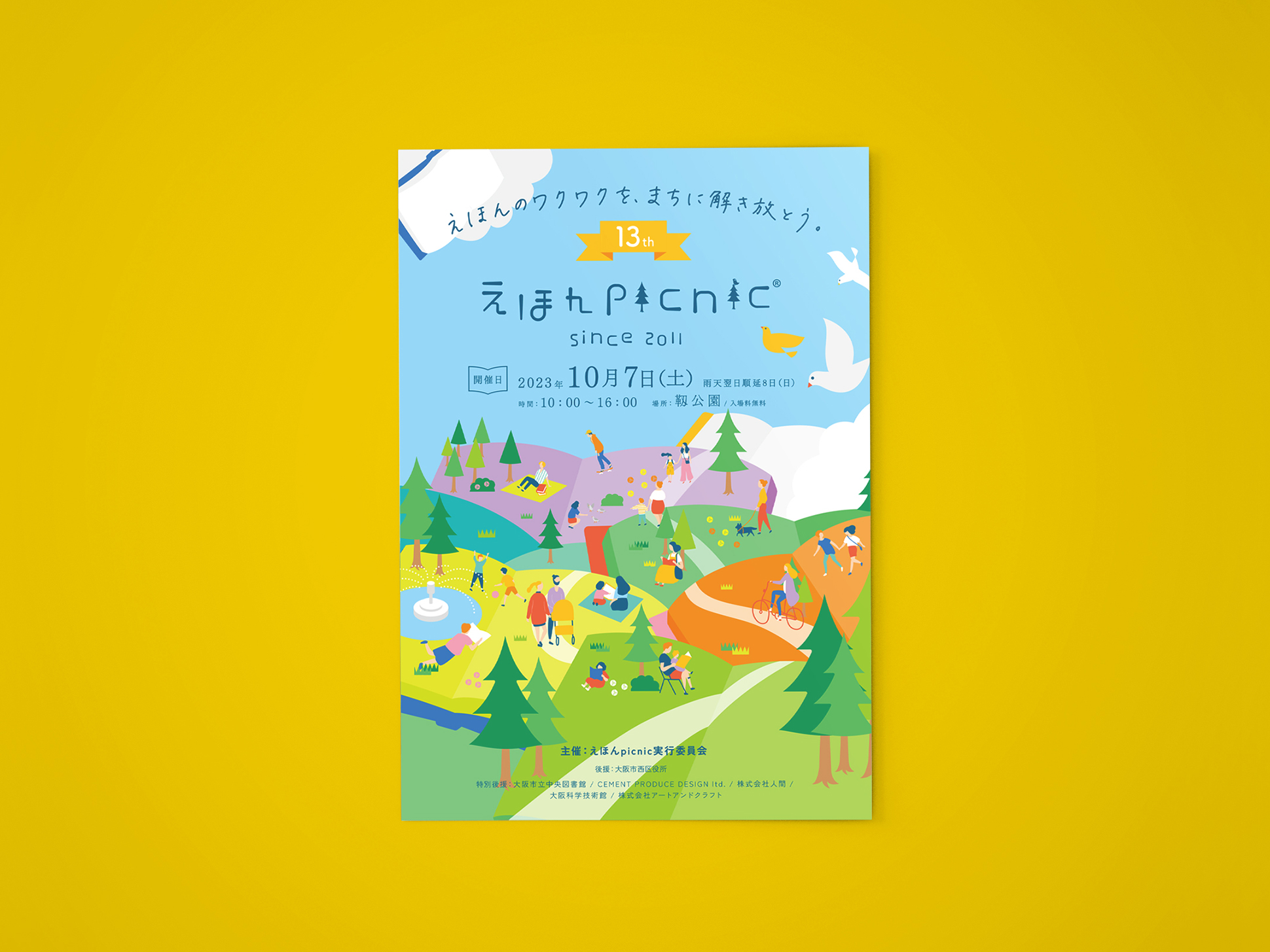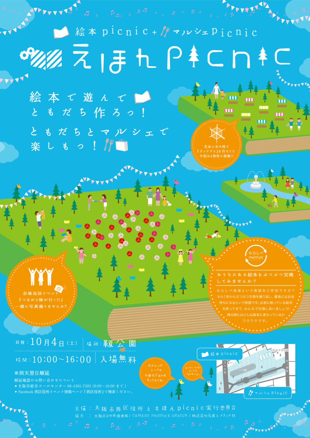 大阪本社のある京町堀・靱公園で開催される「えほんピクニック」において、セメントはデザイン面でのサポートを行っています。