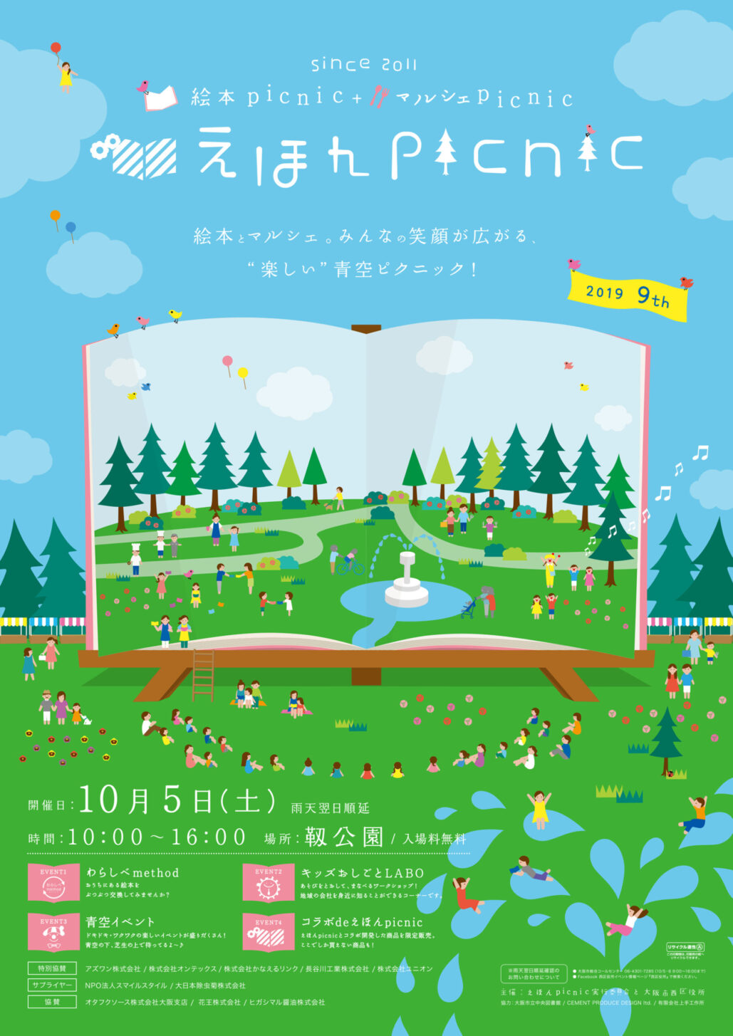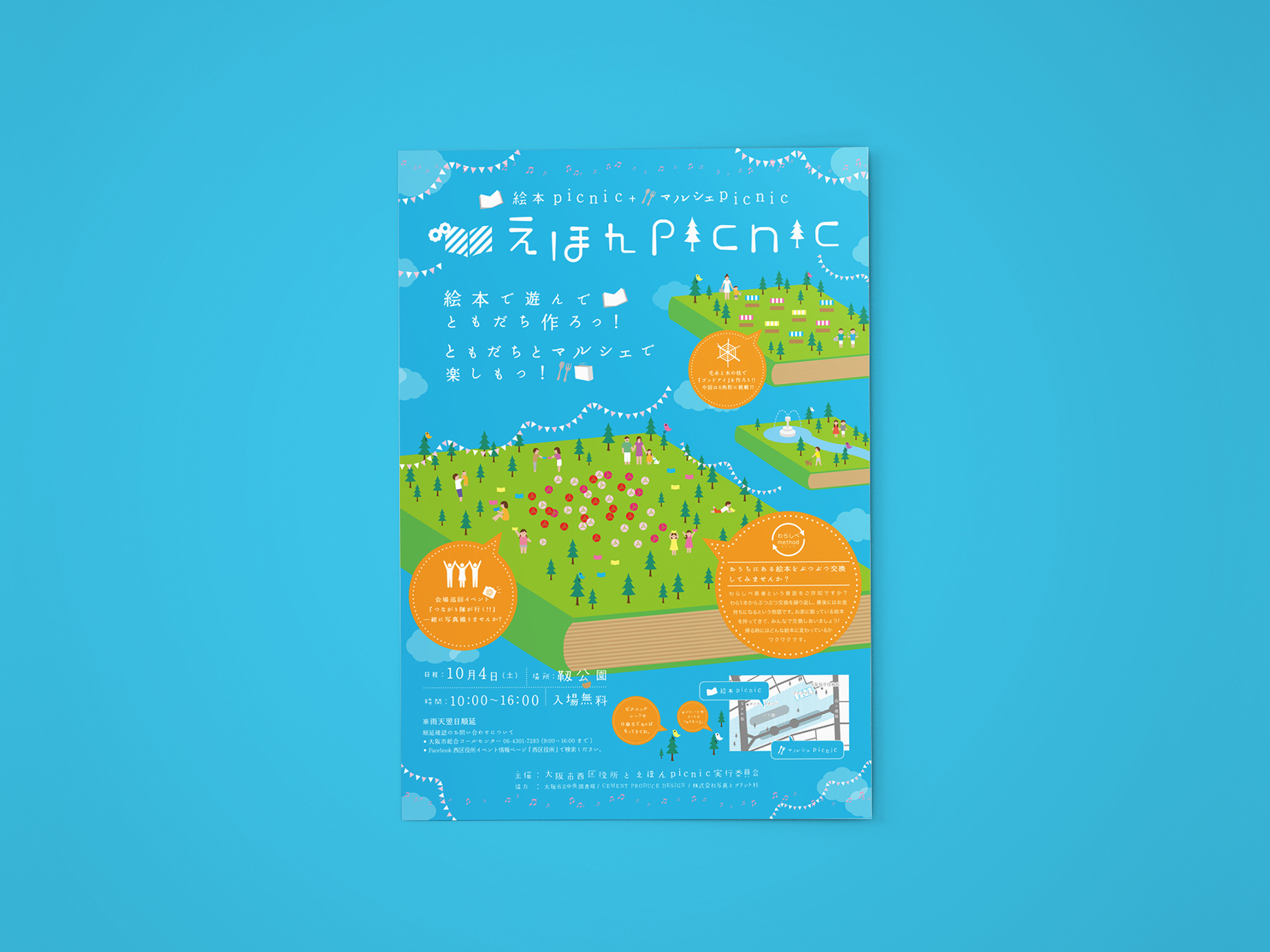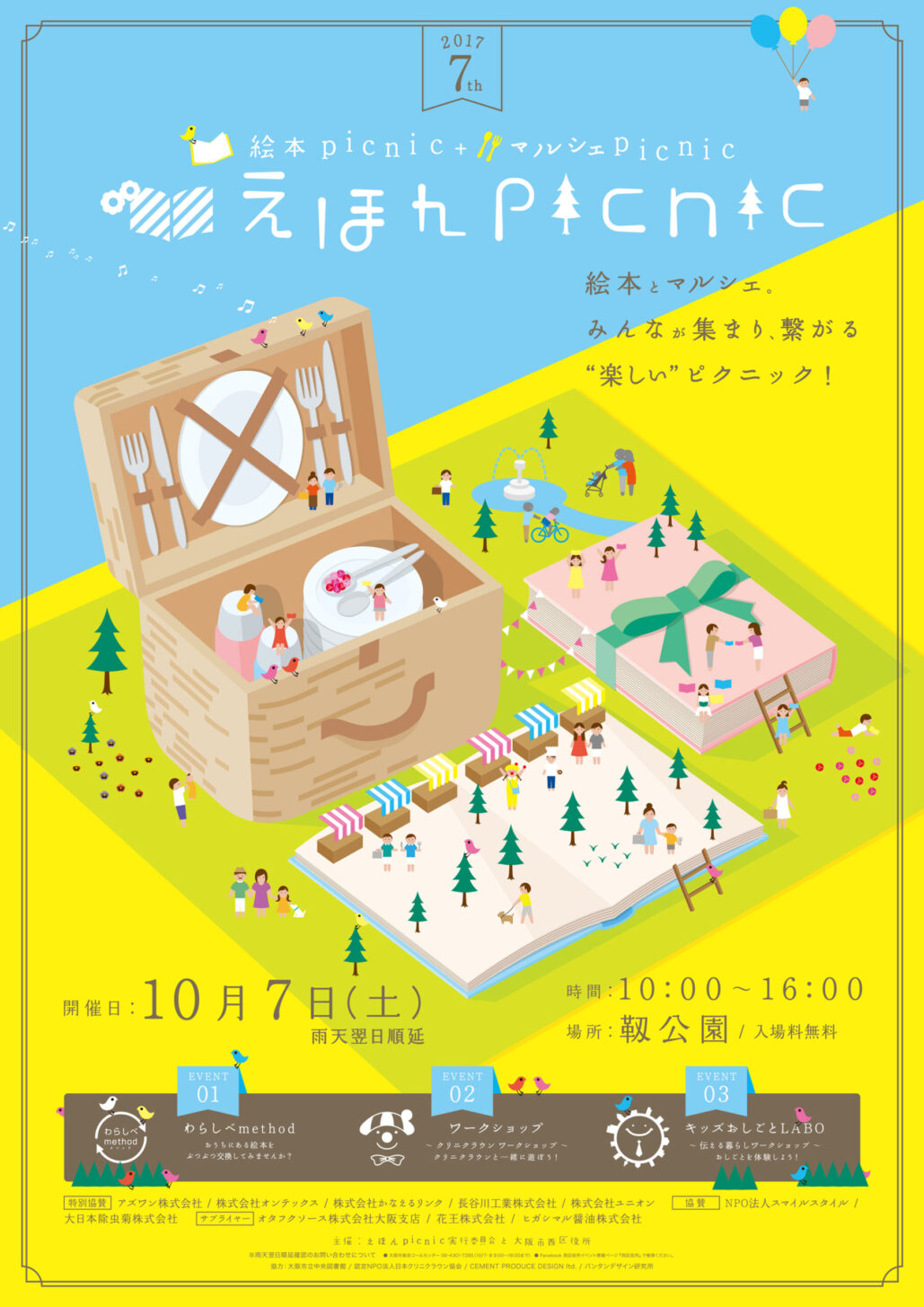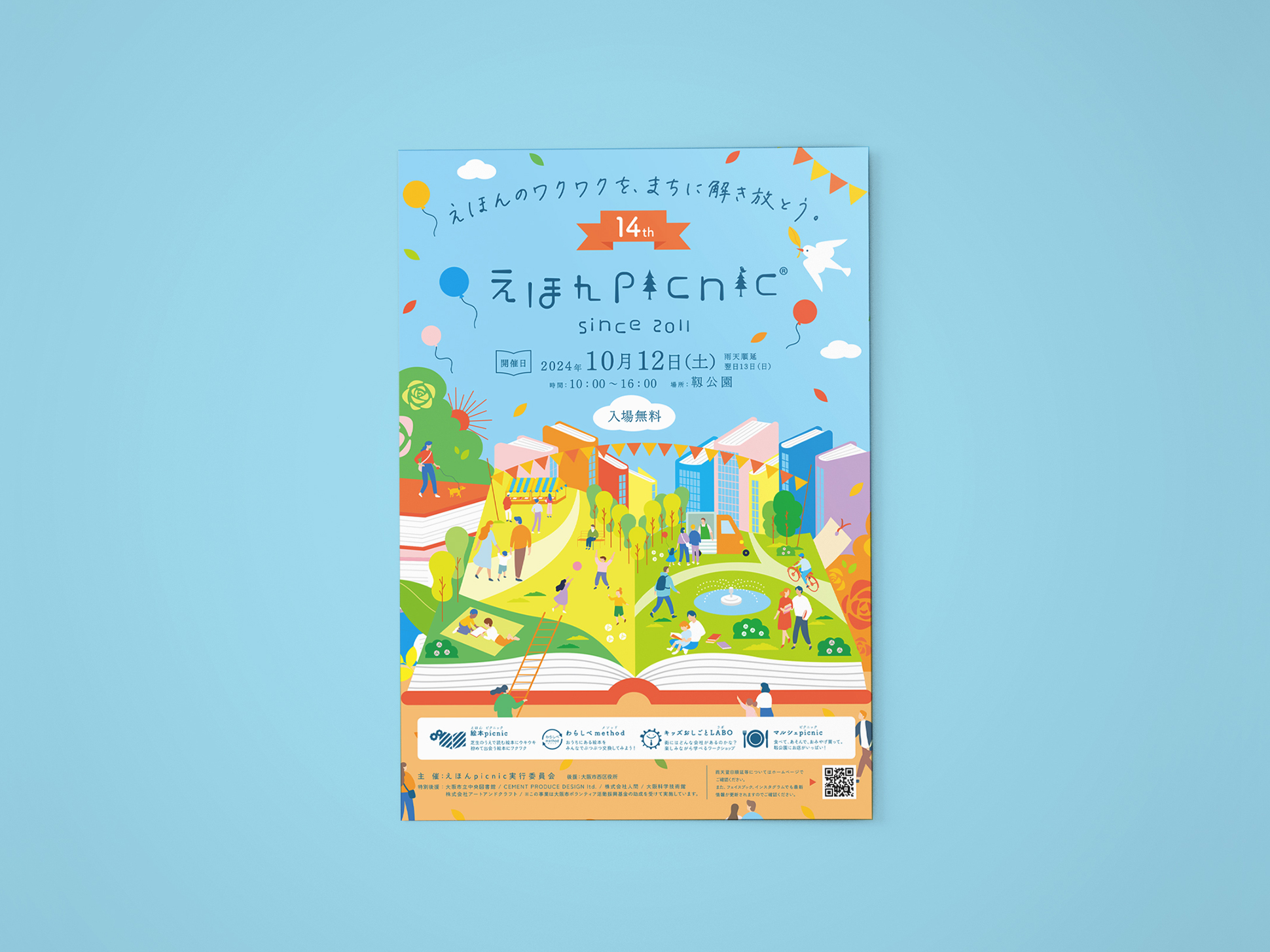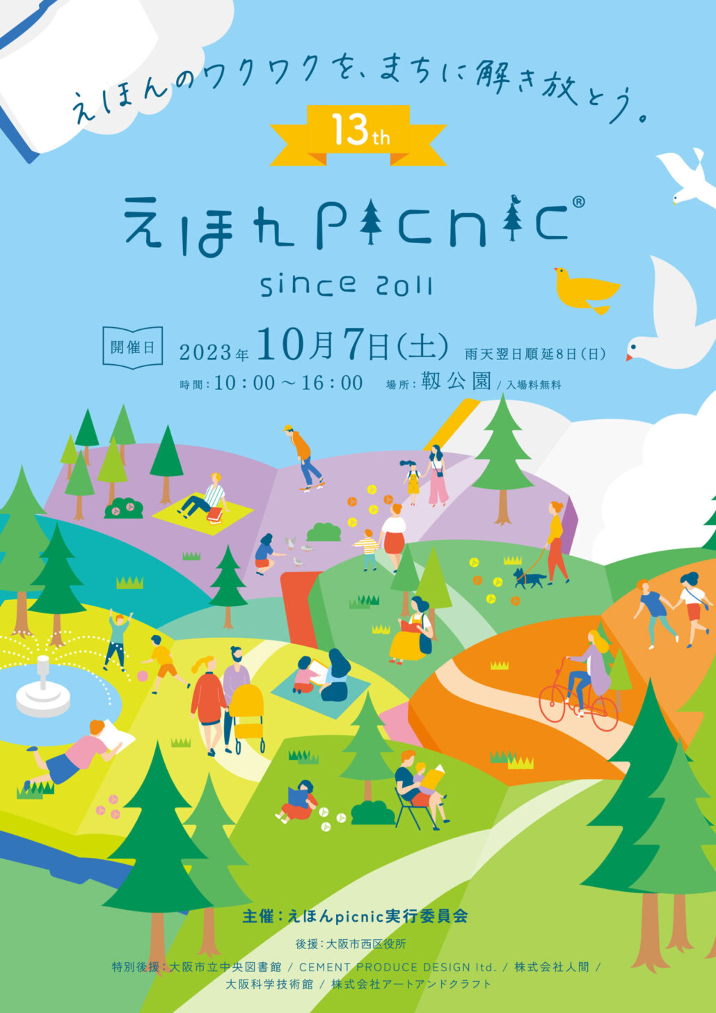 大阪本社のある京町堀・靱公園で開催される「えほんピクニック」において、セメントはデザイン面でのサポートを行っています。
