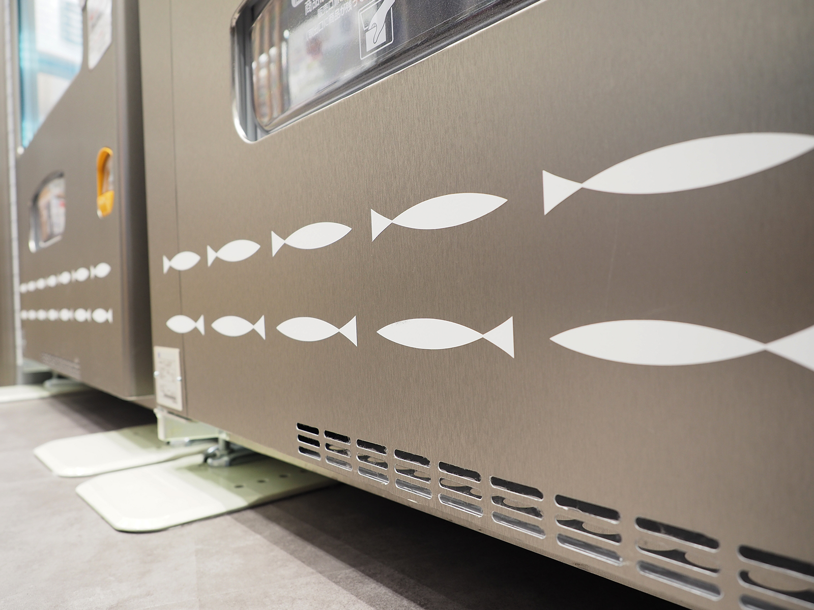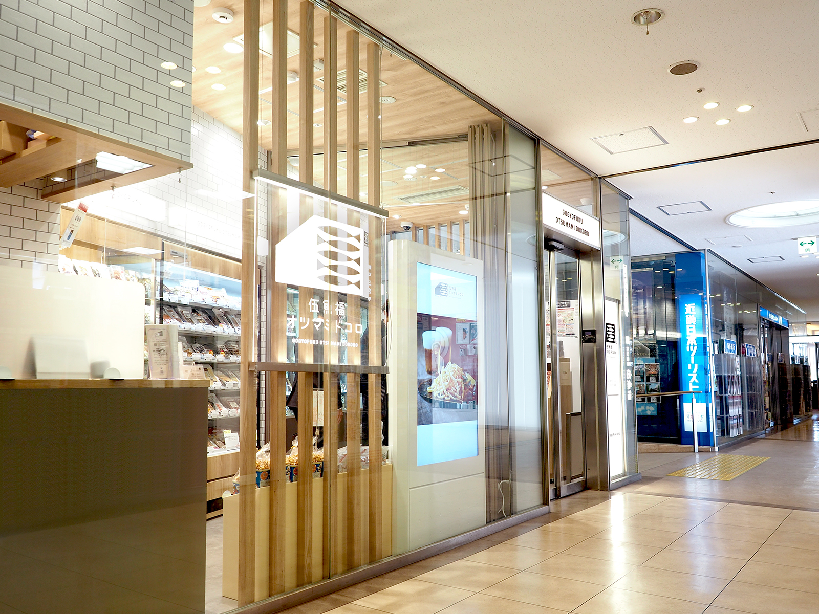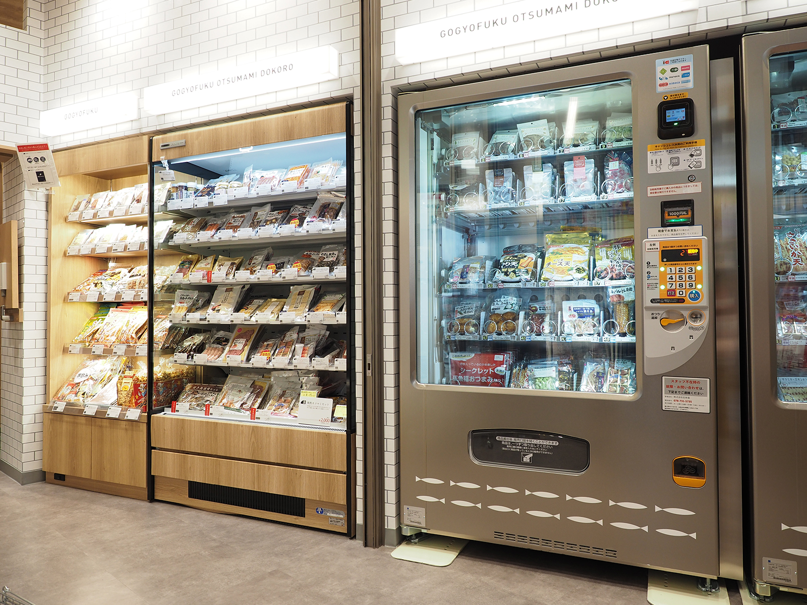 そこで自動販売機を含め空間全体の素材をステンレス(シルバー)で統一し、伍魚福さまの象徴的なシルバーパッケージとの親和性を持たせました。一方で、店舗上部にはホワイトタイルを、ディスプレイ台にはナチュラルウッドを採用することで、金属素材の冷たさをやわらげ、温かみと親しみを感じられる空間へと調整しています。周囲の環境から逸脱せず、それでいて自然と視線を引き寄せるバランスを意識しながら、スタンドとしての軽やかさとブランドの存在感を両立させました。