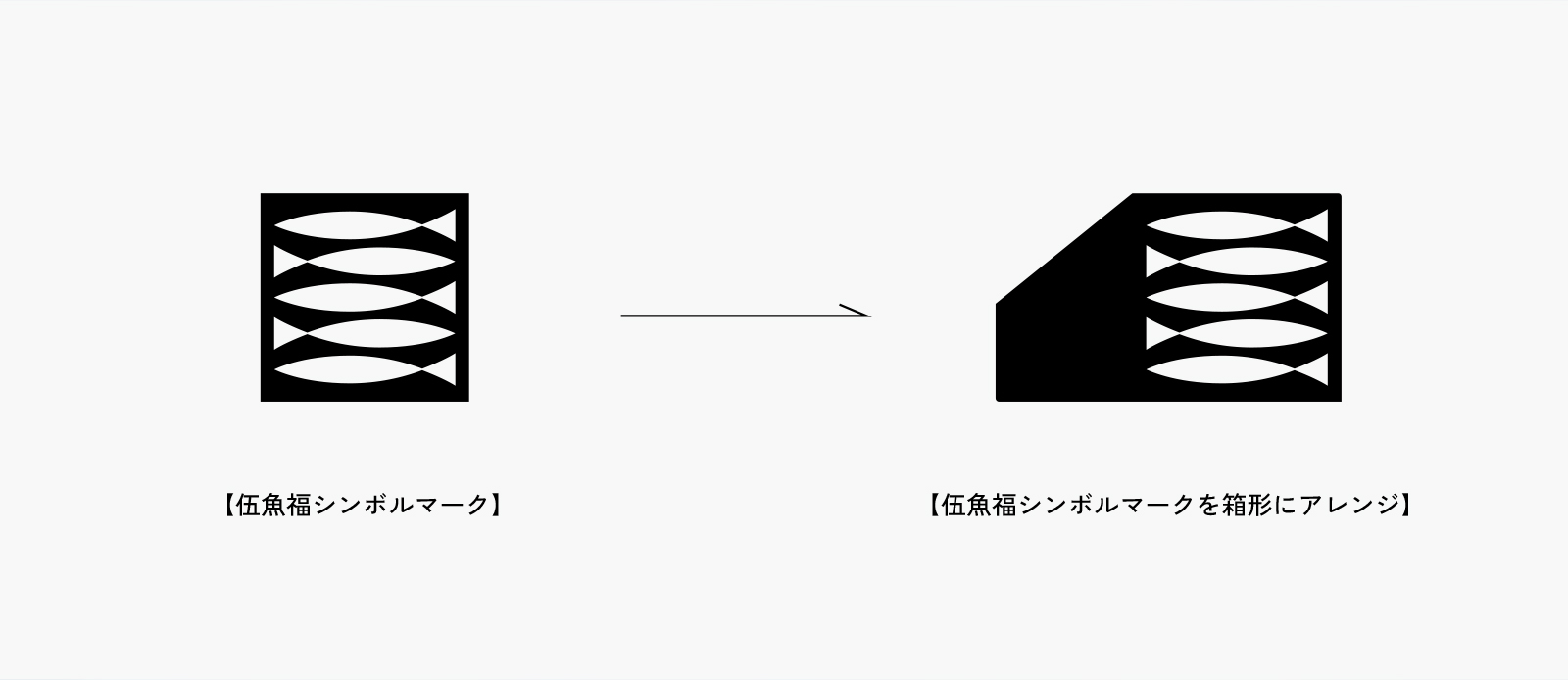 店舗名は「伍魚福オツマミドコロ」。ロゴのコンセプトは“伍魚福の箱”です。既存ロゴをベースにアレンジし、「お店=箱」という考え方を視覚的に表現しました。豊富な商品がそのまま詰め込まれた場所であることを箱のシルエットに重ね、これまで伍魚福さまを愛してこられたファンの方々にも違和感なく受け入れていただけるよう設計しています。新しさを加えながらも、ブランドの連続性を大切にしたロゴデザインです。