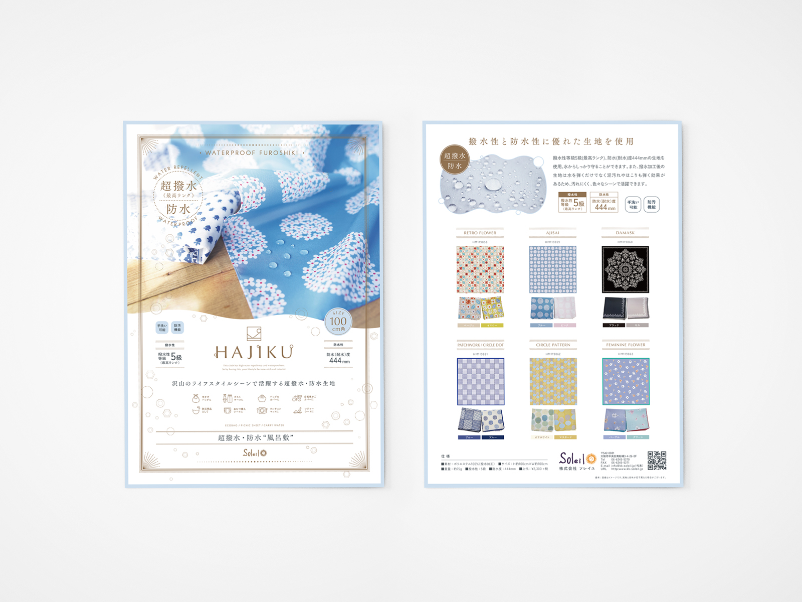 大阪を拠点に、ストール・マフラーのOEMから自社ブランド開発まで、「女性にとって身近で離したくないアイテムづくり」を続けてきた株式会社ソレイユ様。その新商品として誕生した超撥水・防水風呂敷「HAJIKU」のブランド開発において、ロゴ・パッケージ・リーフレットのアートディレクションおよびデザインを担当しました。