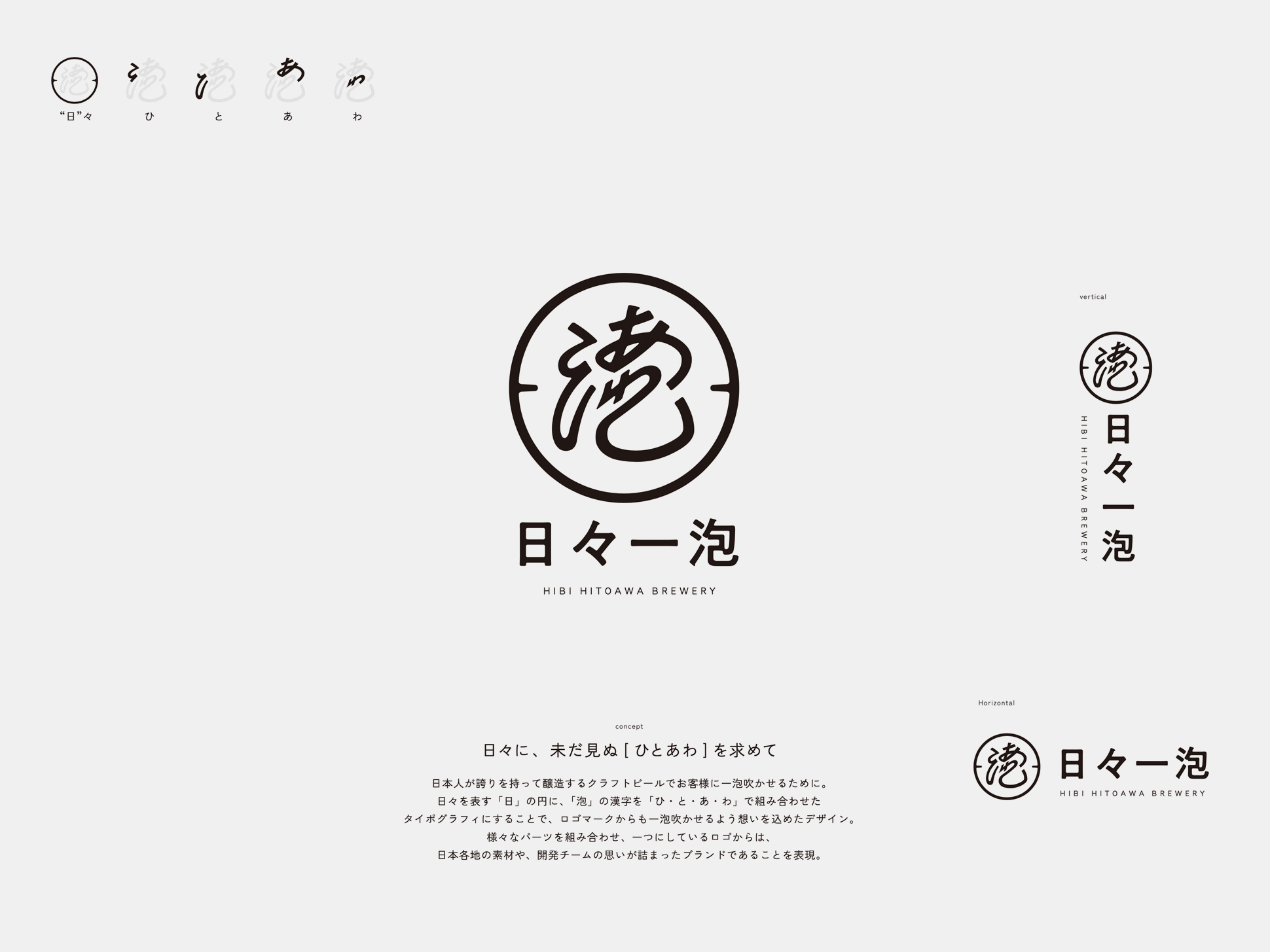 ロゴは「日」の円形モチーフをベースに、「ひ・と・あ・わ」の文字要素を組み合わせたタイポグラフィ設計としました。分解されたパーツが一体となる構造は、原料(水・麦芽・ホップ・酵母)の集合体西日本各地のストーリーの集合開発チームの想いの結集を象徴しています。和の落款を想起させる構成で、日本発クラフトビールとしての誇りも表現しました。