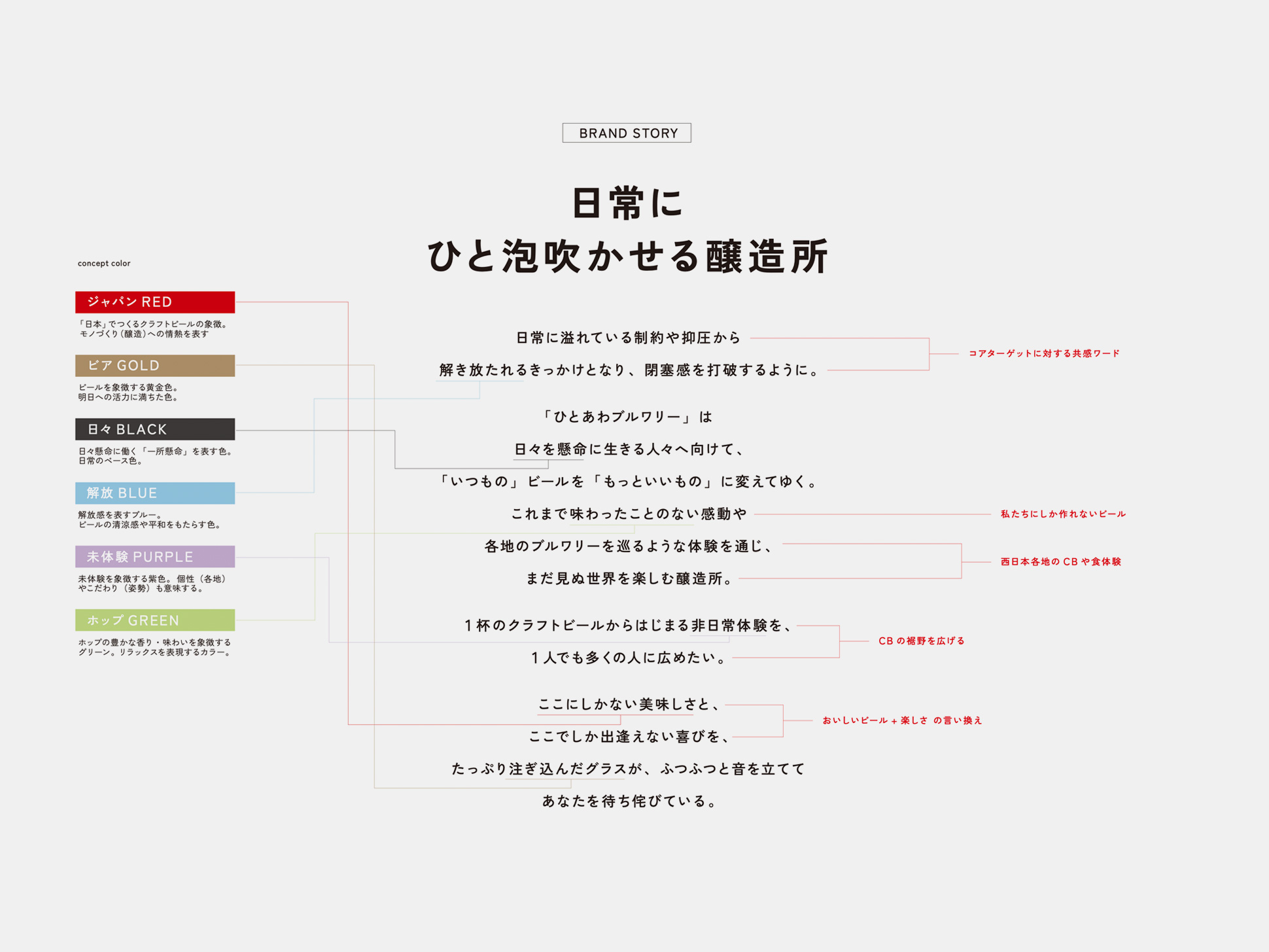 ブランドステートメントを「日常に、ひと泡吹かせる醸造所」としました。 ビールは単なる嗜好品ではなく、人と人をつなぎ、抑圧をほどき、会話を生む存在です。1杯のクラフトビールから始まる、まだ見ぬ世界との出会い。西日本各地のブルワリーやストーリーを伝え、クラフトビールの裾野を広げる存在を目指しました。キーワードは、解放体験変化つながり物語日々懸命に働く人にとっての“小さな非日常”を設計しました。