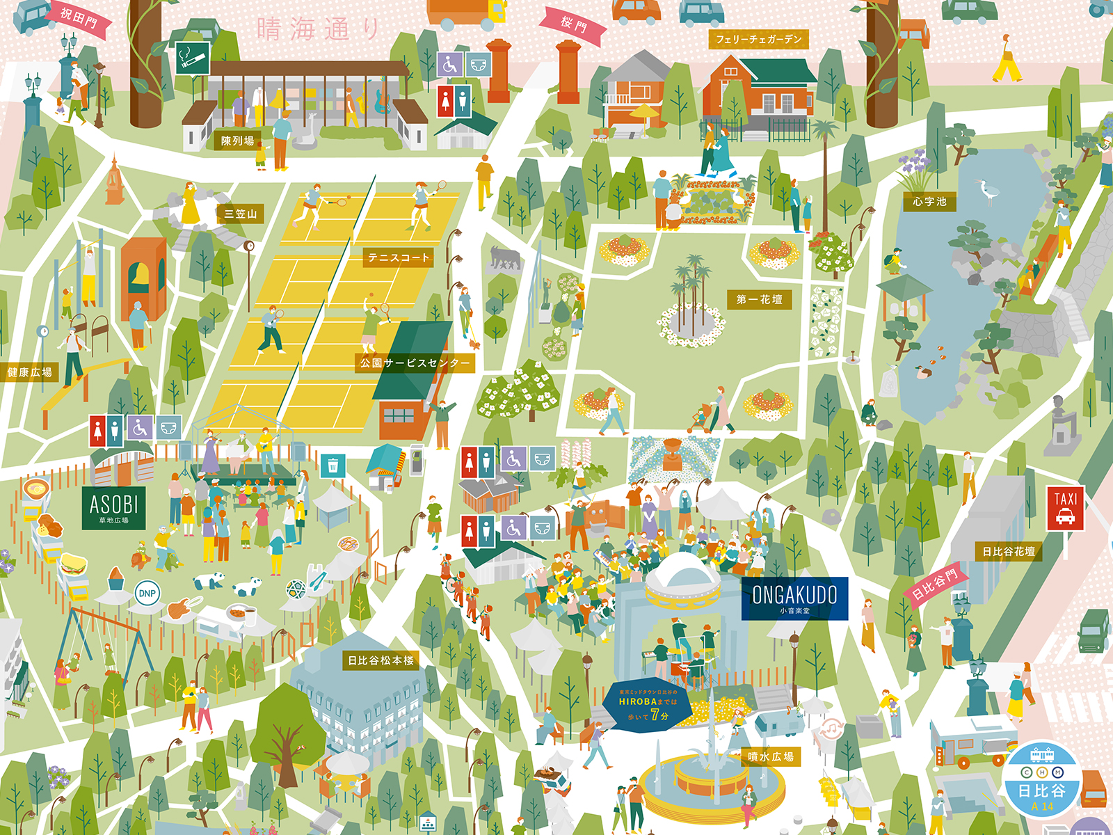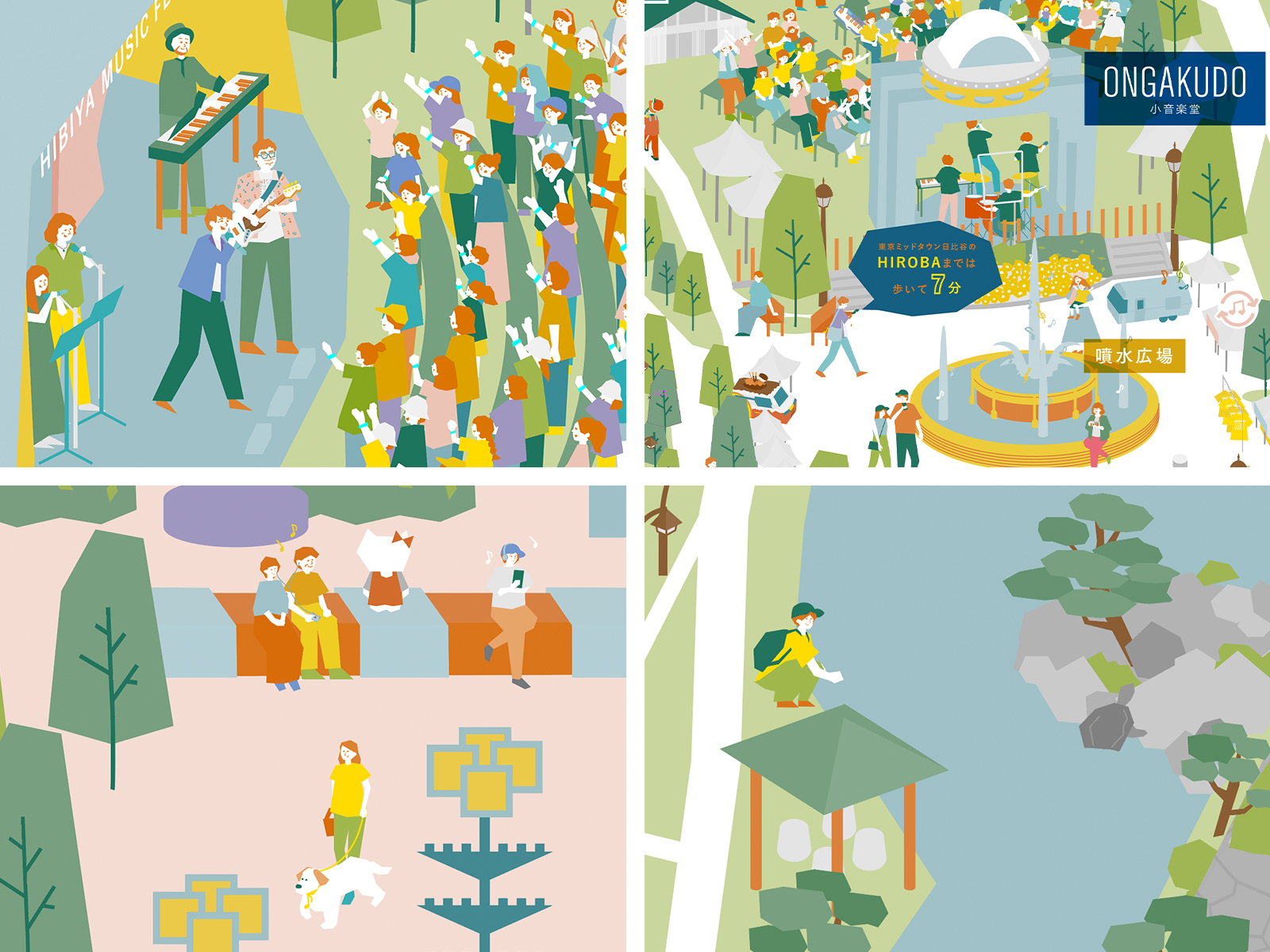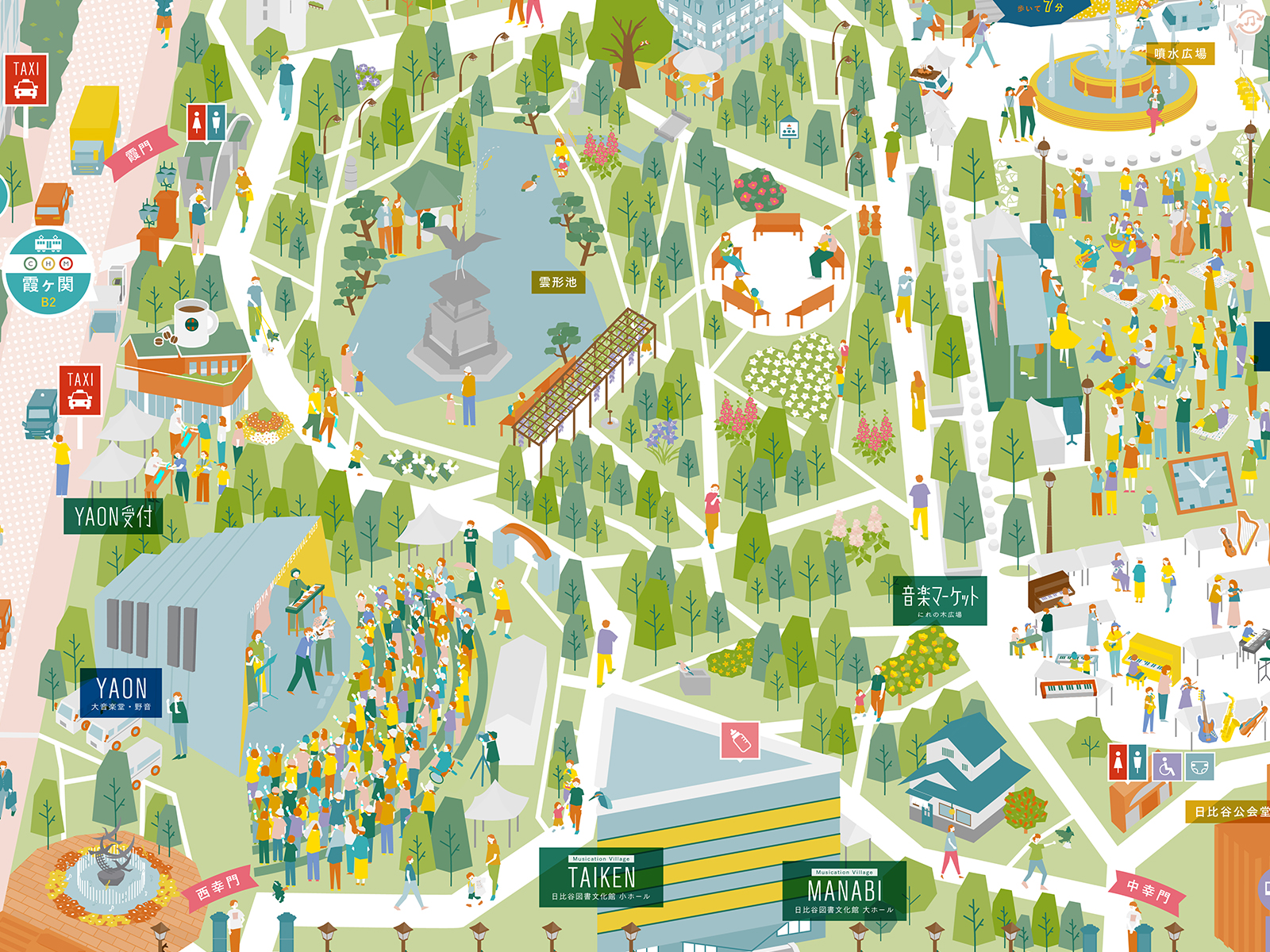 音楽祭当日だけでなく、終わってからも日比谷公園に行きたくなるようなマップを目指し、日比谷音楽祭の賑わいはもちろんのこと、日比谷公園内の特徴的な動植物や施設をあますことなくイラストマップとして描き起こしています。出演アーティストの方々が日比谷公園内に紛れていたり、公式グッズを身につけて音楽祭を楽しんでいる人や、このマップをスマートフォンで見ながら公園内を散策している人、音楽に癒されて寛ぐ猫や鳥たち、また楽器をモチーフにした建物や、実際にそこに咲く花々など、どこを切り取ってもその場面場面でストーリー性があり、見ていて飽きない、もっと探ってみたくなる、探ることで日比谷音楽祭と日比谷公園が好きになる、そんな気持ちにしてもらえるようなマップを目指し制作させていただきました。