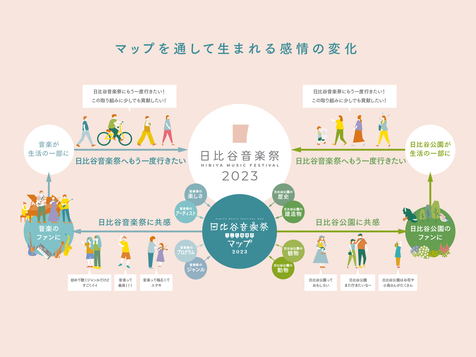今回のマップを通して誰に何を伝えたいのか、制作チーム全員が同じ方向性を向いて進めるためにまずコンセプトのアイデアをいくつかご提案させていただきました。日比谷音楽祭のコンセプトである3世代の誰もが音楽を楽しめて、音楽に対する新たな文化を根付かせることを大前提とし、音楽祭を通して日比谷公園のファンを作るアイデア、日比谷公園120周年、野外音楽堂100周年を記念し、音楽祭を通して歴史をめぐり記念イヤーを祝うマップアイデアなど。
