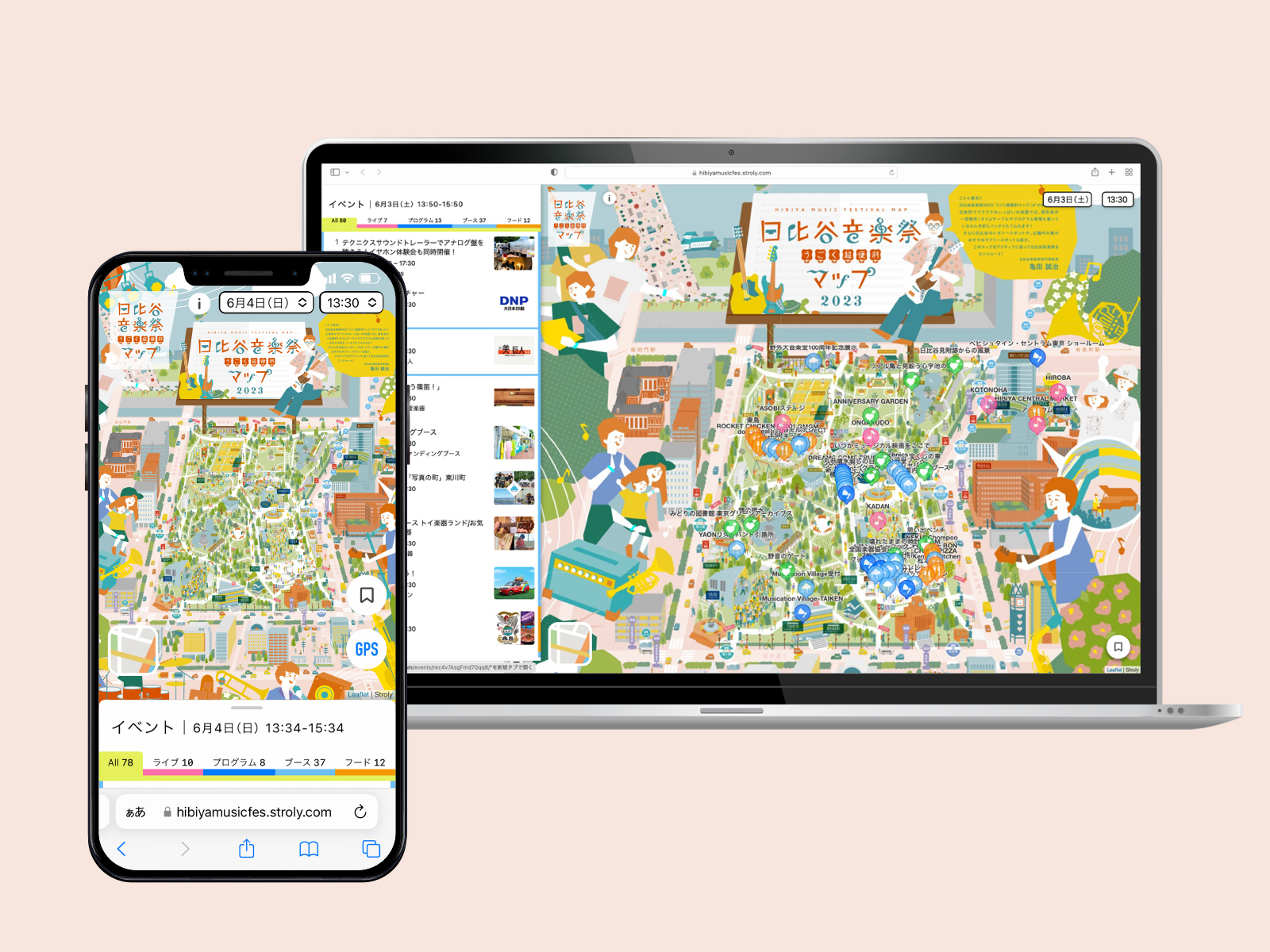 担当させていただいたマップデザインに対し、Strolyさまに日比谷音楽祭ならではのスーパーな機能を備えていただいております。会場全体で今どんなことが起こっているのか、ライブ情報や出店ブース情報を「現在地」や「時間」に合わせて表示し、今回新たに「マイリスト機能」という自分が行きたいイベントや忘れたくないイベントをマイリストに保存しマイリストページで自分だけのタイムスケジュールが組める日比谷音楽祭ならではの機能が盛り込まれています。