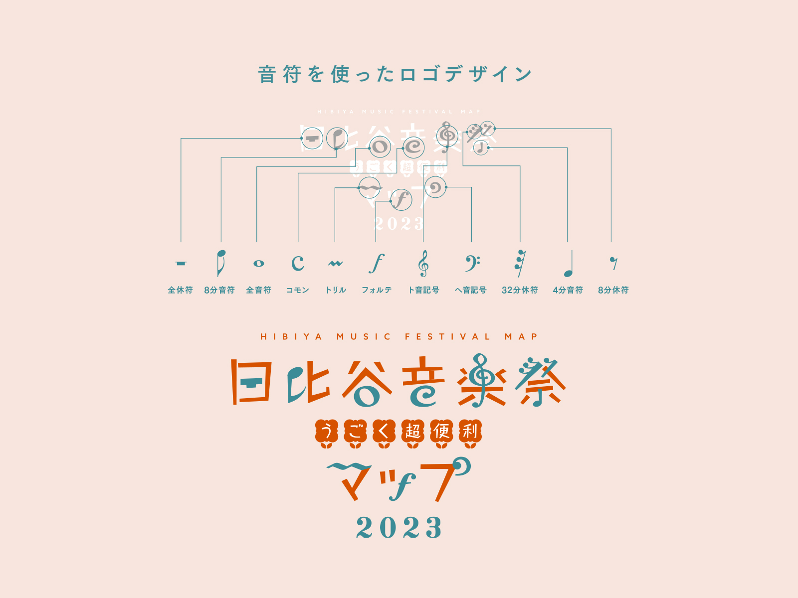 日比谷音楽祭でお客様やアーティスト、出店者の方々が音楽を楽しむ様子を想像し、音符を使ったロゴデザインを考えさせていただきました。マップのイラストの世界観を崩さないようにラインに抑揚をつけた可愛らしいデザインとなっております。