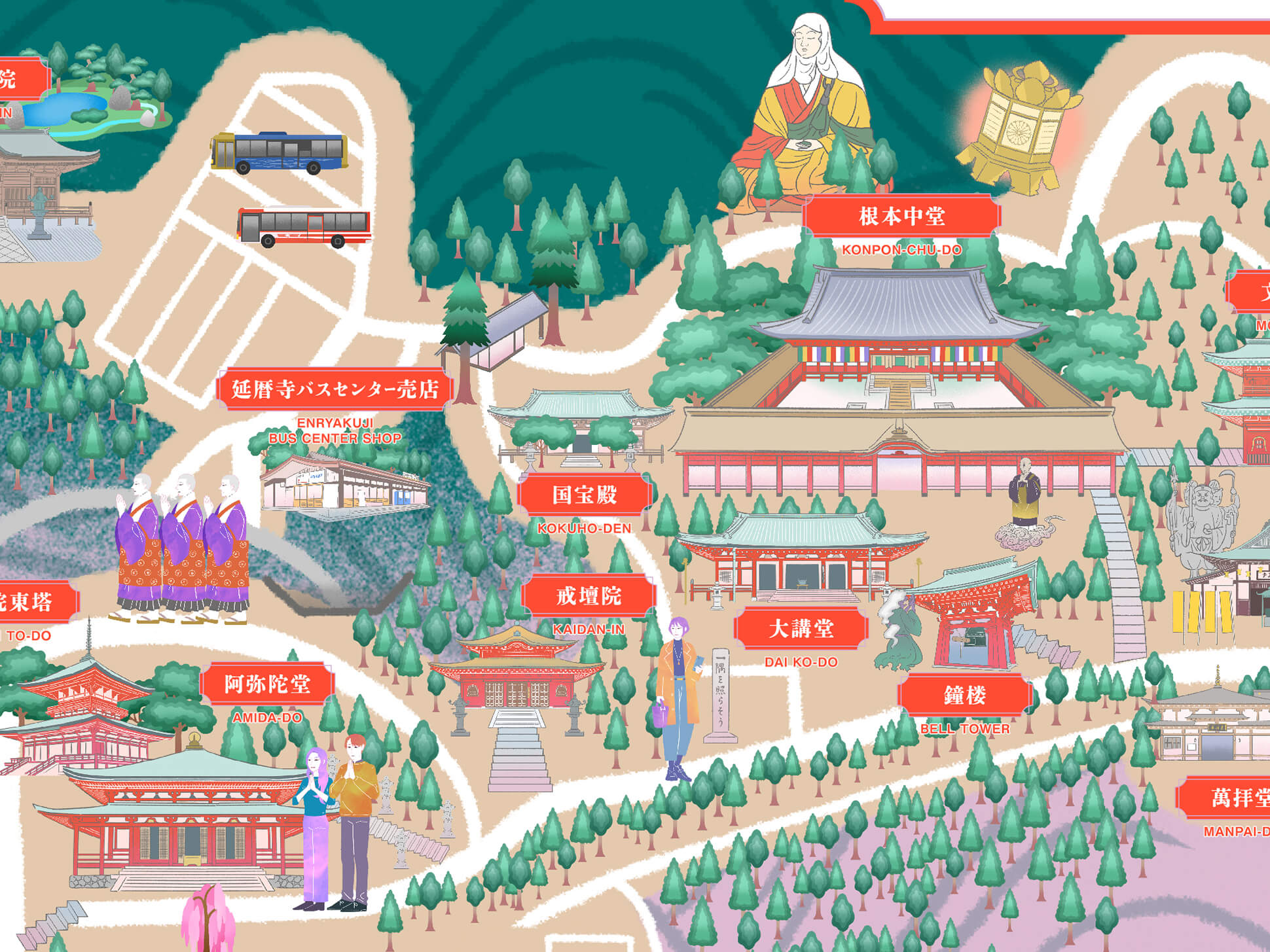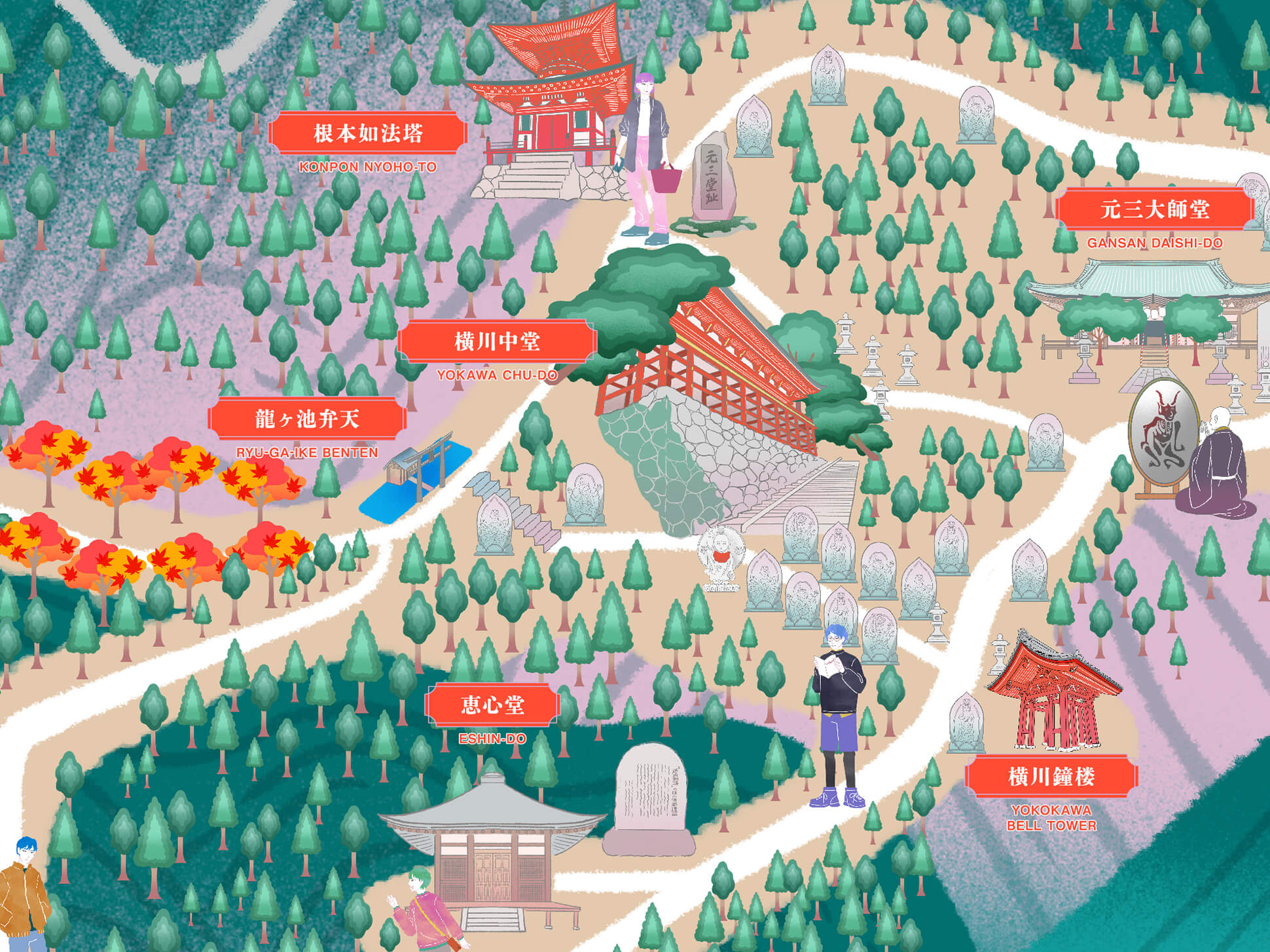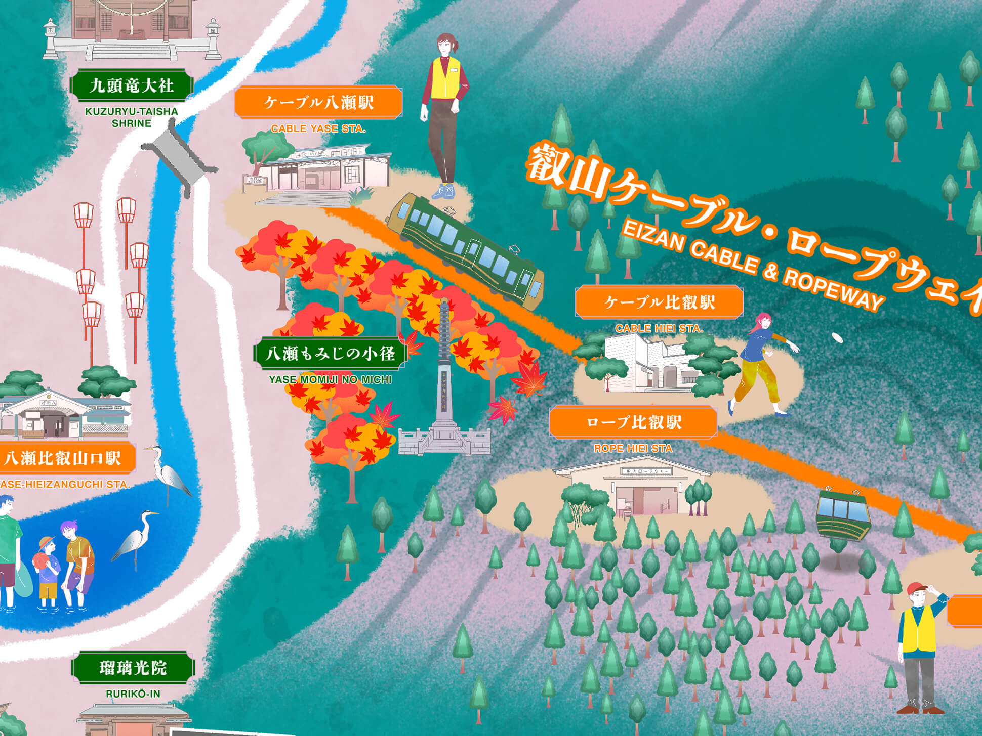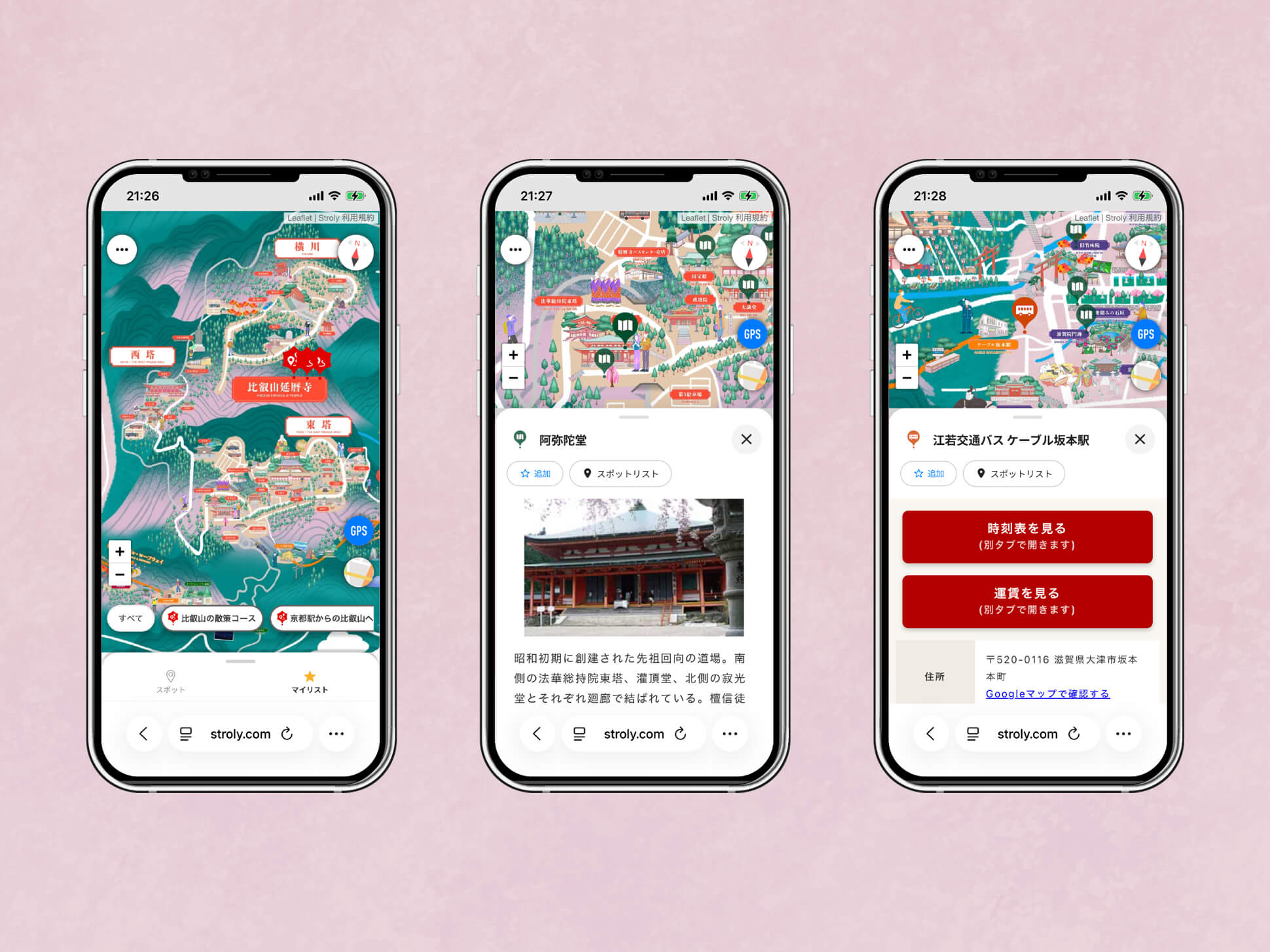 世界文化遺産・比叡山延暦寺を中心に、比叡山とその周辺観光地を“点”ではなく“エリア”として楽しんでもらうためのイラストデジタルマップを設計。GPSと連動して現在地を表示できるほか、観光・グルメ・宿泊・土産情報に加え、ロープウェイやバス、鉄道といった交通情報、京都駅からのアクセスまでを網羅し、初訪問者でも安心して回遊できる設計としています。