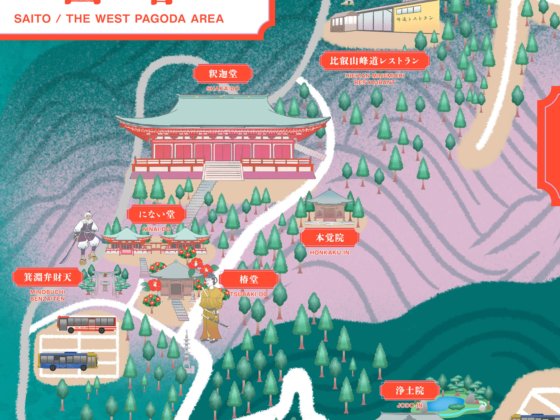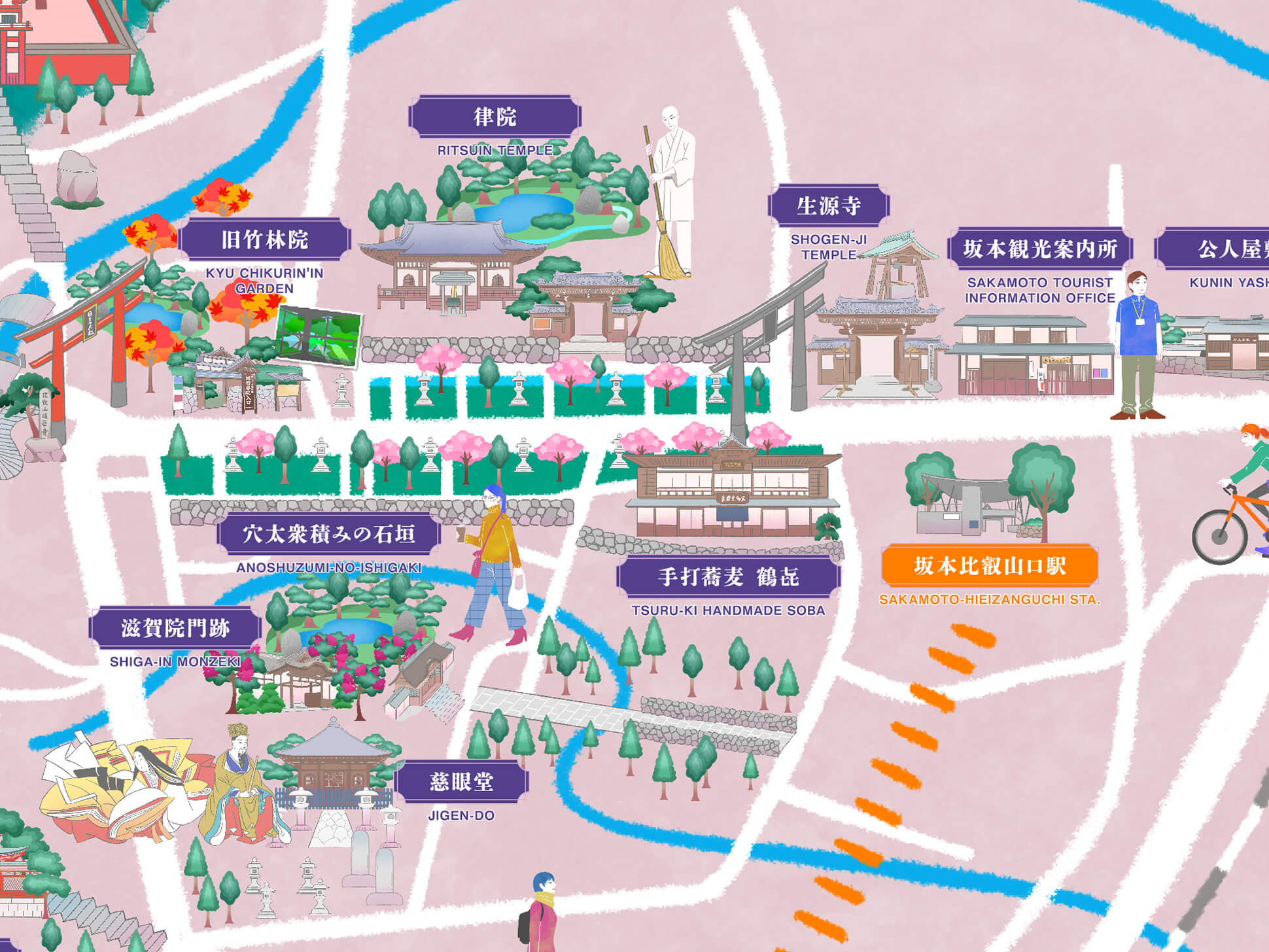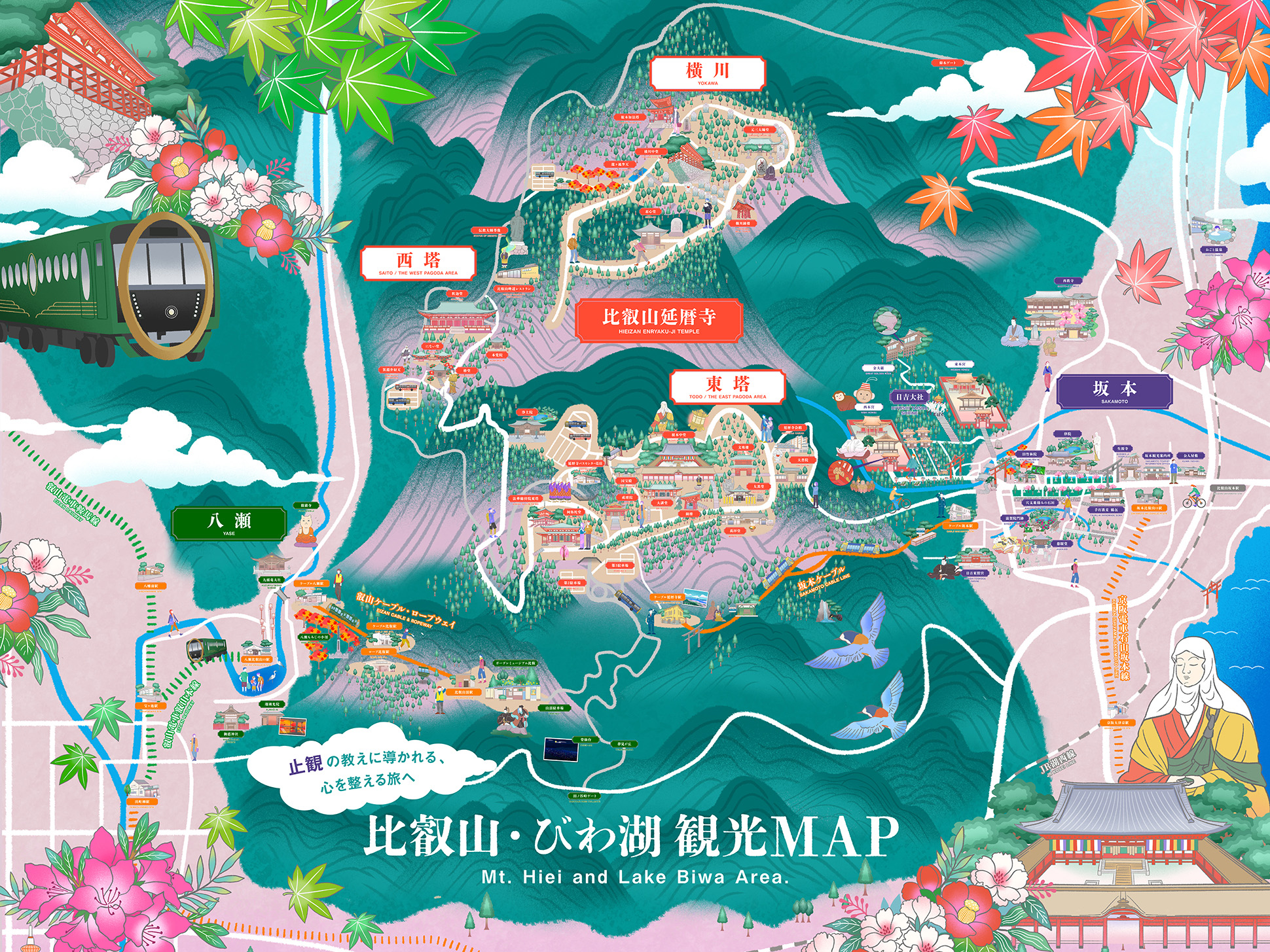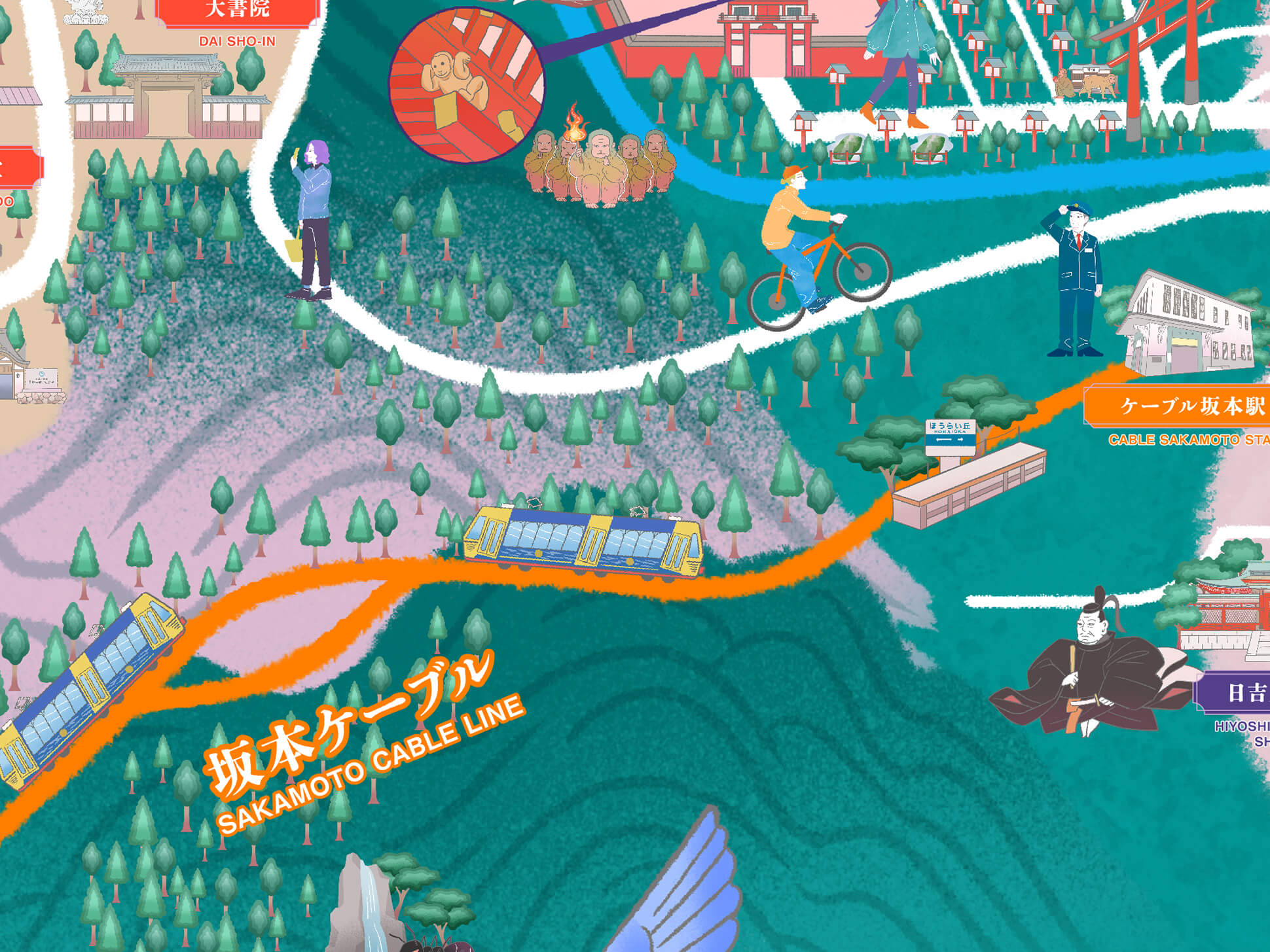 一般社団法人比叡山・びわ湖DMOさまによる観光振興プロジェクトの一環として、株式会社Strolyさまよりご依頼を受け、比叡山およびびわ湖周辺エリアの回遊性向上を目的としたデジタルイラストマップのアートディレクション・デザインを担当しました。