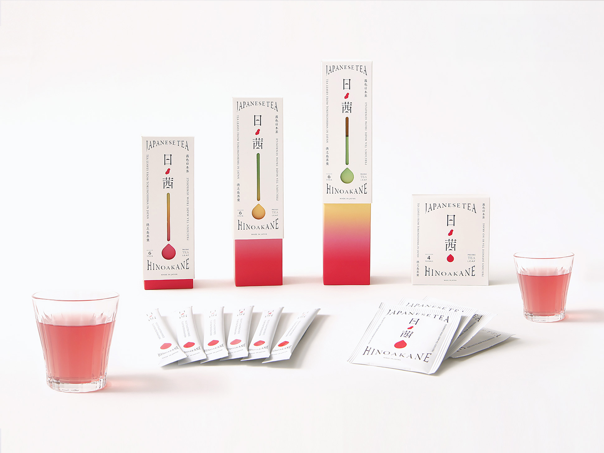 日本の赤いお茶の誕生を象徴する名前として、「日ノ茜(HINO AKANE)」と名付けました。サンルージュが持つ、緑から赤へと移ろう神秘的な色の変化。その美しさを、徳之島の夕焼けの海と島の緑に重ね、繊細なグラデーションで表現しました。 外箱には、お茶の雫と日の丸を掛け合わせたスリット形状を採用。箱を引き上げると景色がスライドし、夕景のように色が移ろいます。飲む前から体験が始まる構造設計です。 ブランド名に含まれる「ノ」の文字には、産地・徳之島の造形を重ねました。純日本産の希少な茶葉であることを、ネーミングとビジュアルの両面から訴求しています。 素材にはノーコート紙を使用し、過度な装飾を排した誠実な質感に仕上げました。日本の赤を世界へ届けるための、ストーリー性と体験価値を備えたパッケージデザインです。