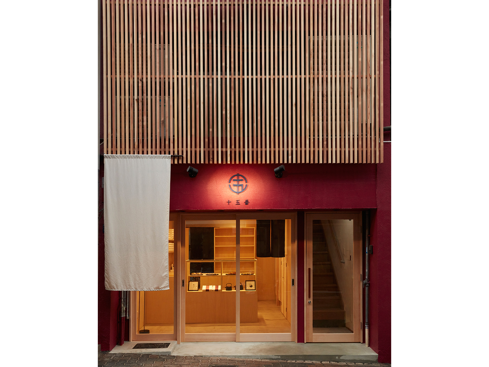 空堀店では、ブランドのキーカラーであるエンジ色と木のルーバーを組み合わせたツートン構成を採用。通りに対して印象的な存在感を放ちながらも、日本らしい品格を感じられる世界観を表現しました。