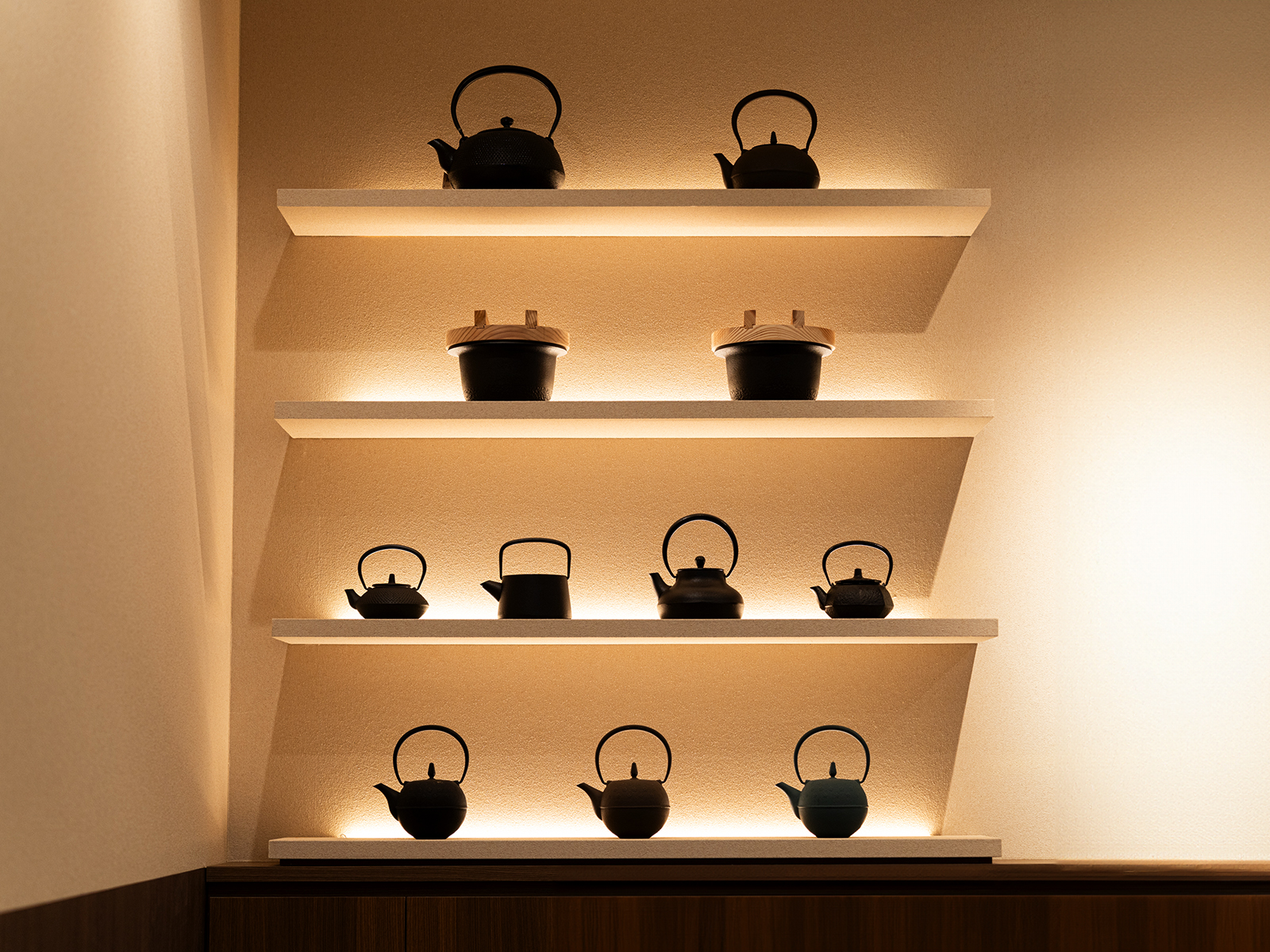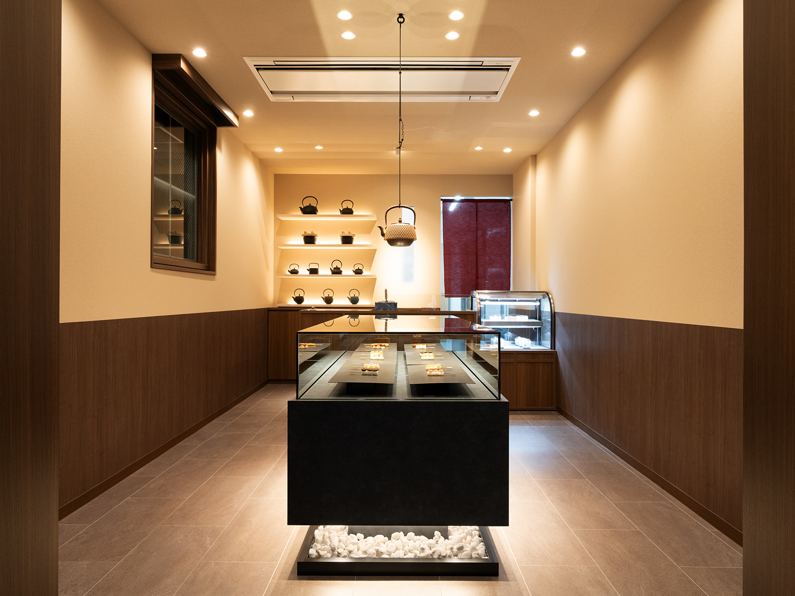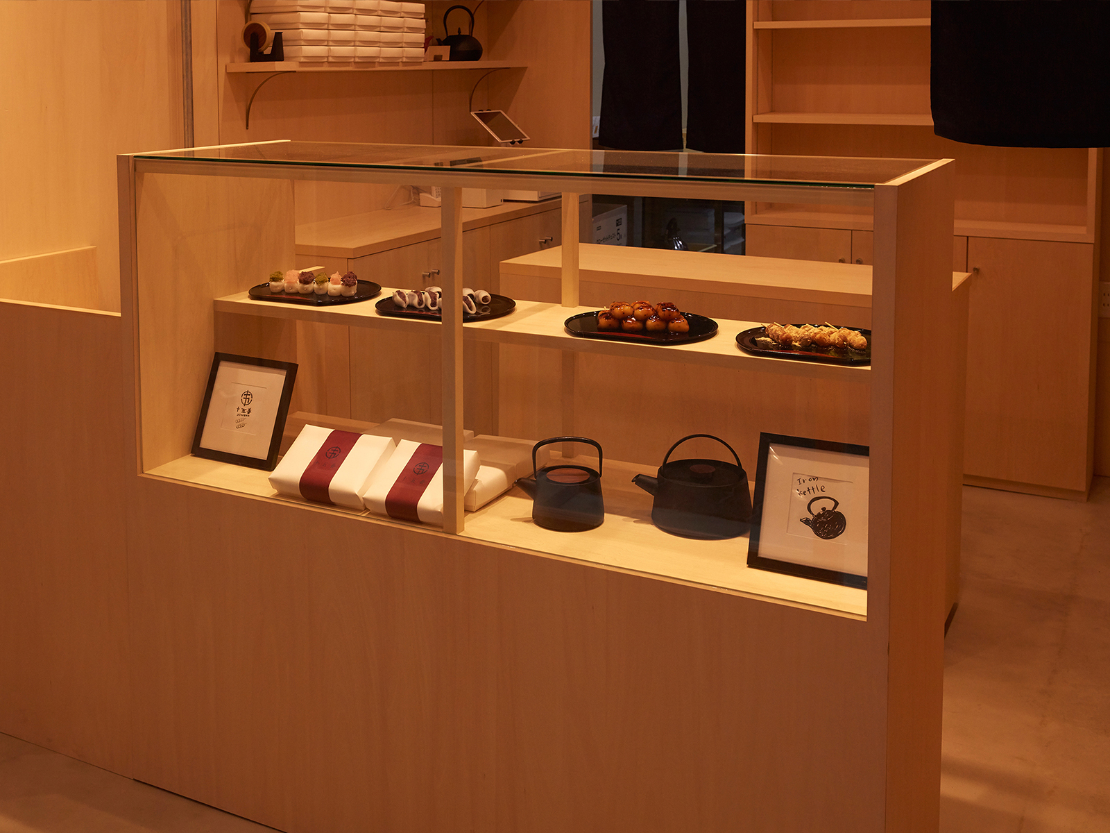 心斎橋筋商店街と御堂筋という対照的な通りに挟まれた立地に誕生した新店舗の空間設計を担当しました。若年層からインバウンド、富裕層まで幅広い来訪者が行き交うこの地において、誰もが心をほどき、日本のこころを五感で感じられる空間を目指しています。ショーケースには重厚感のあるモルタル素材を用い、宙に浮かぶ塊のような造形に。通りからの視認性を高めつつ、丁寧に並ぶ団子や照明に照らされた南部鉄器の美しさが際立つ構成としました。空間全体は、檜の木目や玉砂利、漆喰調の壁材など、日本らしい素材感で統一。敷瓦調タイルで足元にリズムを与え、凛とした清らかさと落ち着きを演出しています。また、池永鉄工の本業である“鉄”の要素をディスプレイ台や南部鉄器の展示に取り入れ、ブランドの背景にあるものづくりの精神を空間に反映しました。