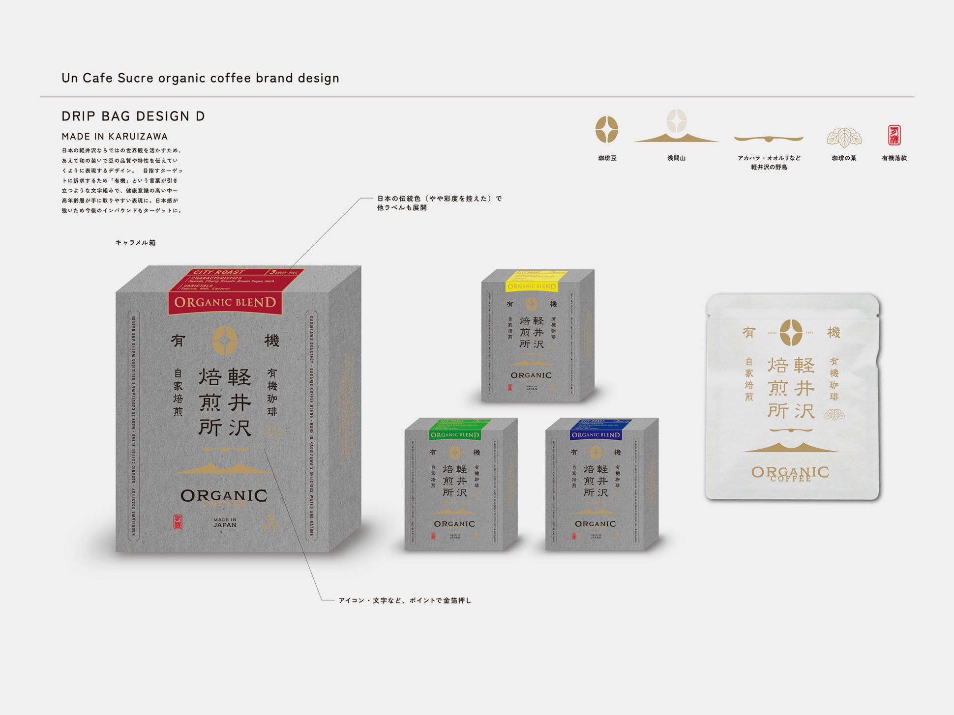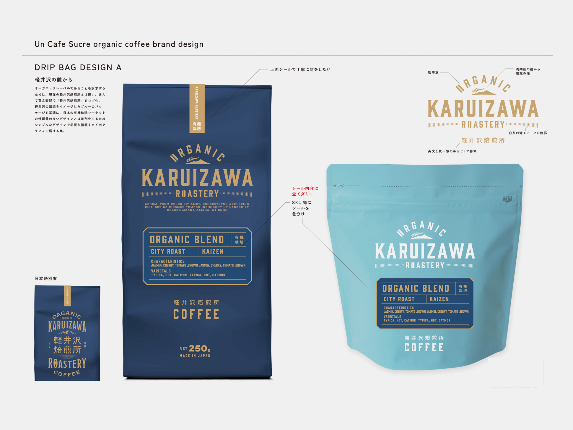 「軽井沢焙煎所」を、オーガニック珈琲の魅力を丁寧に伝えるブランドとして立ち上げることを目指しました。有機珈琲市場は品質への意識が高い一方で、パッケージや世界観の表現においては、情報が多く少し複雑に感じられる商品も少なくありません。そこで本企画では、デザインの力によって、珈琲そのものの良さや背景がより伝わる在り方を探っています。ブランドの軸に据えたのは、「軽井沢 × オーガニック」という組み合わせです。軽井沢という地名が持つ、自然の豊かさや清らかさ、上質で落ち着いた印象と、オーガニック珈琲の価値観はとても相性が良く、この二つをシンプルに掛け合わせることで、日本の有機珈琲市場の中でも、やさしく印象に残るブランド像を描こうとしました。デザインでは、あえて英文表記で「KARUIZAWA ROASTERY」を用いる案や、日本らしさを大切にした和の表現など、いくつかの方向性を検討しました。