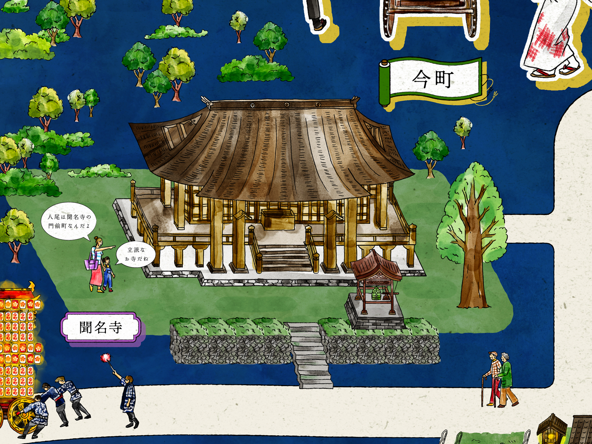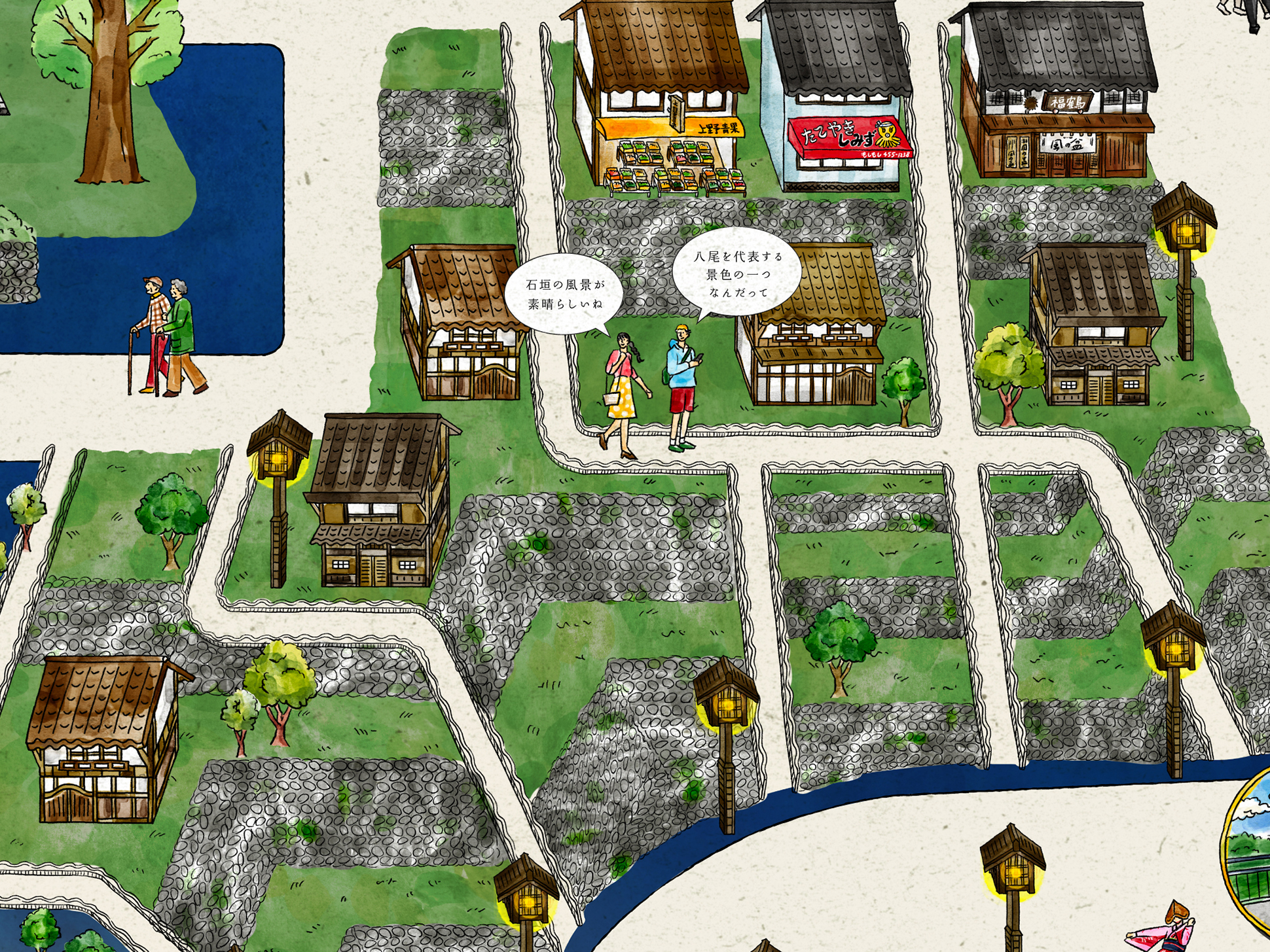 また、マップ内には観光客や地元の人々をイラストとして登場させ、それぞれが吹き出しで八尾の魅力を語る構成を取り入れています。