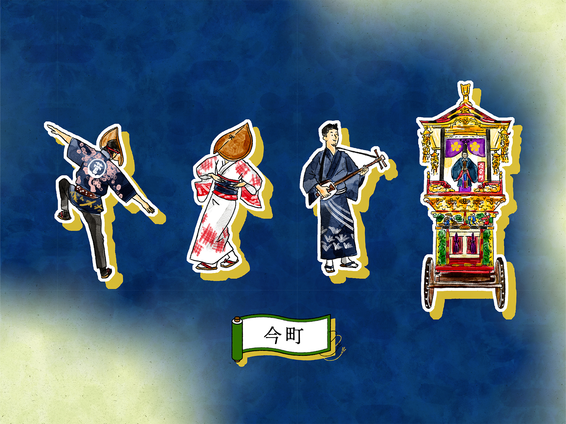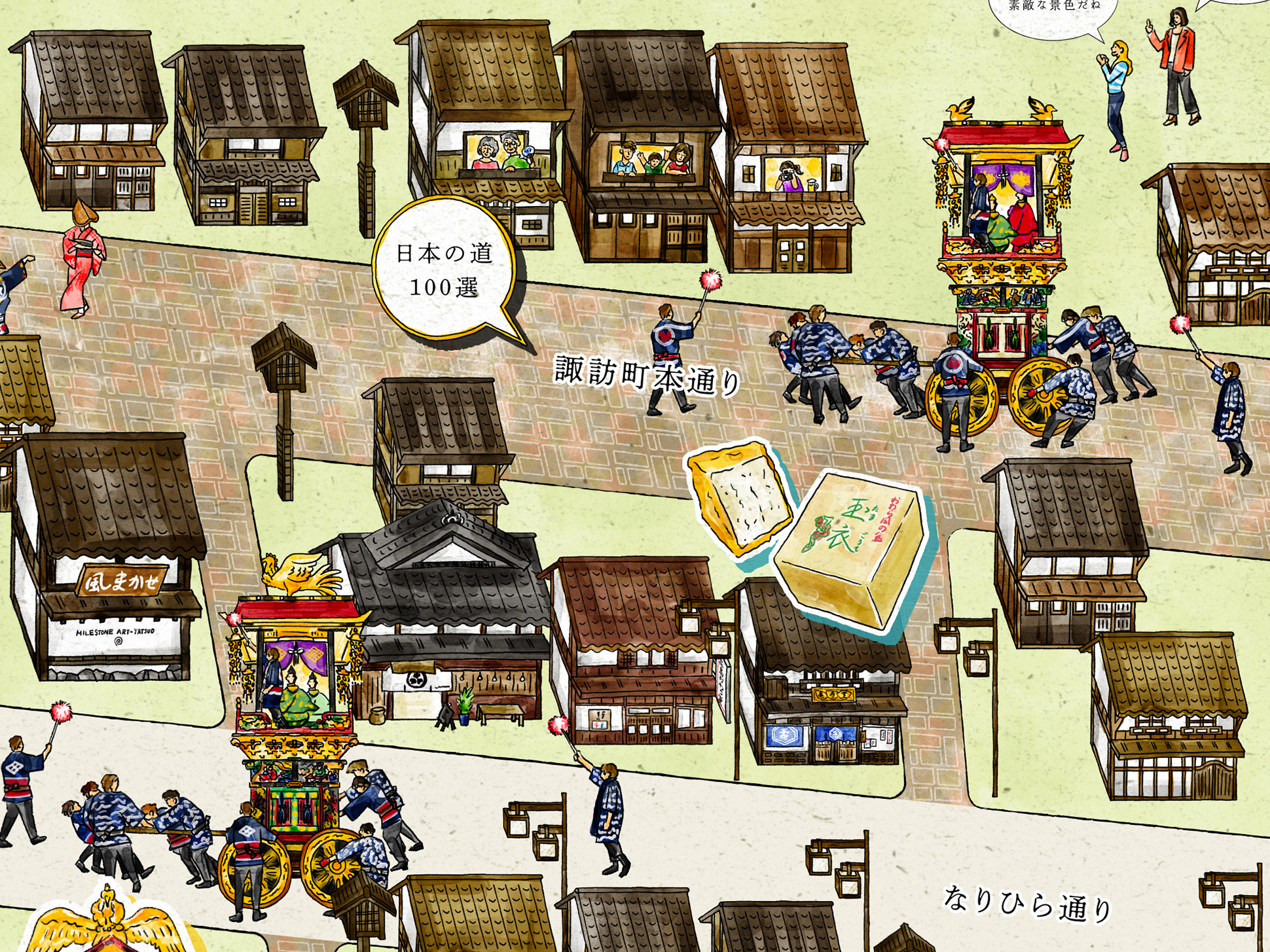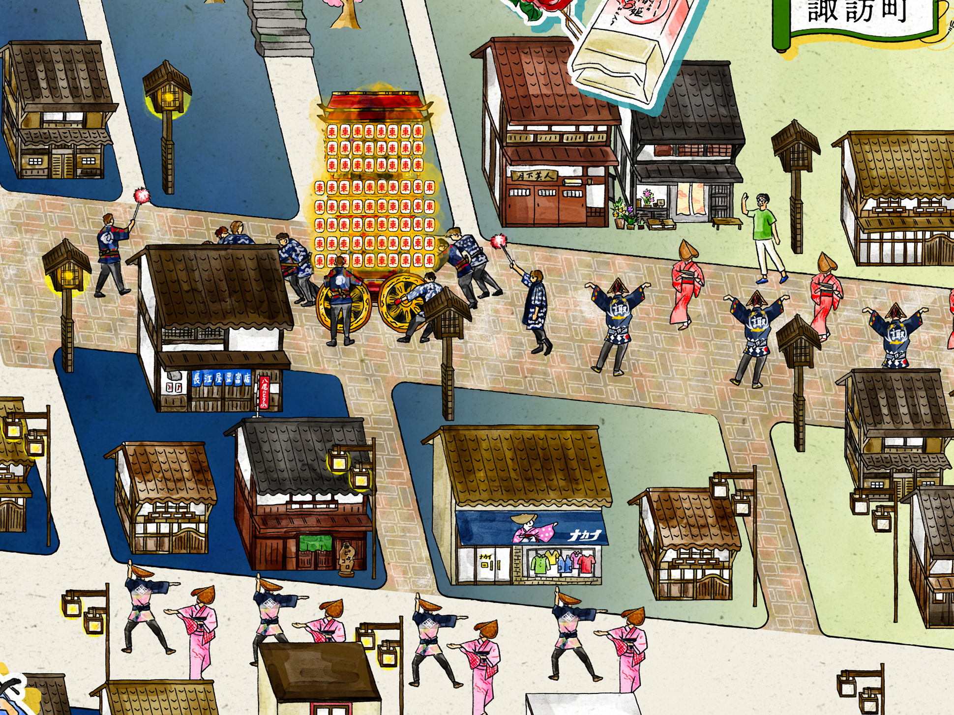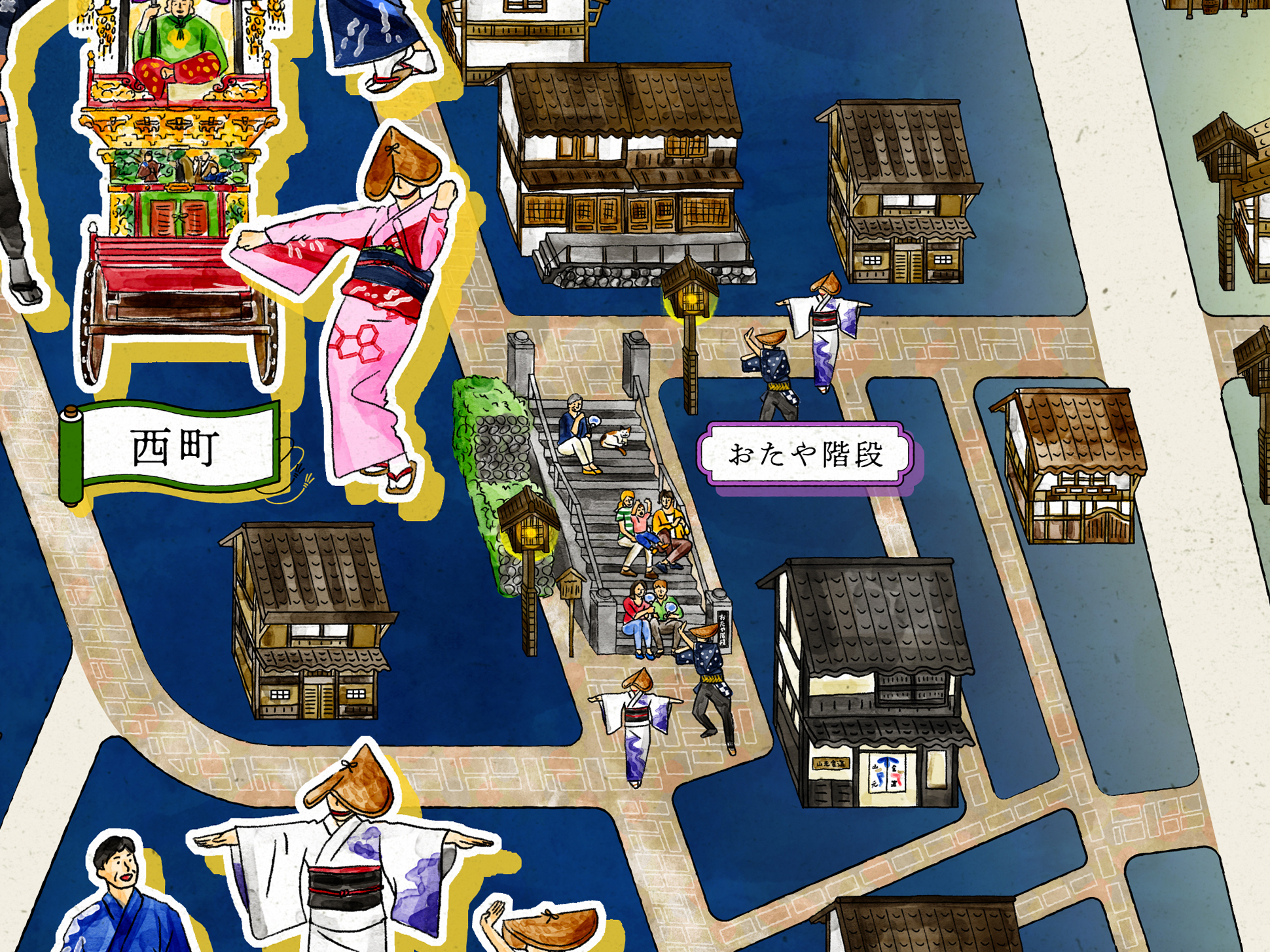 石畳の道や町家の佇まい、踊り手の所作を丁寧に描くことで、単なる地図ではなく、風景そのものを感じられるビジュアルへと昇華しています。