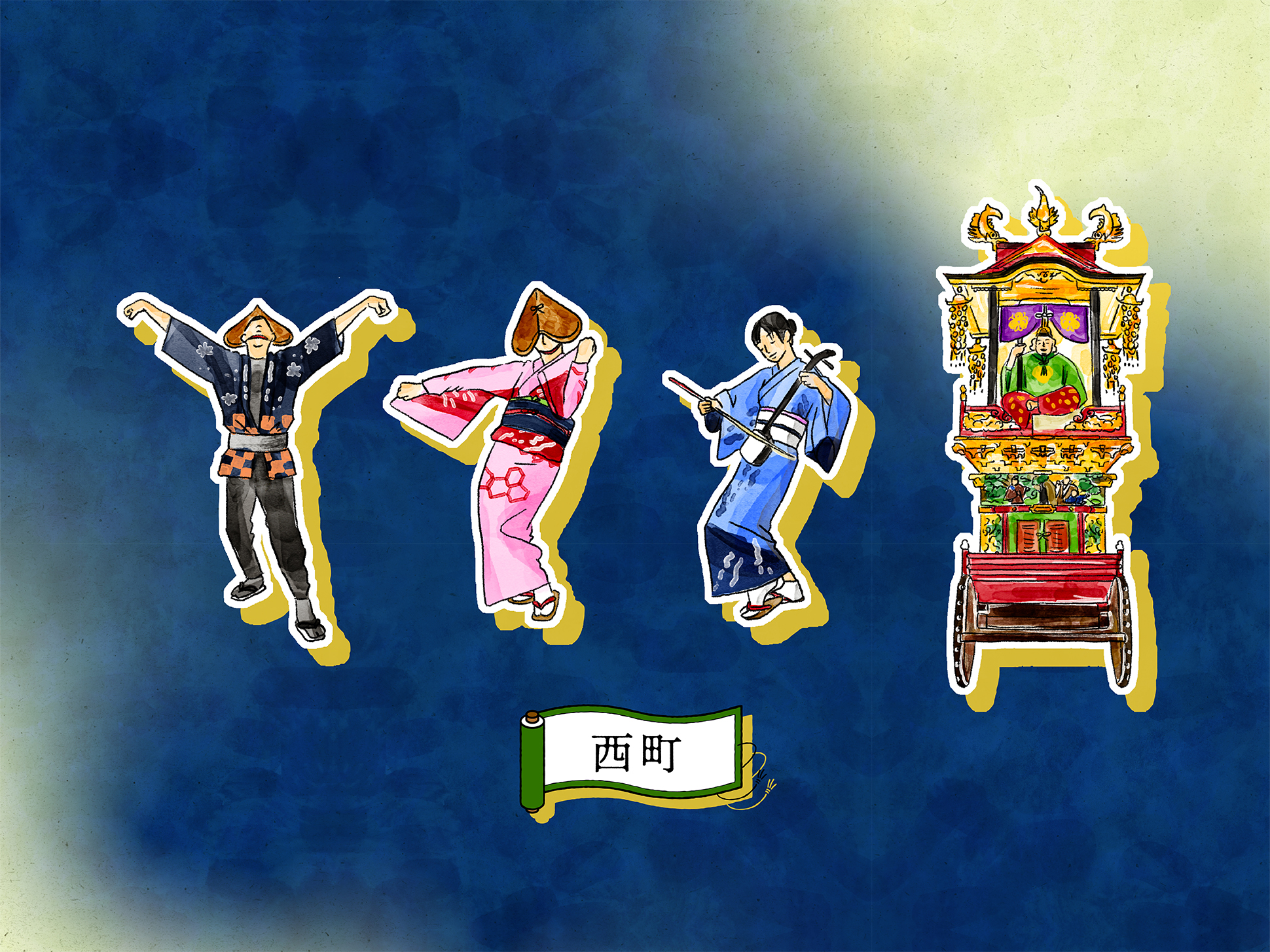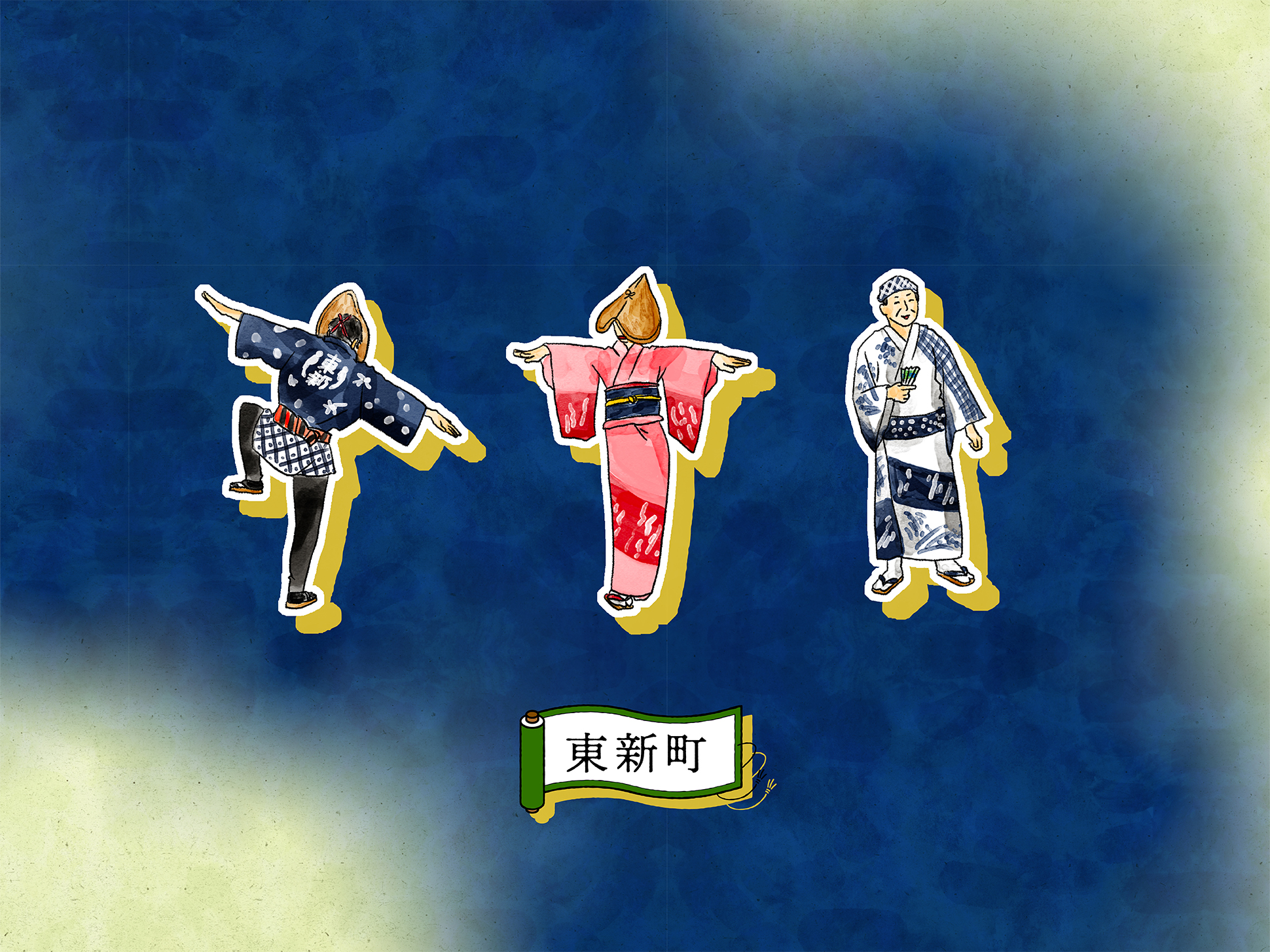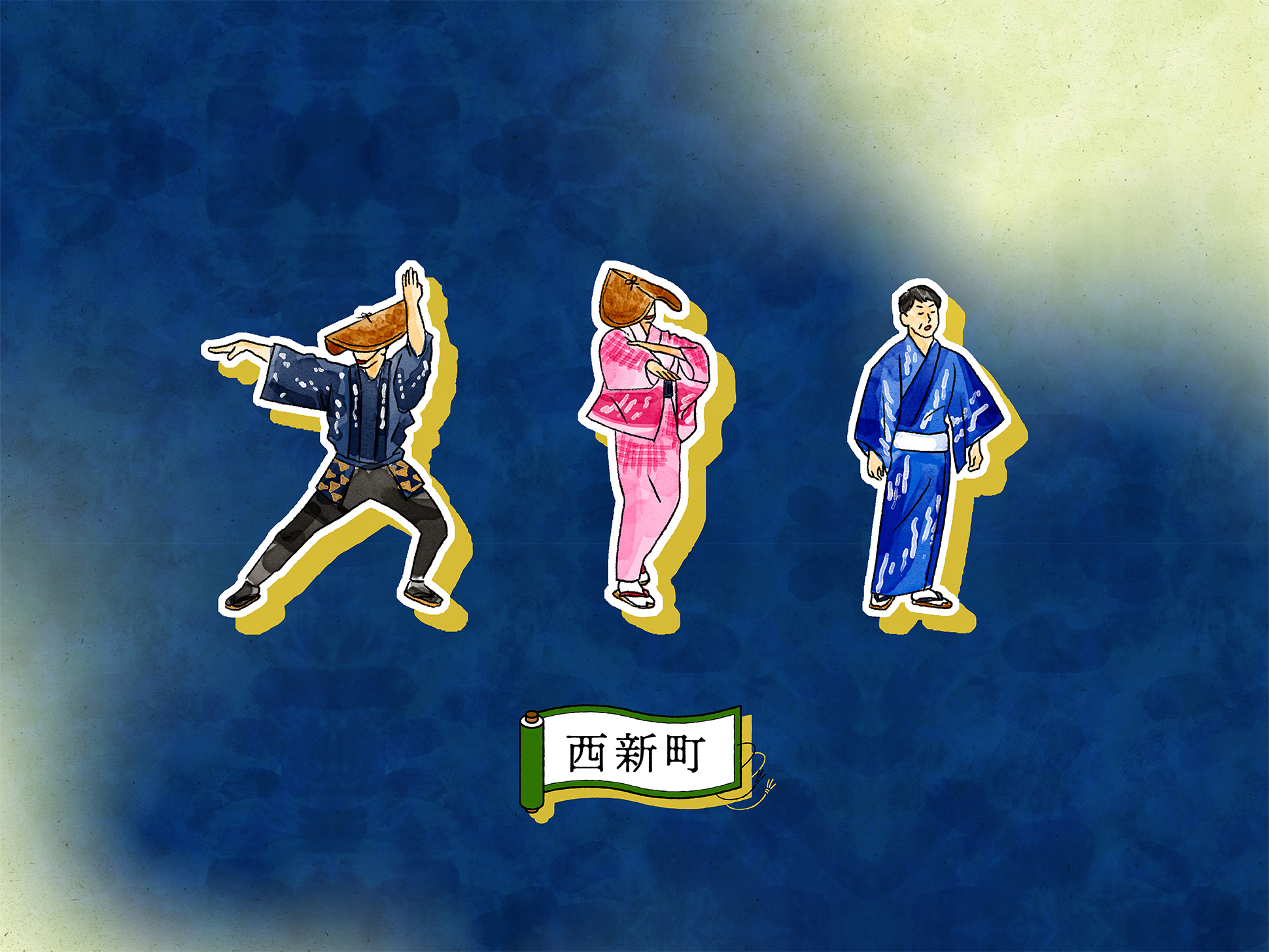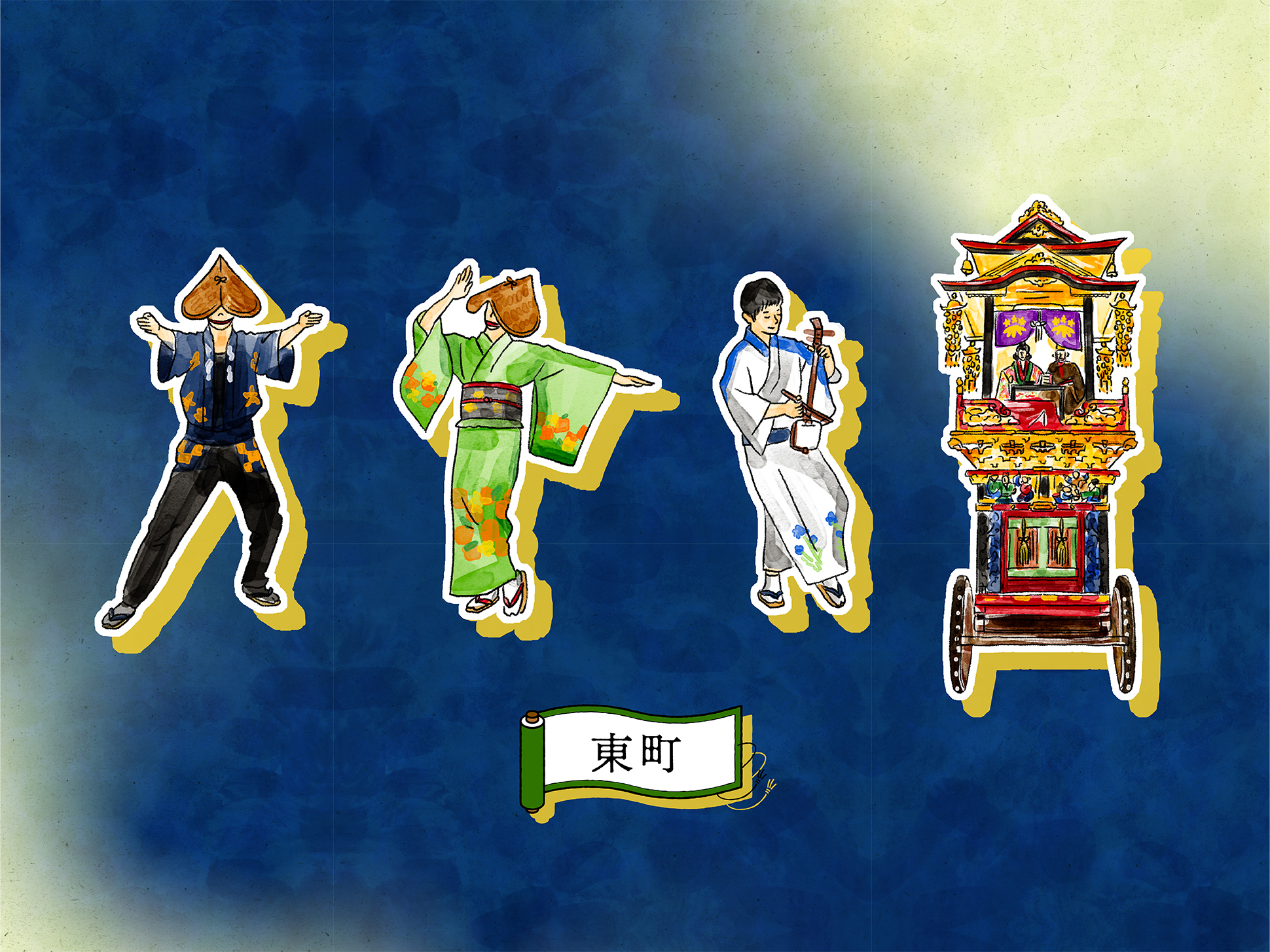 石畳の道や町家の佇まい、踊り手の所作を丁寧に描くことで、単なる地図ではなく、風景そのものを感じられるビジュアルへと昇華しています。