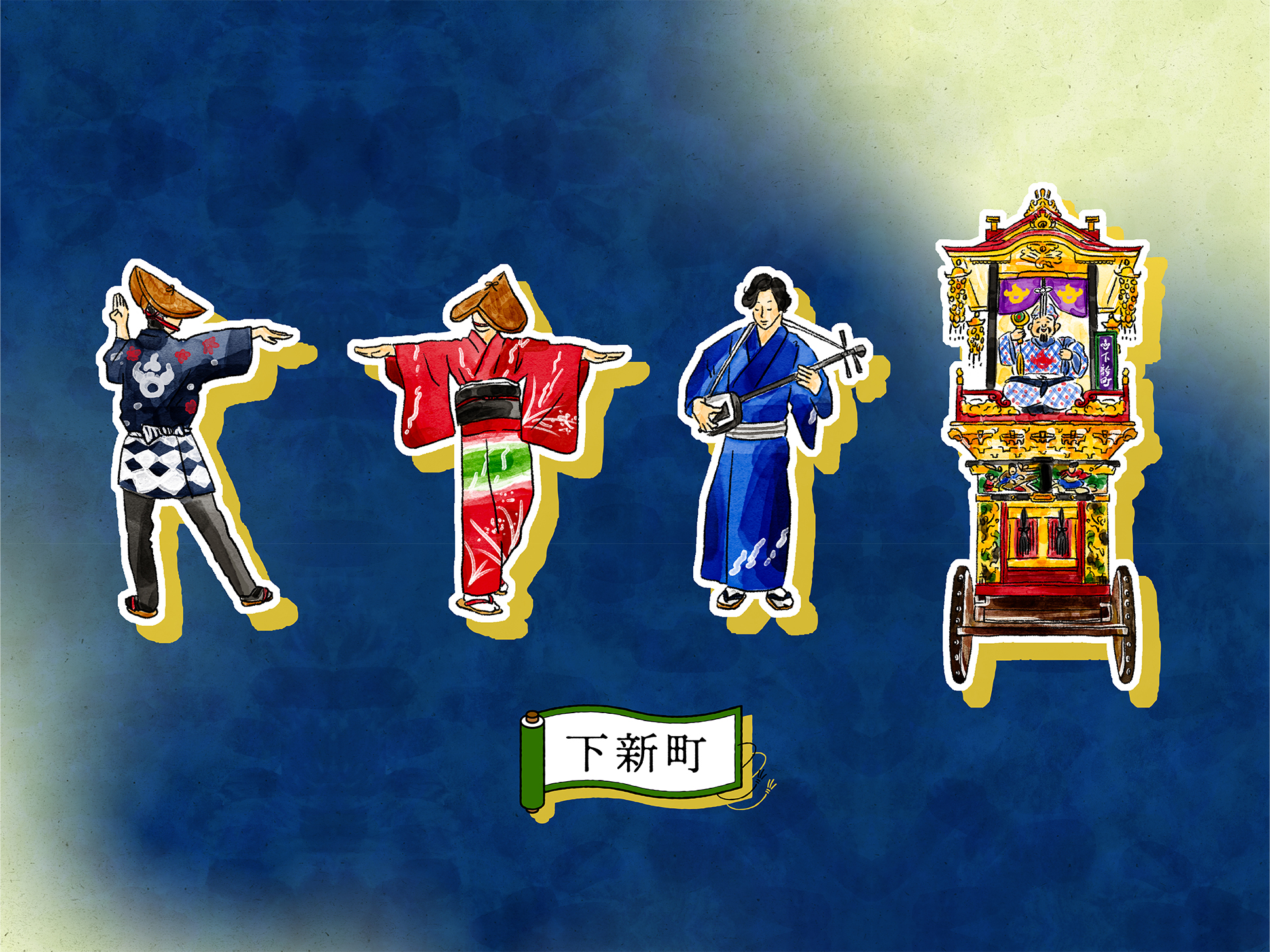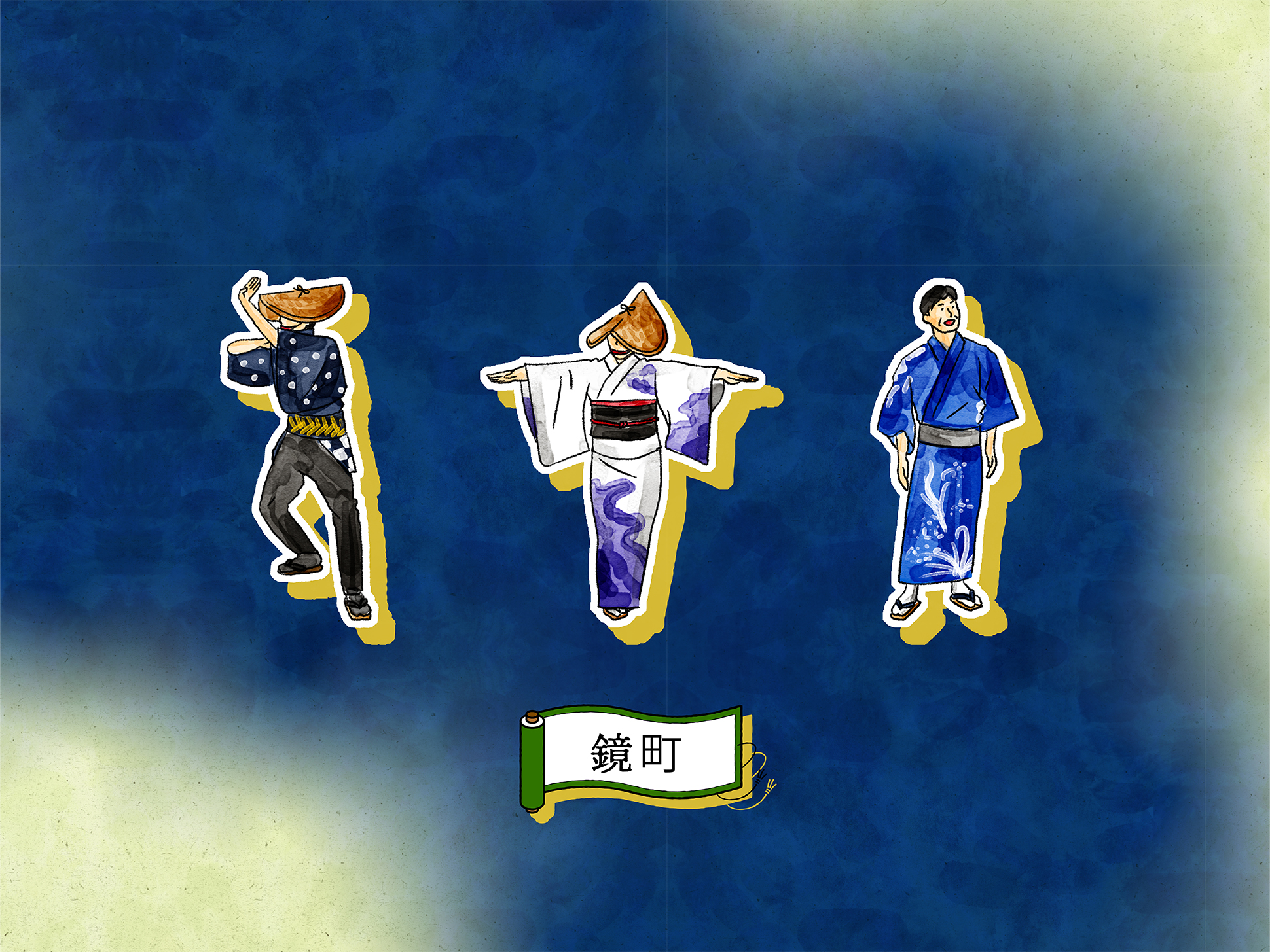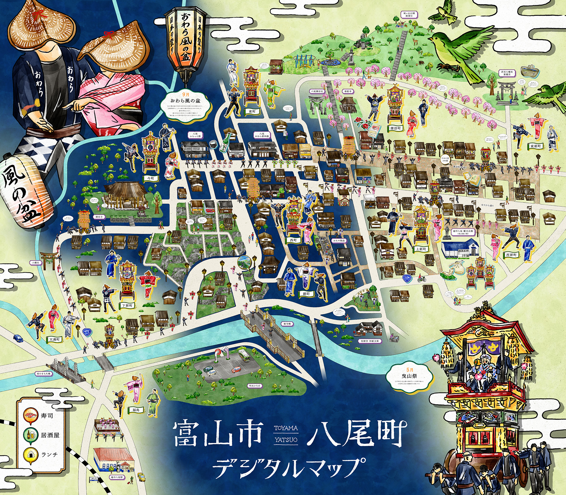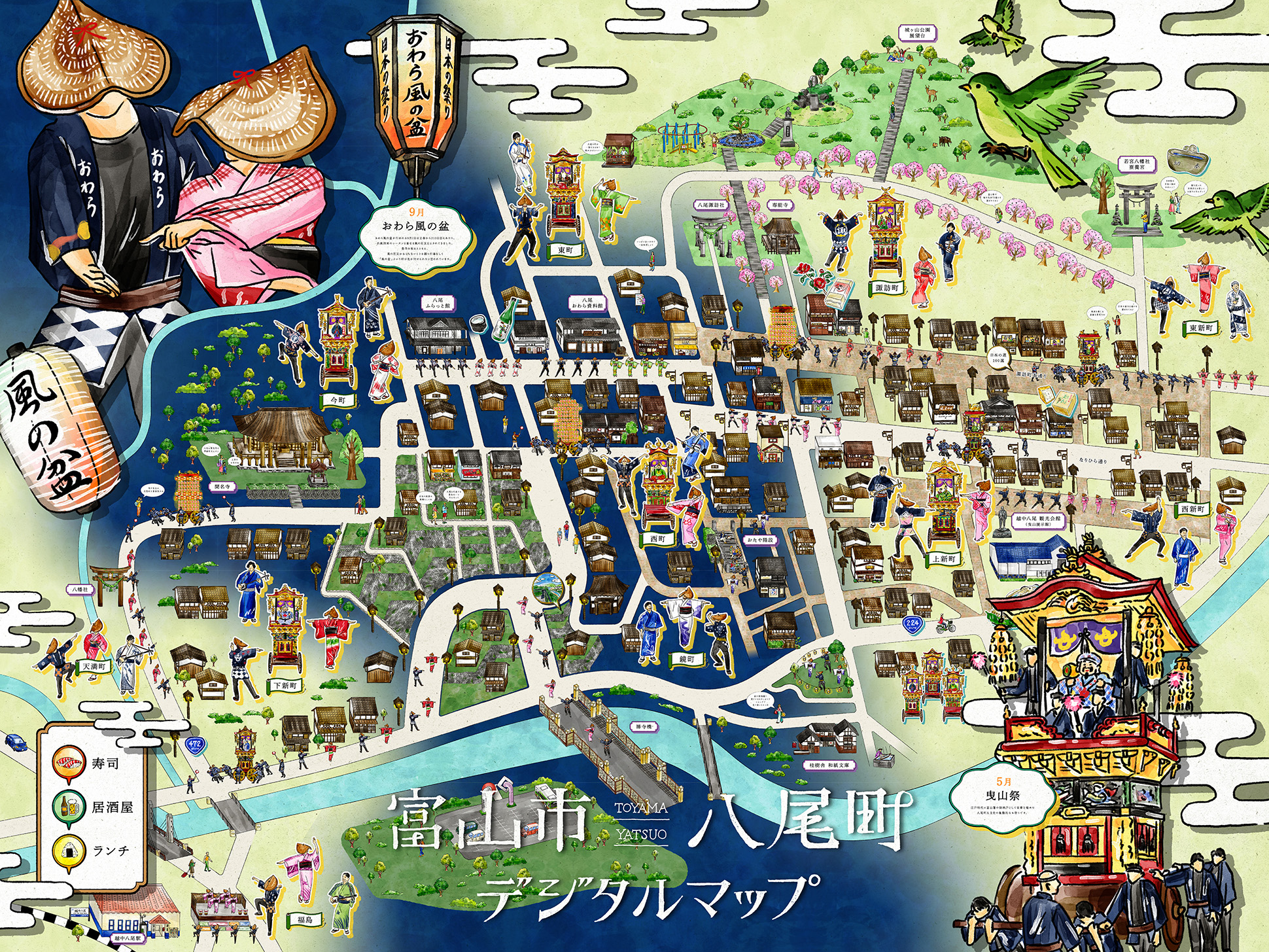石畳の道や町家の佇まい、踊り手の所作を丁寧に描くことで、単なる地図ではなく、風景そのものを感じられるビジュアルへと昇華しています。
