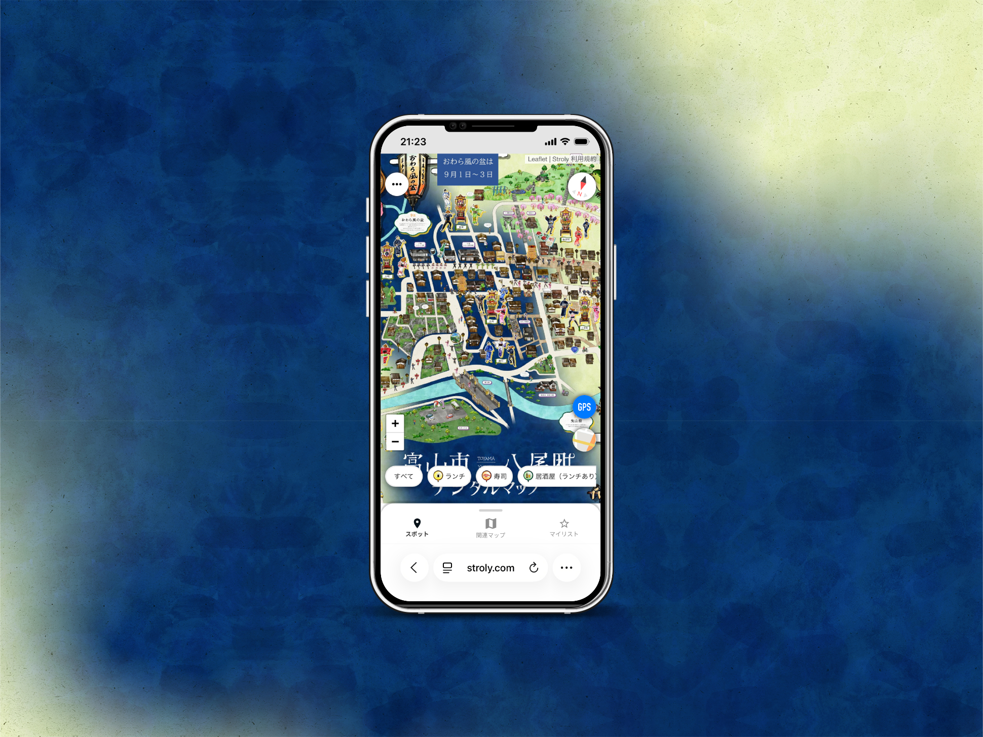 石畳の美しい町並みと、毎年9月1日〜3日に開催される民謡行事「おわら風の盆」で知られる八尾町。その情緒的な風景と文化を、スマートフォン上で体験できるデジタルマップとして再構築しています。