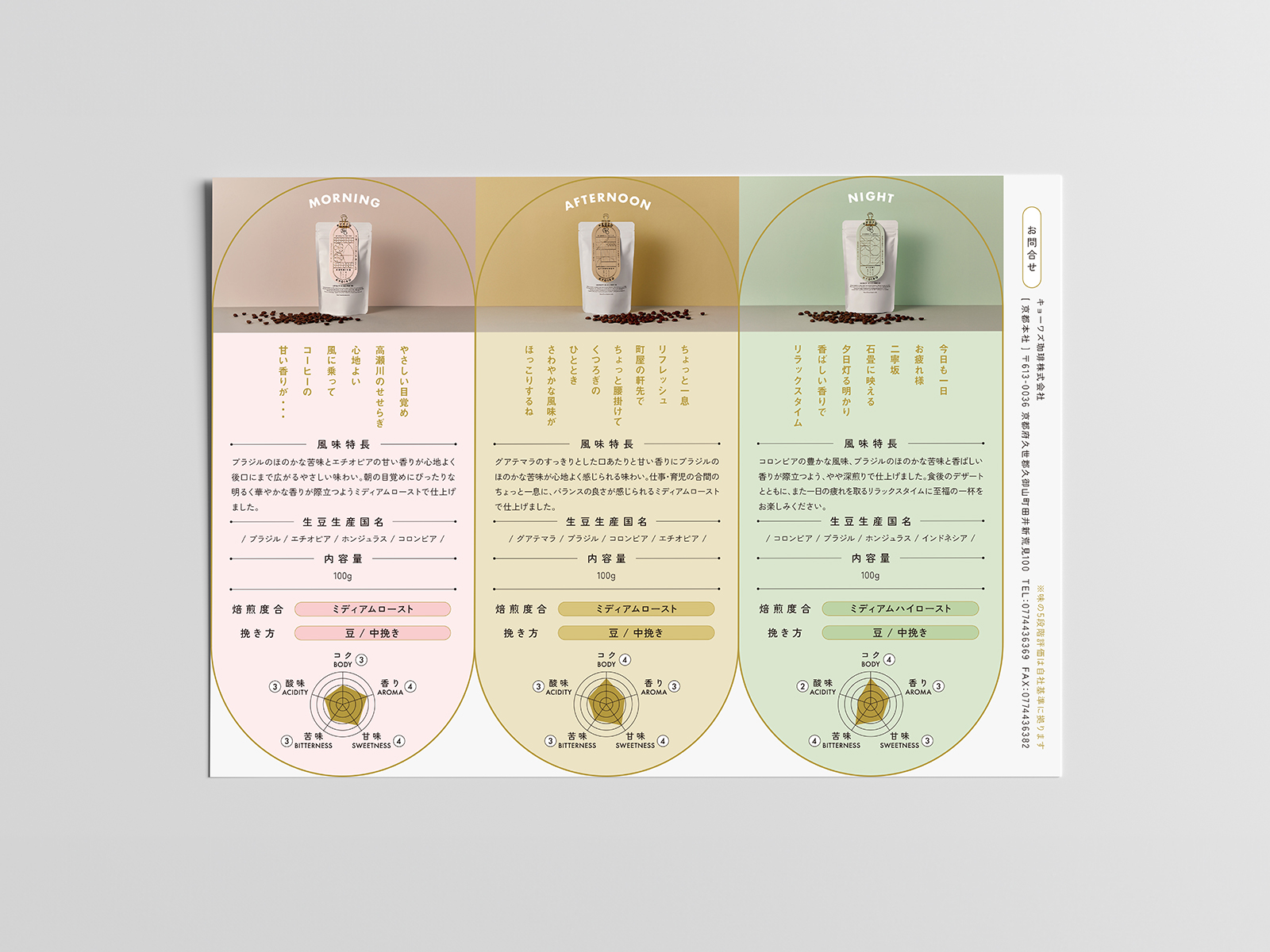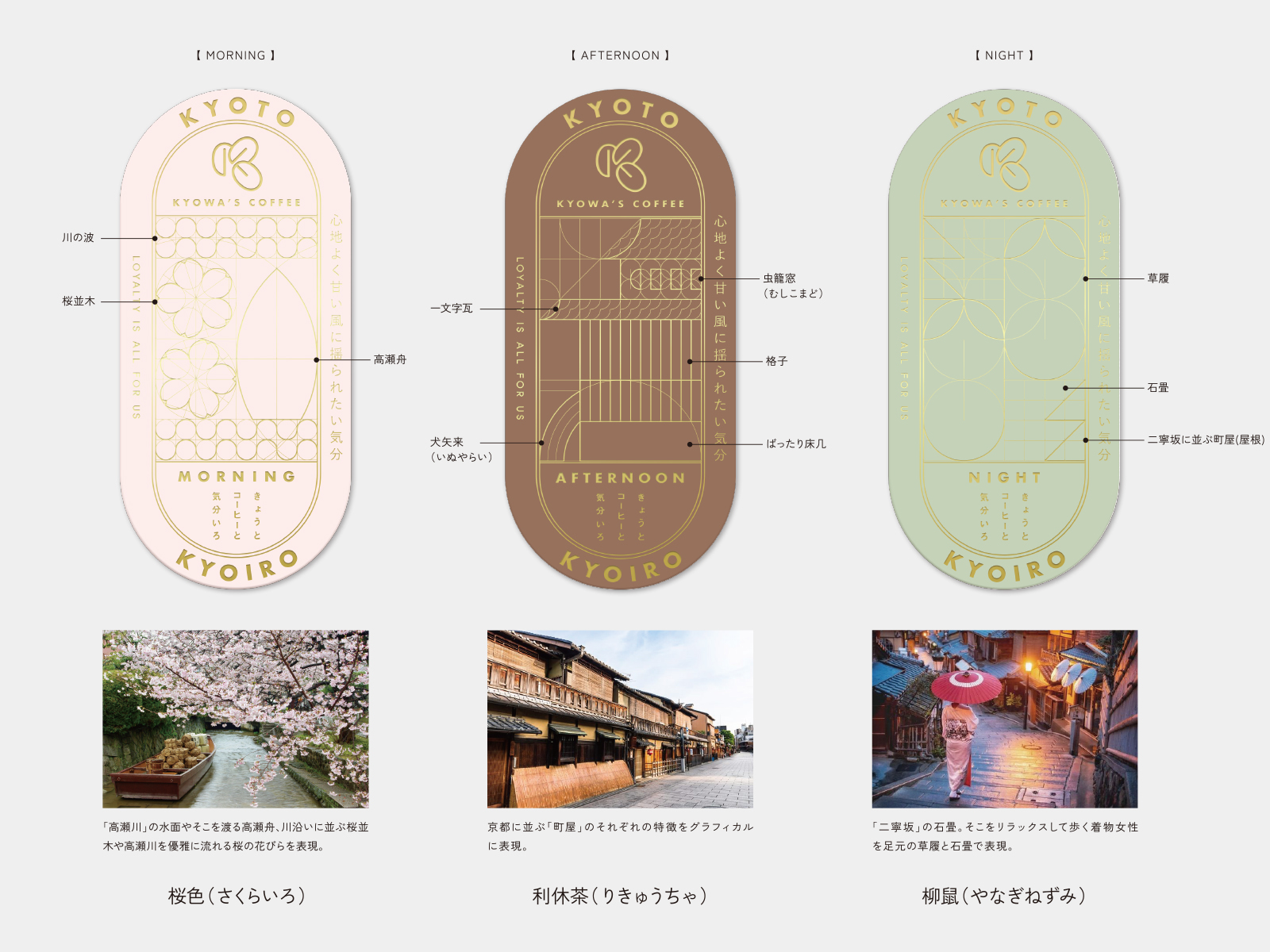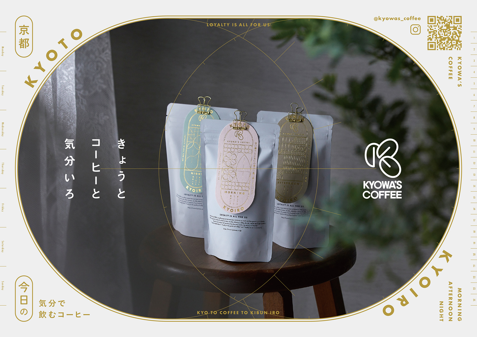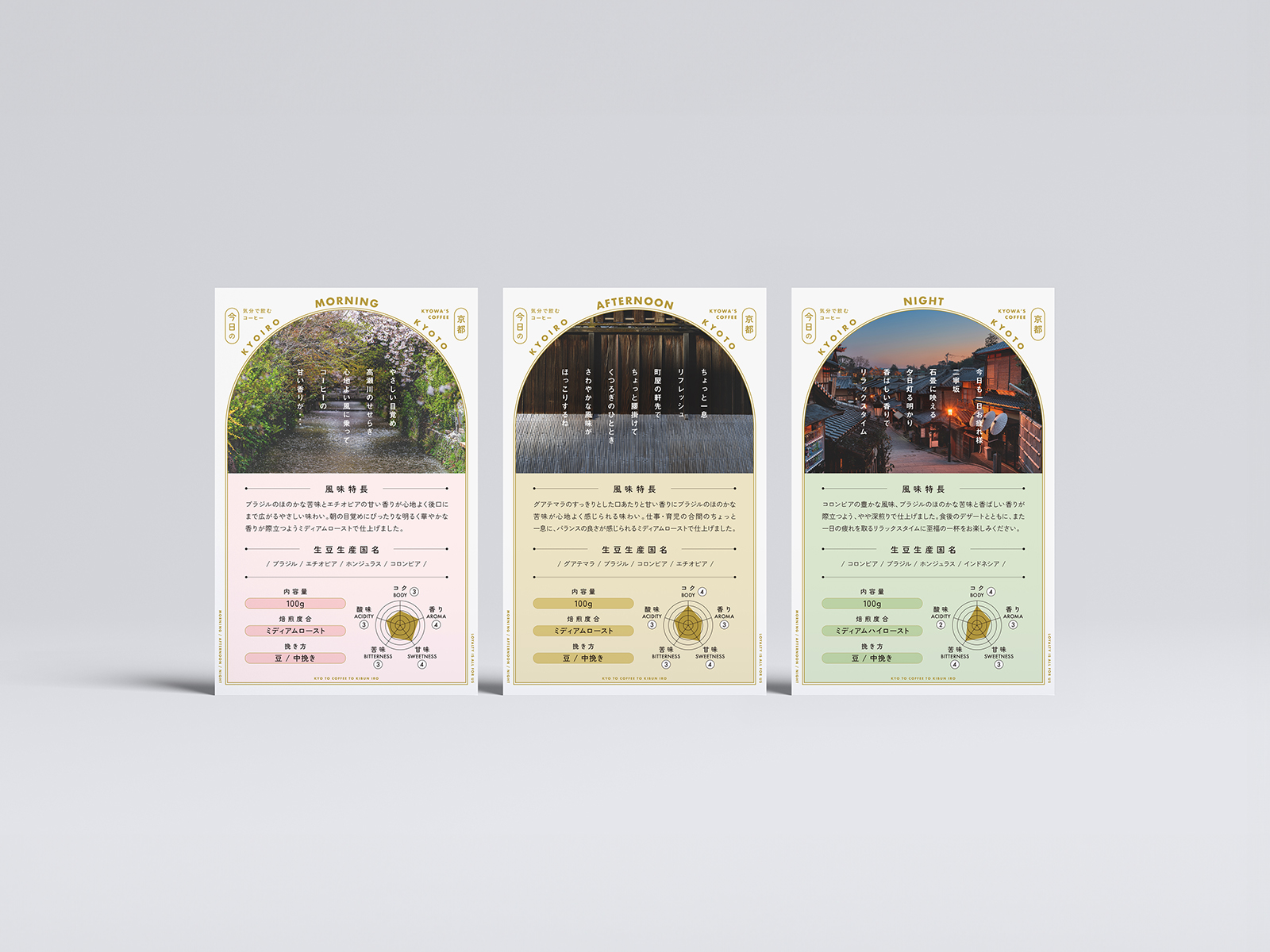 珈琲鑑定士が在籍するキョーワズ珈琲さまが提案する、“今日の気分で飲む珈琲”。朝・昼・夜、それぞれの時間帯に合わせて、京都の名所を想起させる風味をブレンド・焙煎したシリーズです。