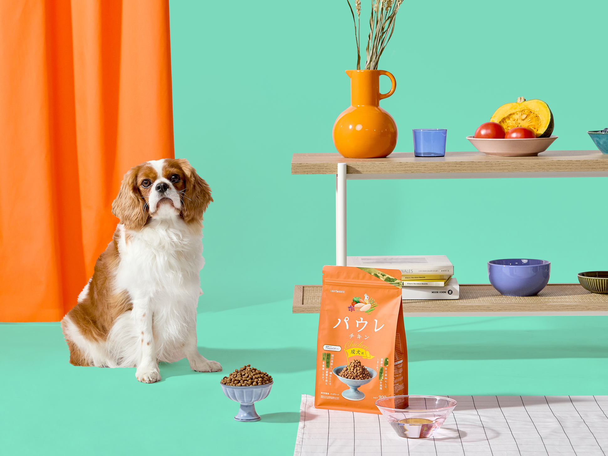 発色のいいビビッドな空間で元気にパウレを食べるワンちゃんを撮影したキービジュアルを中心に、